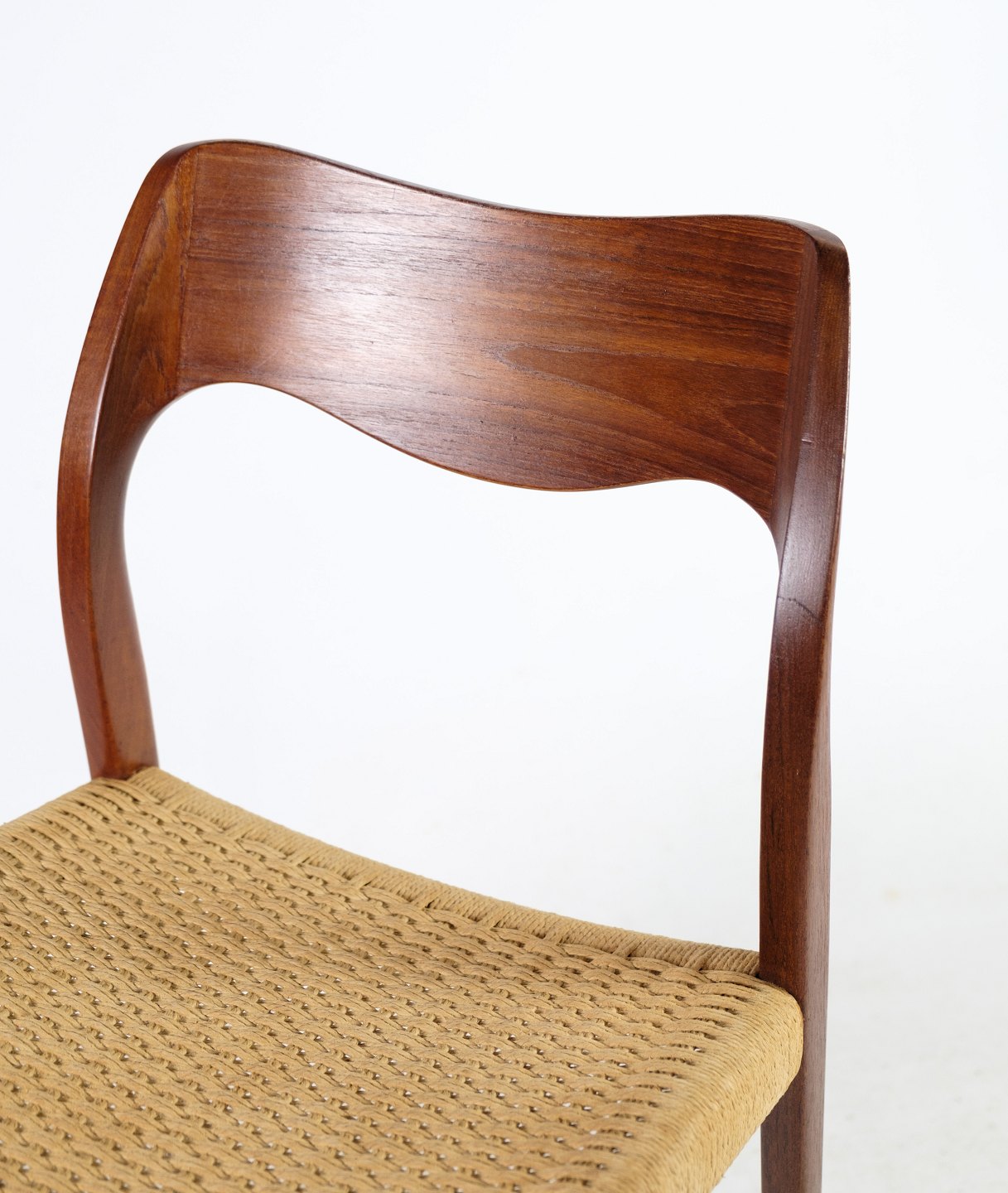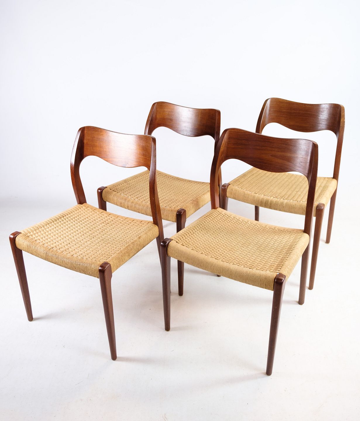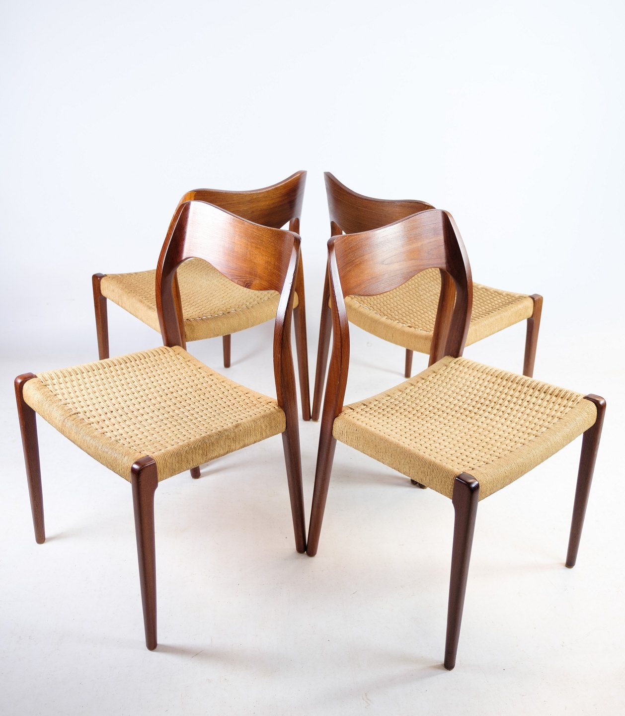 Sæt på 4 spisestuestole, model 71, designet af N.O Møller formgivet i 1951. Står med meget fint stel af teak, samt sæde af flet. Fremstillet hos J.L. Møllers Møbelfabrik.