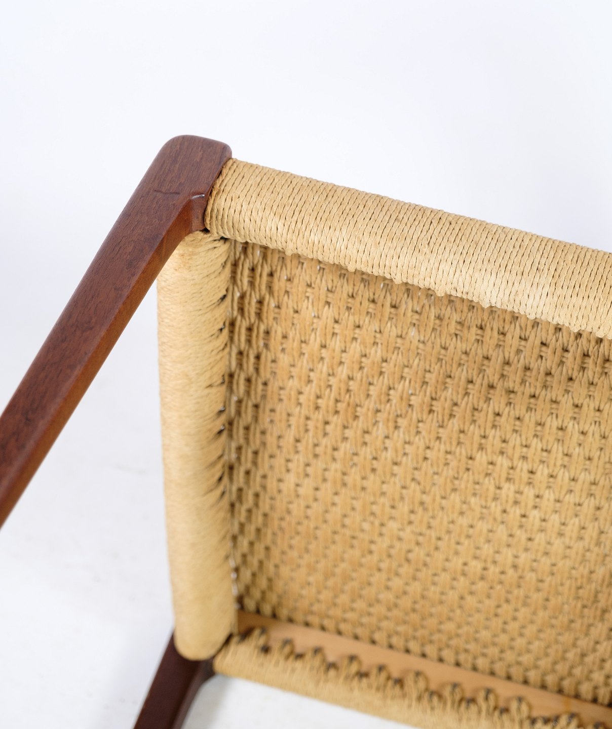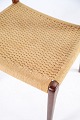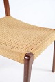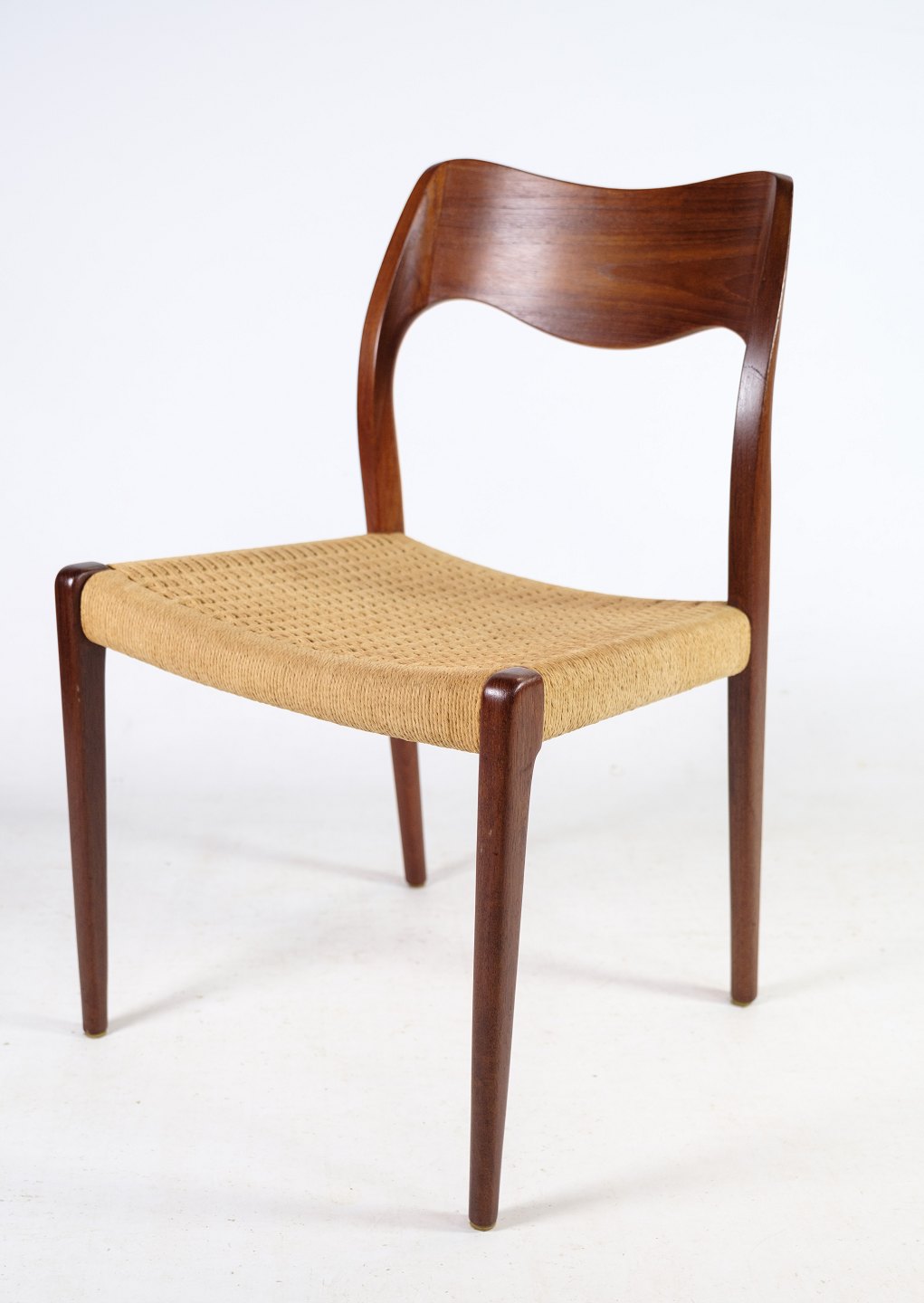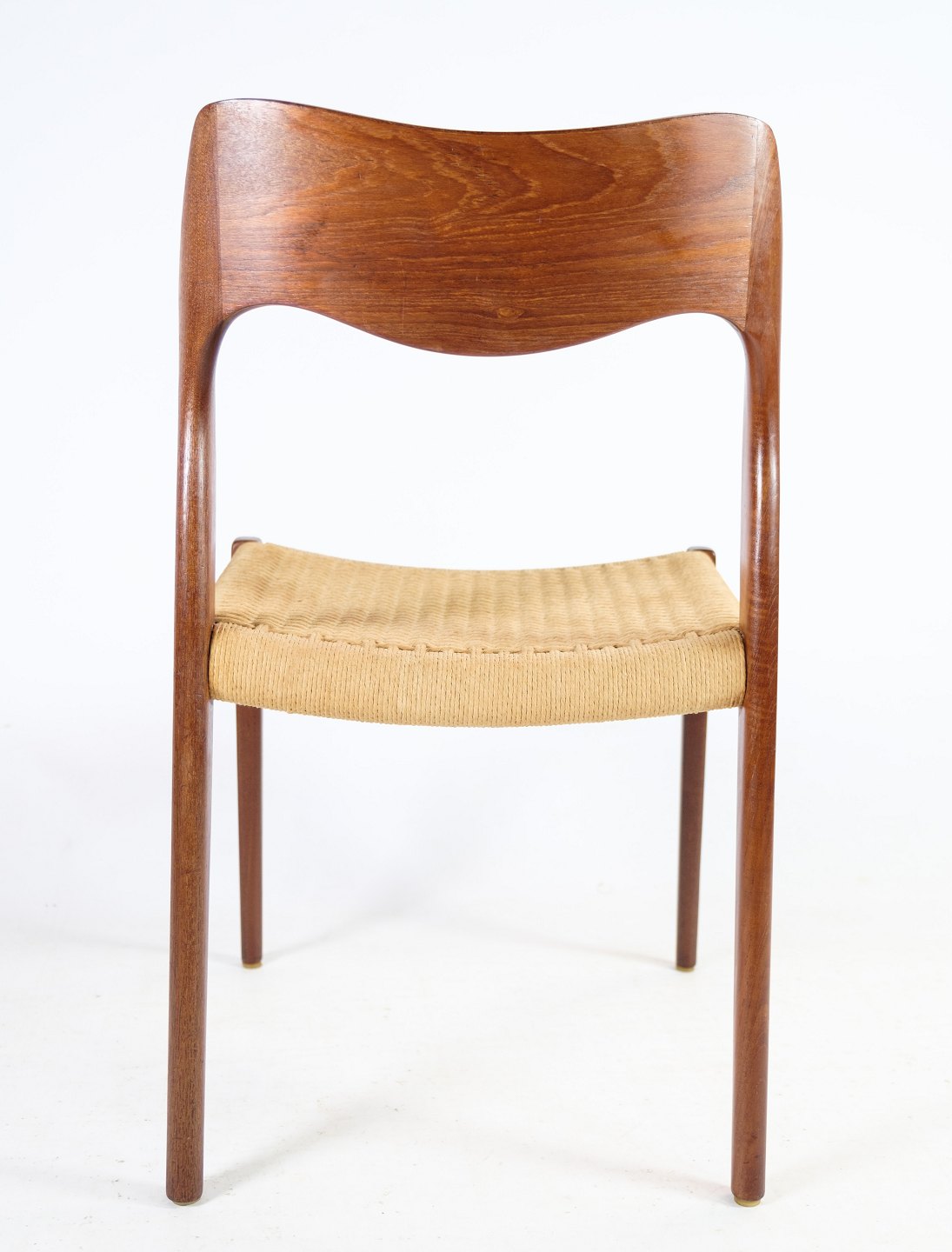 Sæt på 4 spisestuestole, model 71, designet af N.O Møller formgivet i 1951. Står med meget fint stel af teak, samt sæde af flet. Fremstillet hos J.L. Møllers Møbelfabrik.