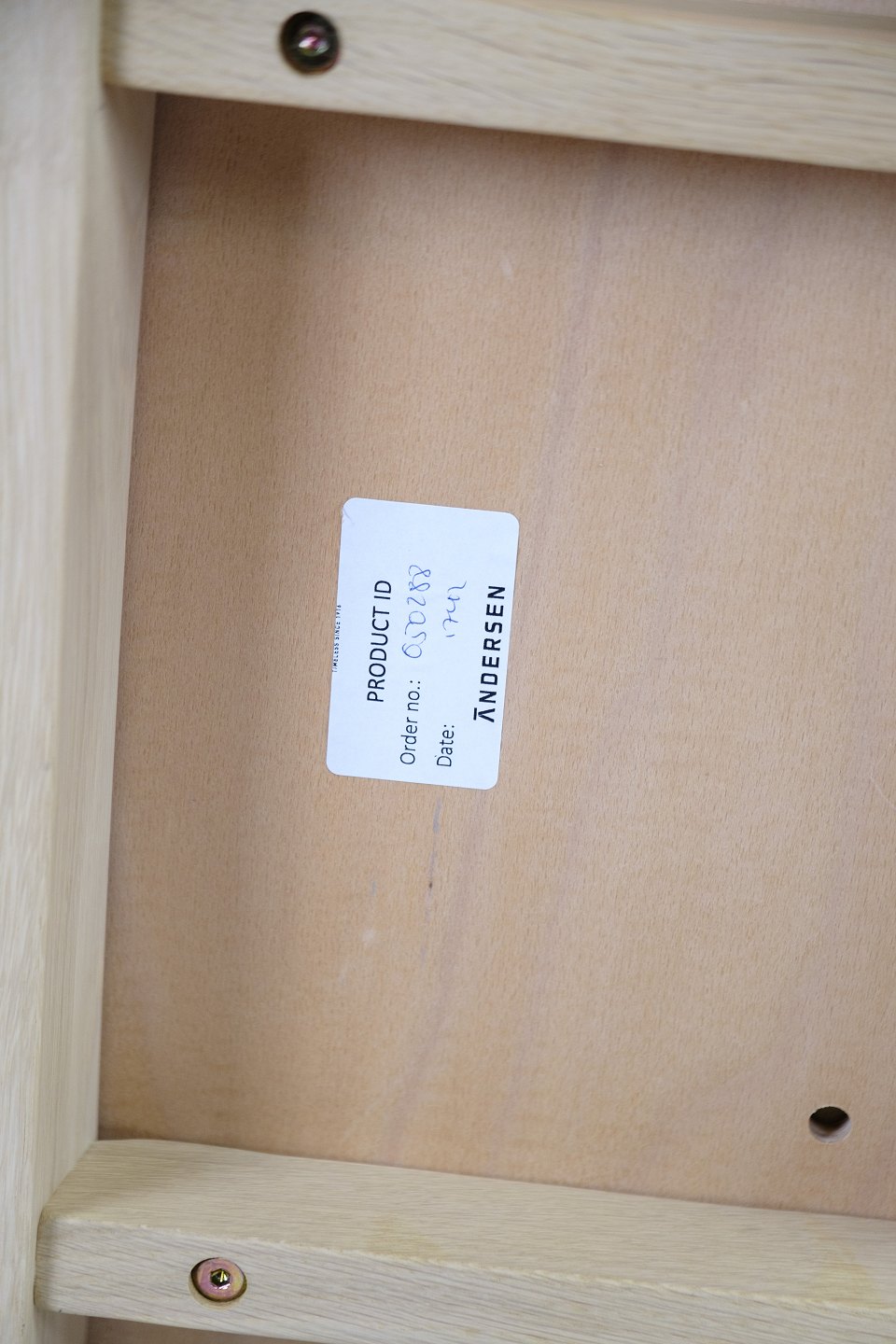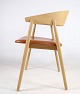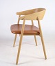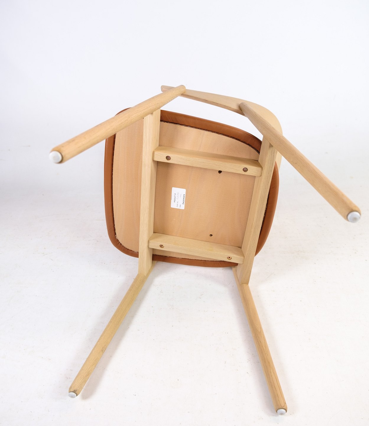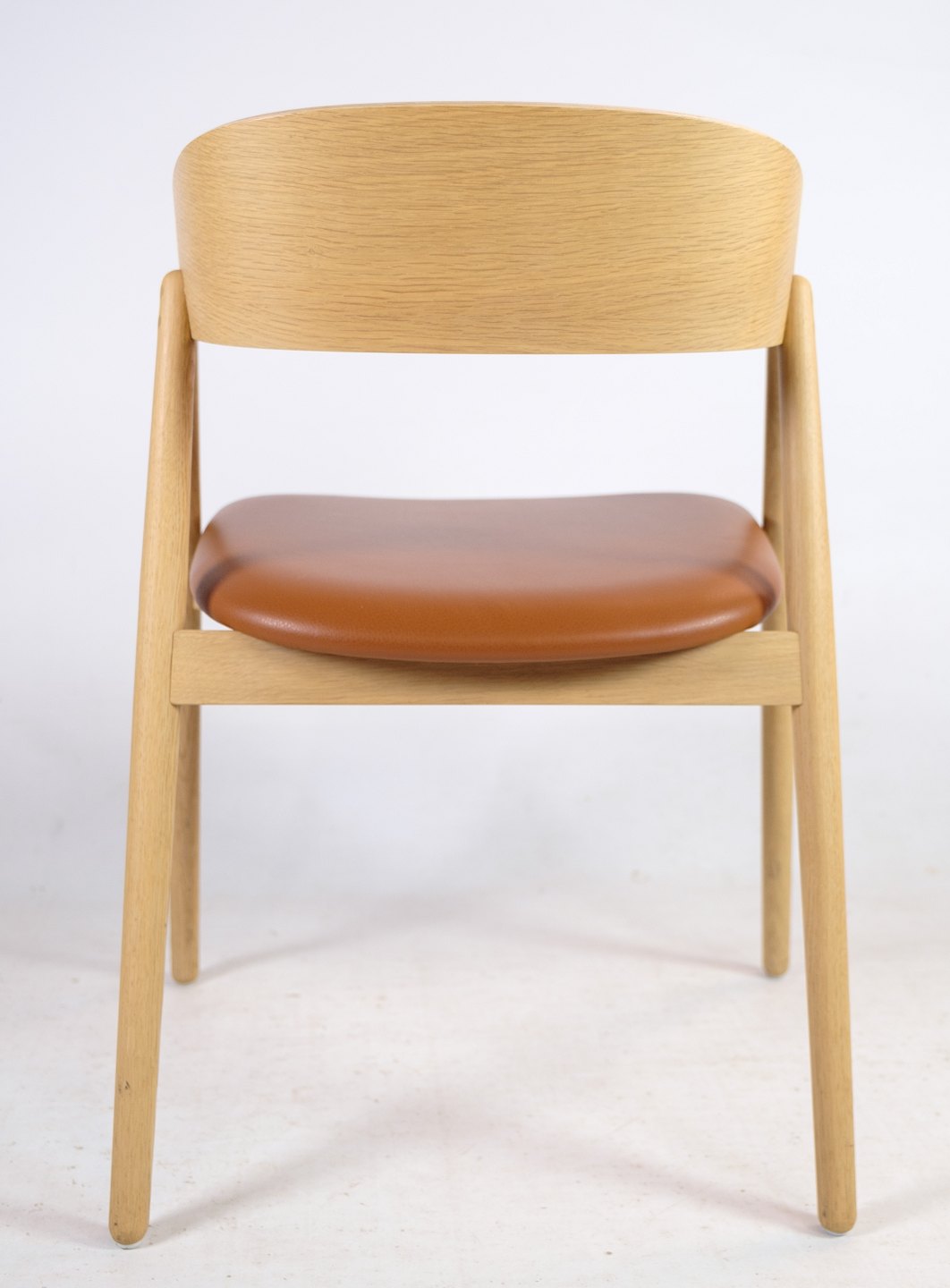 SolgtSæt af 4 spisestuestole, model AC2, af Andersen i sæbebehandlet egetræ. Står med flot betrukket sæder i cognac.