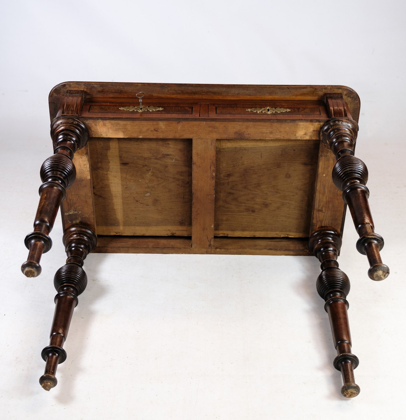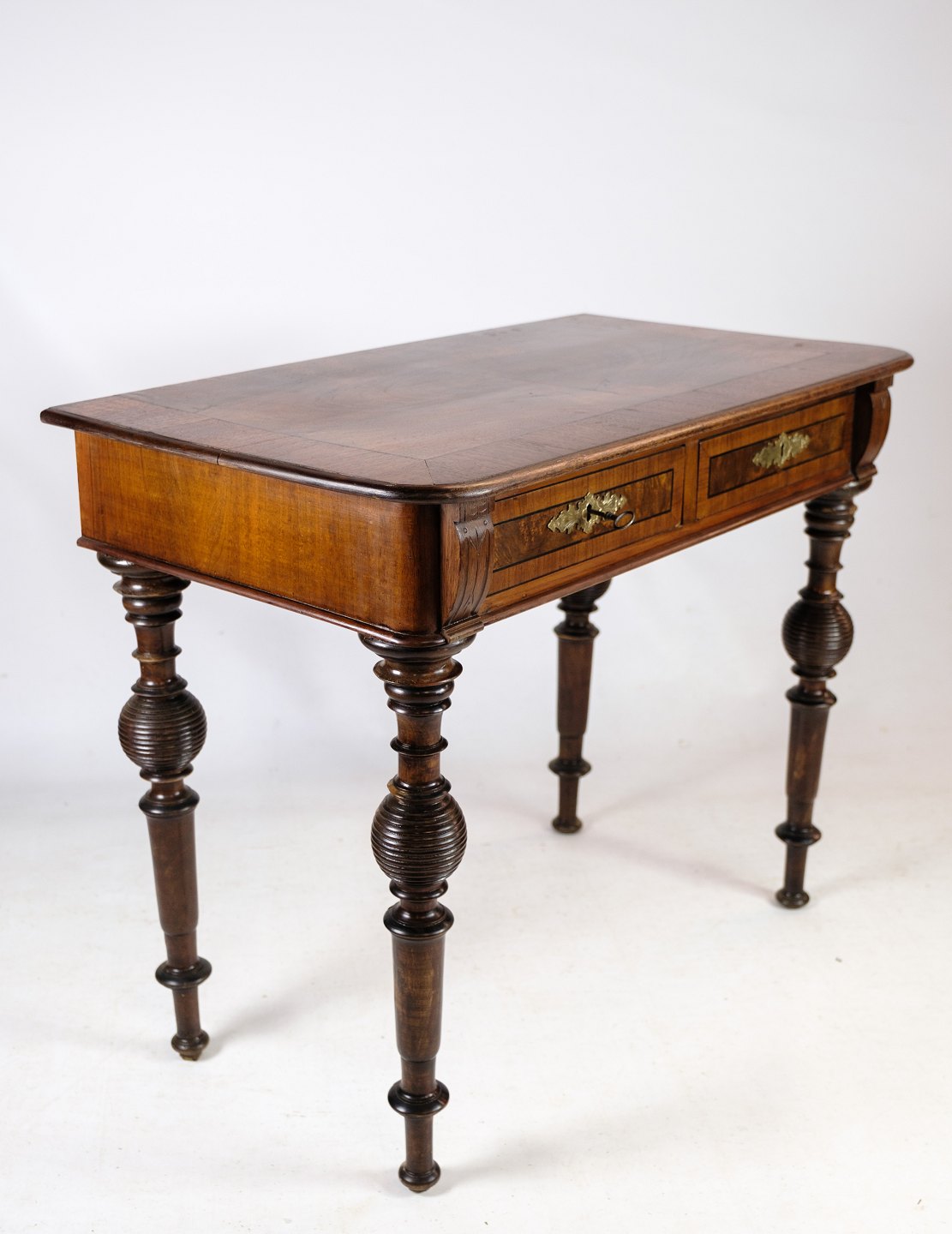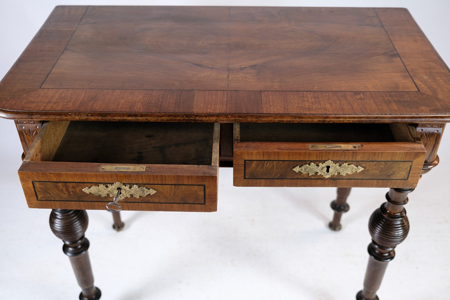 Skrivebordet er rig på detaljer, med delikate udskæringer og fine træmønstre, der fremhæver valnødtræets naturlige skønhed. De elegante ben og den forseglede overflade tilføjer både styrke og raffinement til møblet.