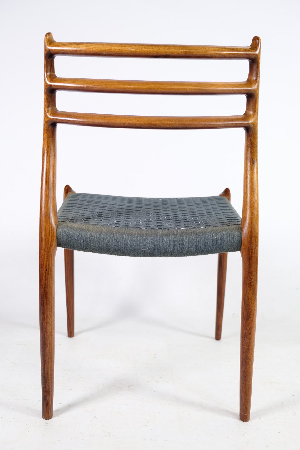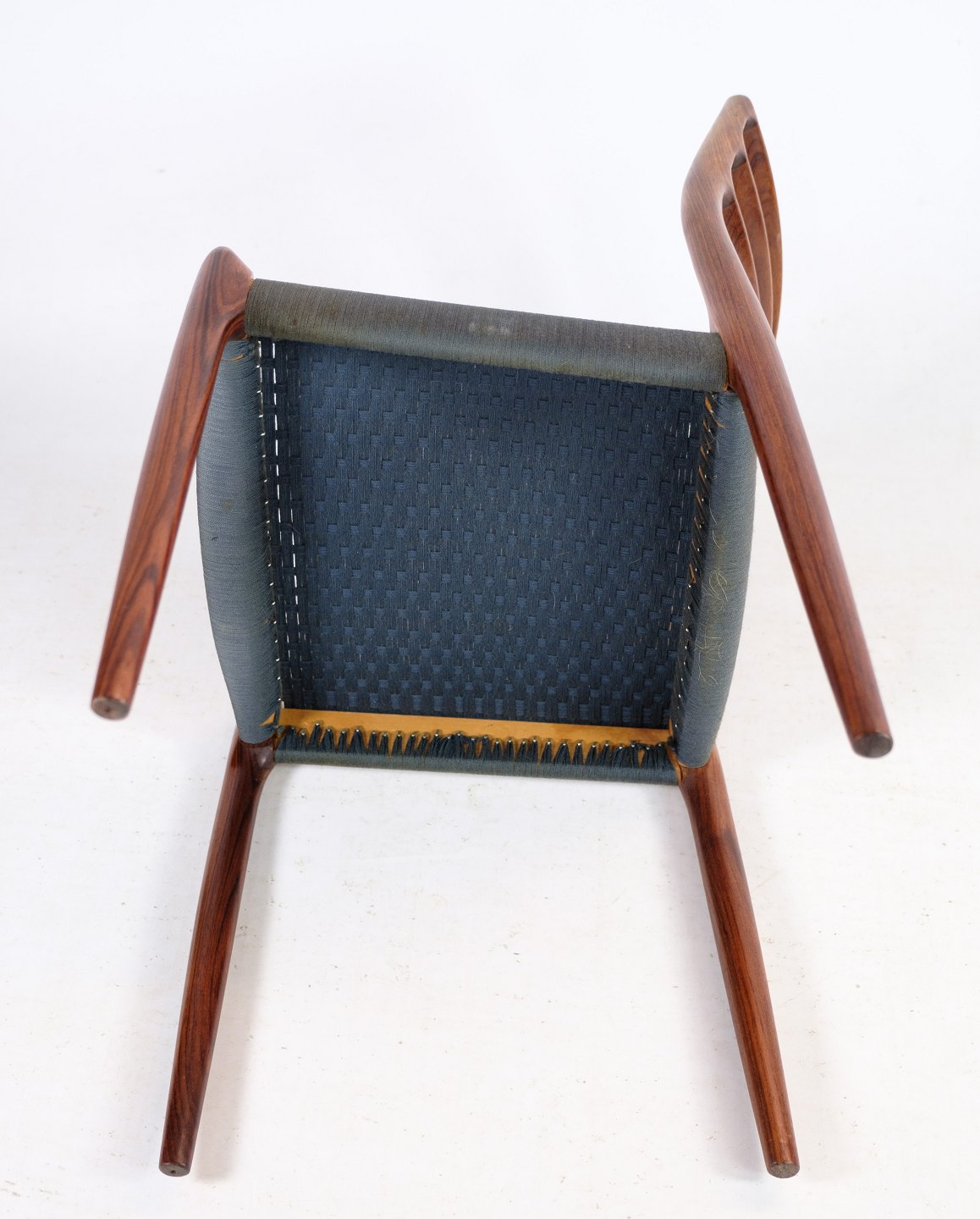 Set of 8 dining room chairs, model NO 78, designed by N.O Møller and manufactured by J. L. Møller Møbelfabrik from around the 1960s. The chairs are in rosewood with blue wicker. In our own workshop we can braid the chairs or cover with leather for an extra price. Write an email to us and we will find out together. Info@osted-antik.dk