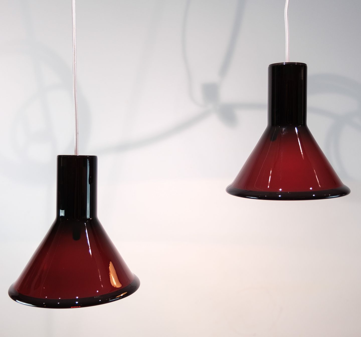 SoldA pair of pendants from Holmegaard in reddish colors from around the 1950s.