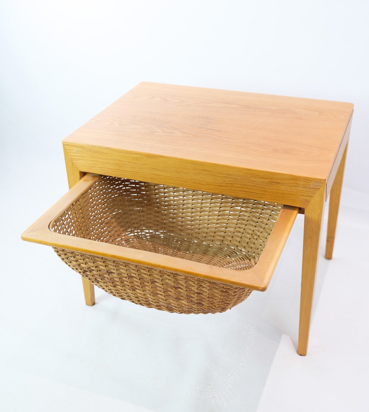 SolgtSybord / sidebord, designet af Severin Hansen i egetræ fremstillet af Haslev møbelfabrik fra 1957. Bordet har en skuffe med små rum, samt en udtrækskurv med flet.