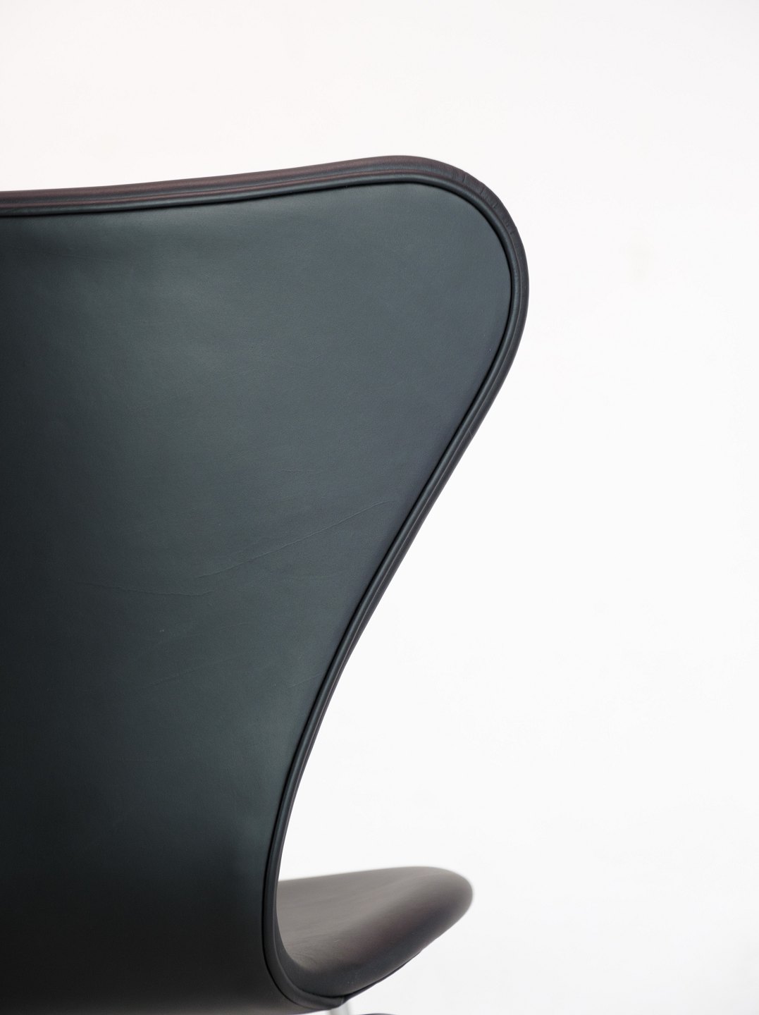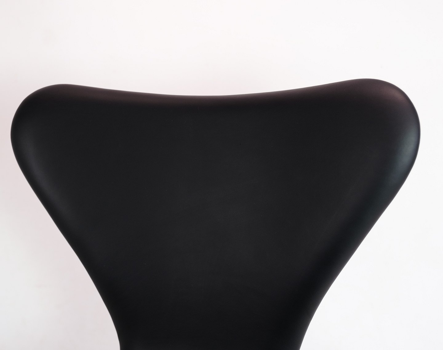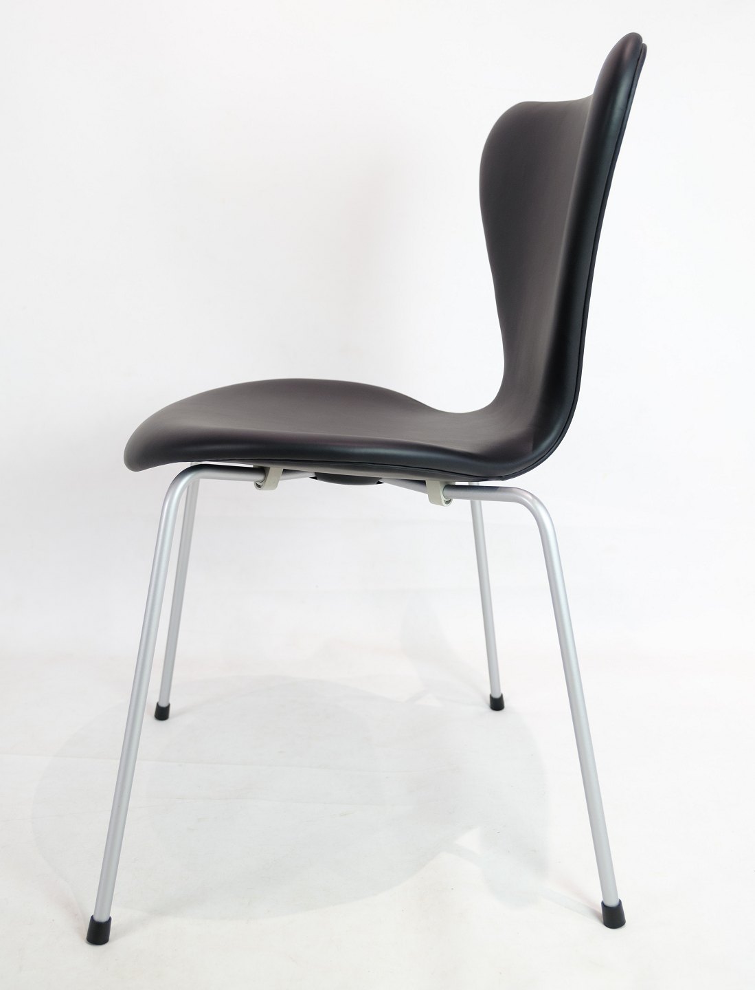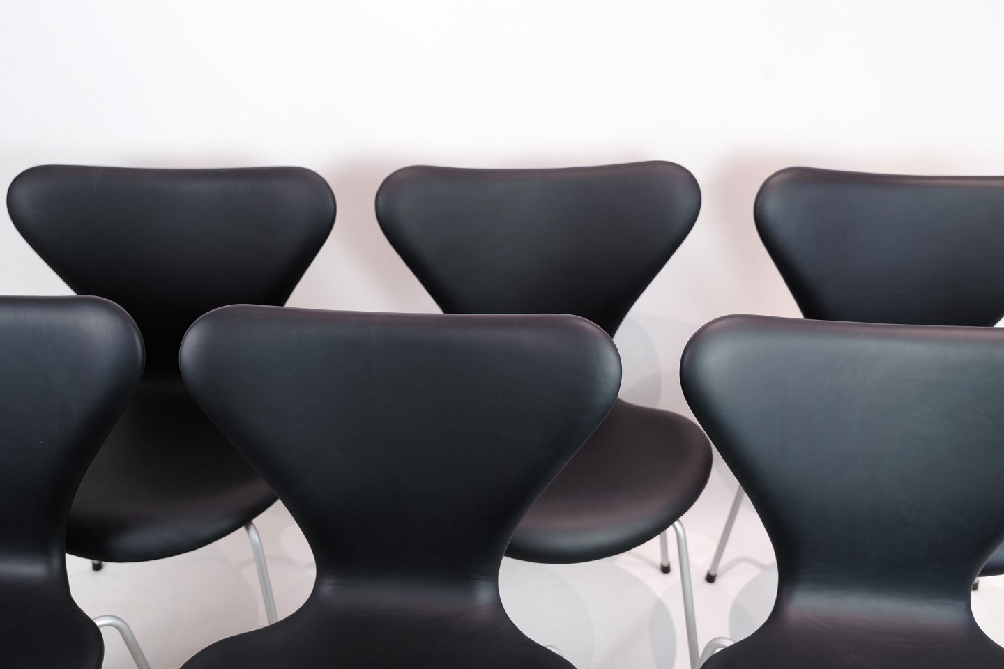 A set of 6 Seven chairs, model 3107, designed by Arne Jacobsen in 1967 and manufactured by Fritz Hansen. The chairs are newly upholstered in black elegance leather.
