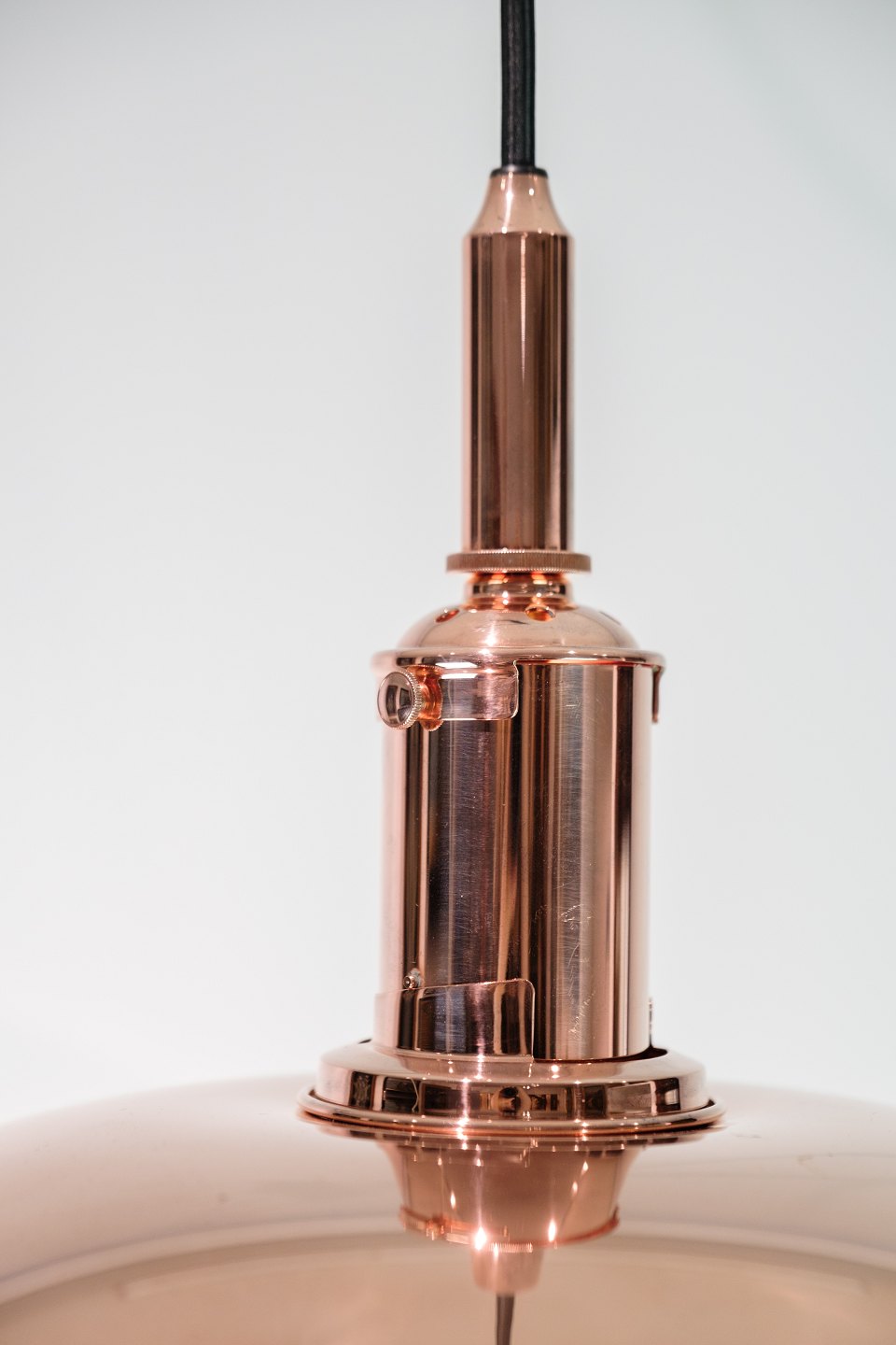 PH pendant, model 3½-3, limited edition in copper, designed by Poul Henningsen and produced by Louis Poulsen. On the occasion of Poul Henningsen's 120th birthday. Was only produced between 1 March 2014 to 30 May 2014. The lamp is made of copper with two lower shades of white opal glass. An upper scade in white opal glass is also included in the price