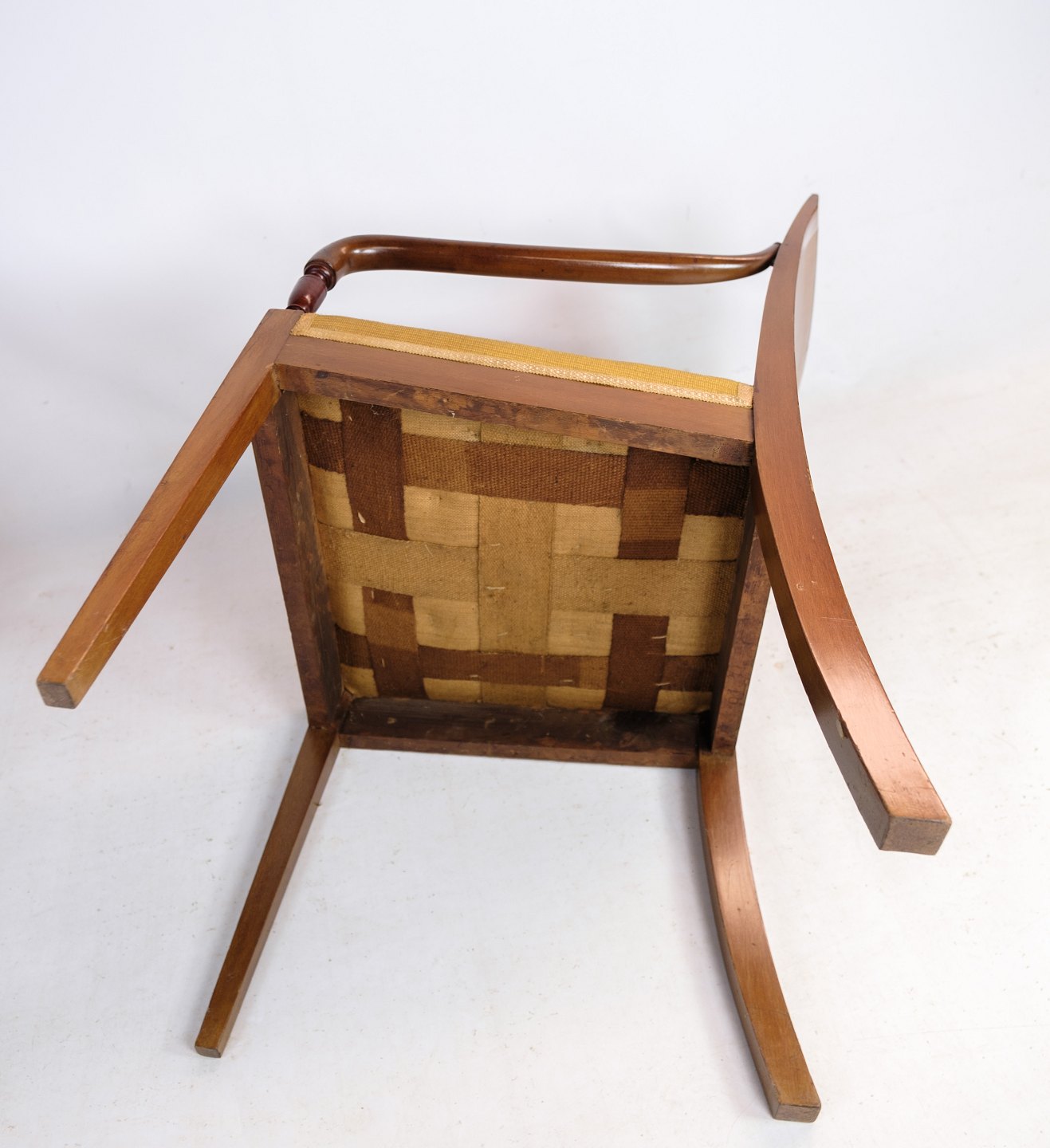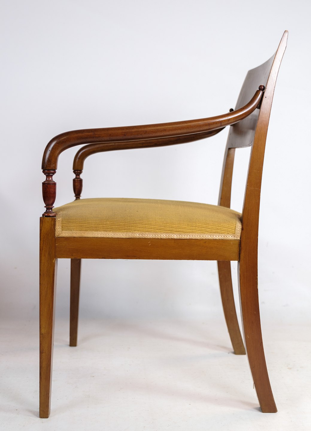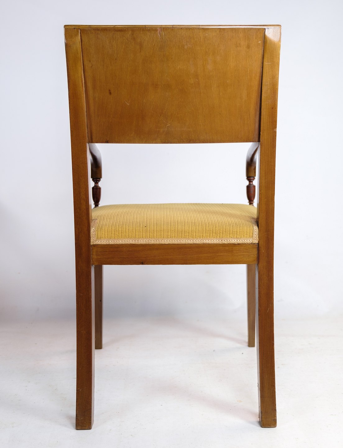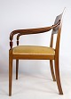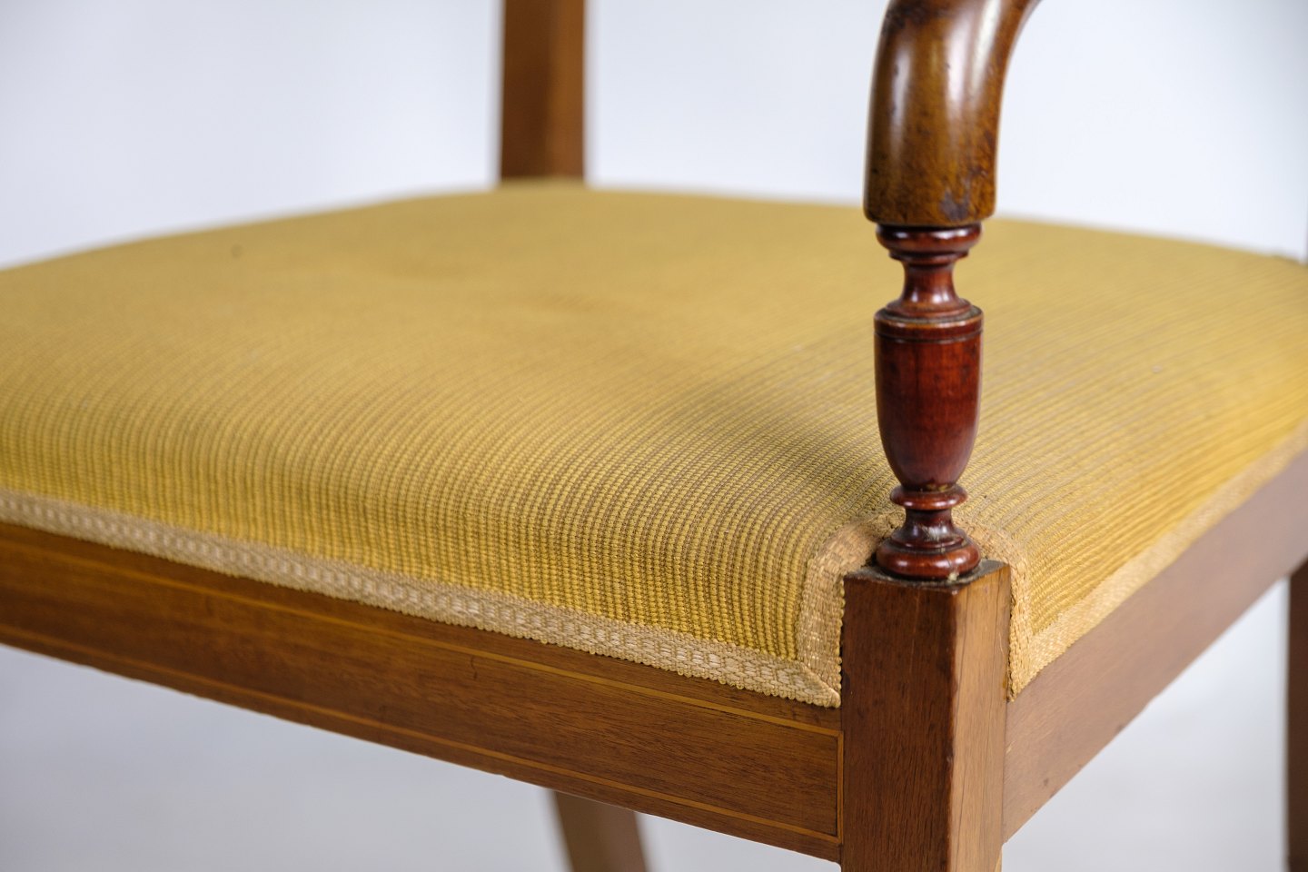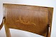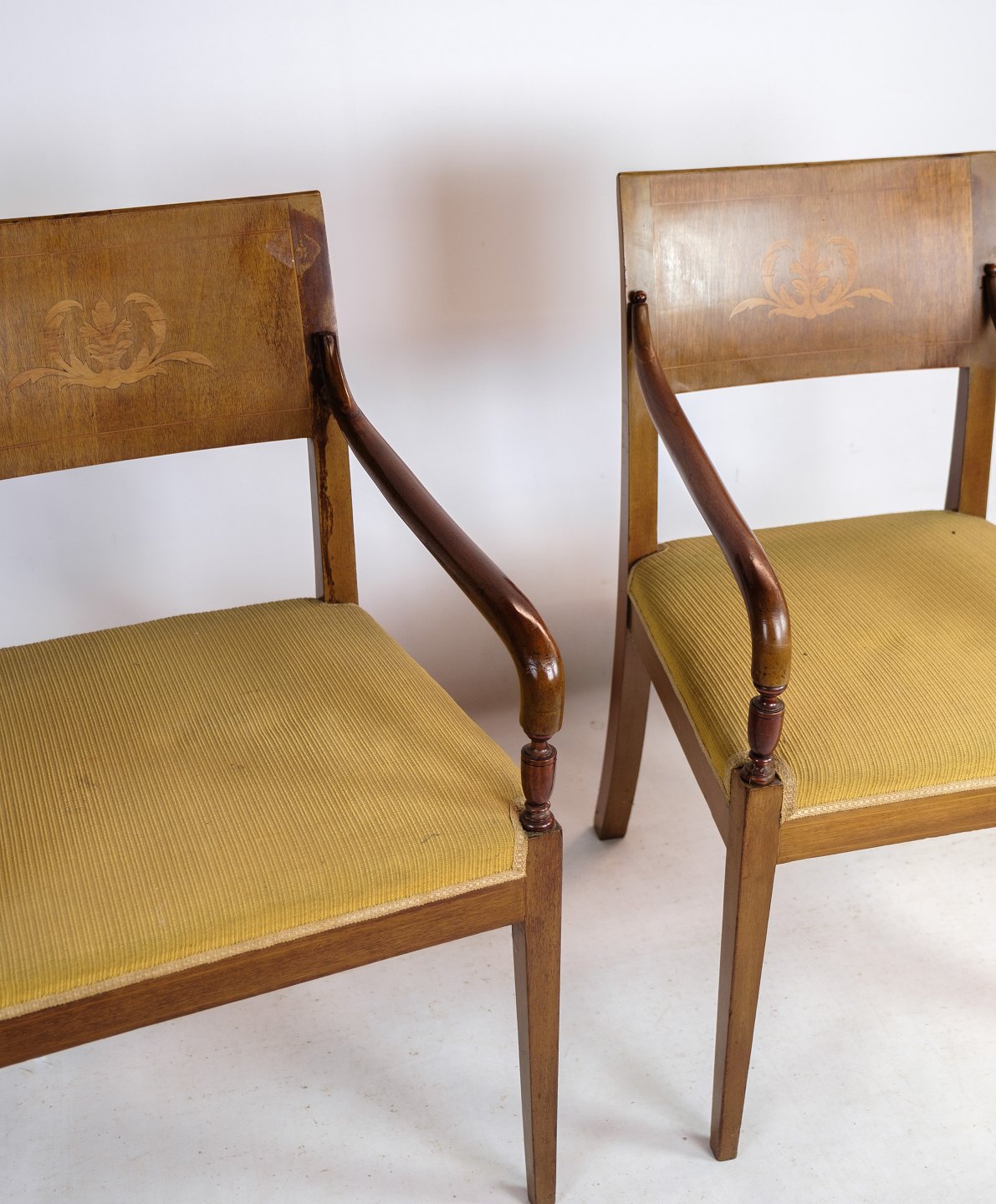 A pair of Danish Empire hand-polished mahogany armchairs with intarsia in the back of the chair from around the 1920s.
