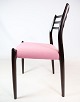 The chairs are designed to have a classic, simple style, with slim and elegant legs and a comfortable back support. The chairs are also equipped with a soft and comfortable upholstery in a pink fabric, which is in very good used condition. The fabric creates a warm and cozy atmosphere in the dining room and gives the chairs a soft and inviting appearance.