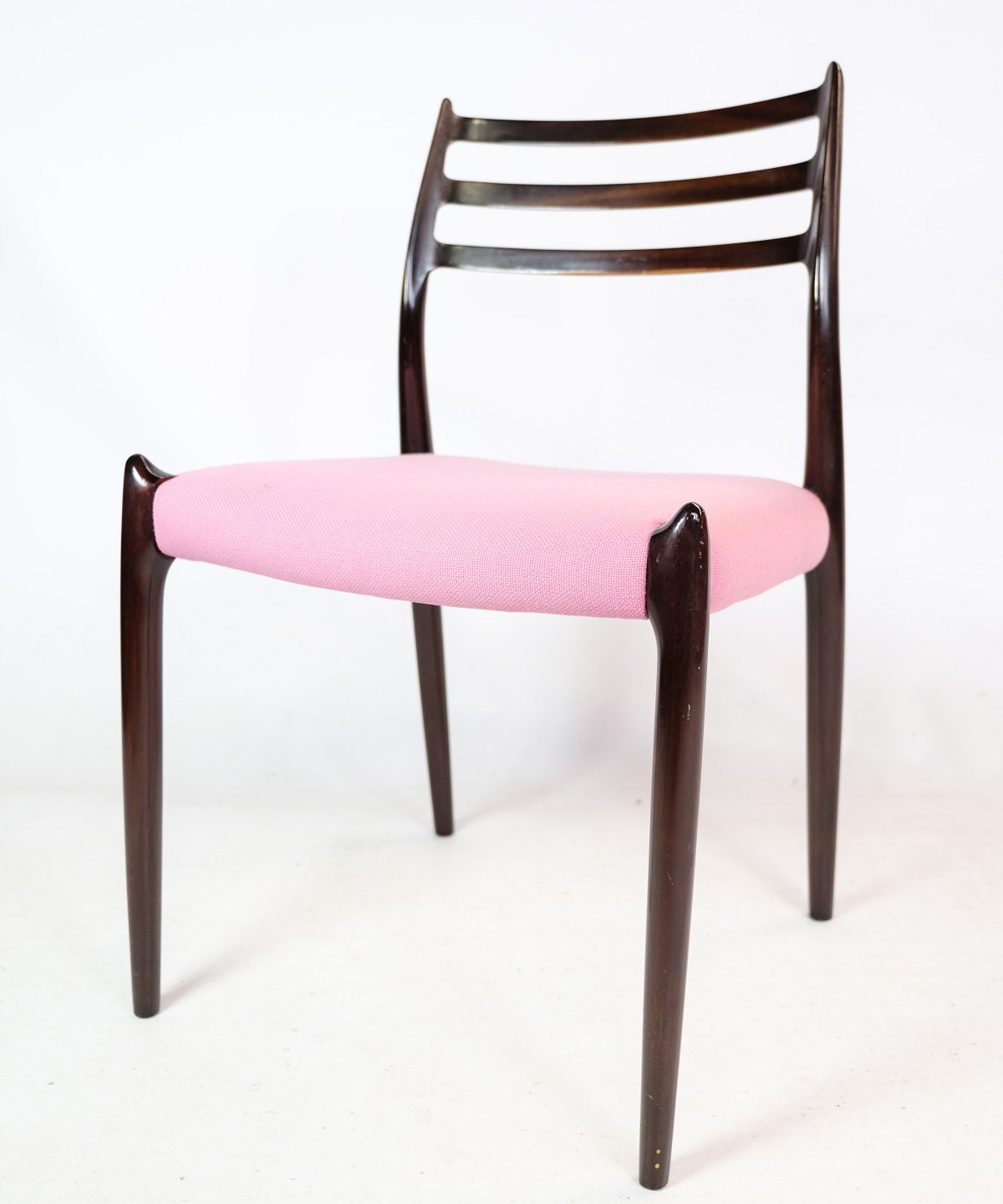 The dining table chairs model 78, designed by the Danish furniture designer N.O. Møller and manufactured by JL Møller, is an example of timeless Danish craftsmanship and design. The chairs are made of mahogany, which is a type of wood known for its durability and beauty.