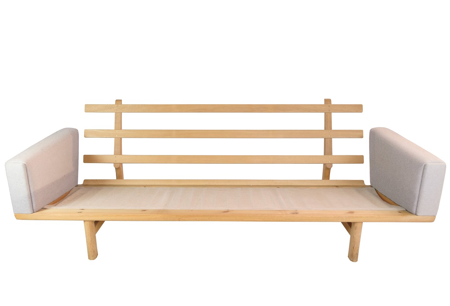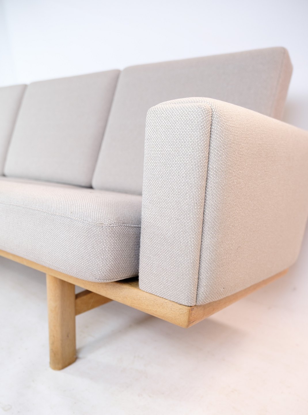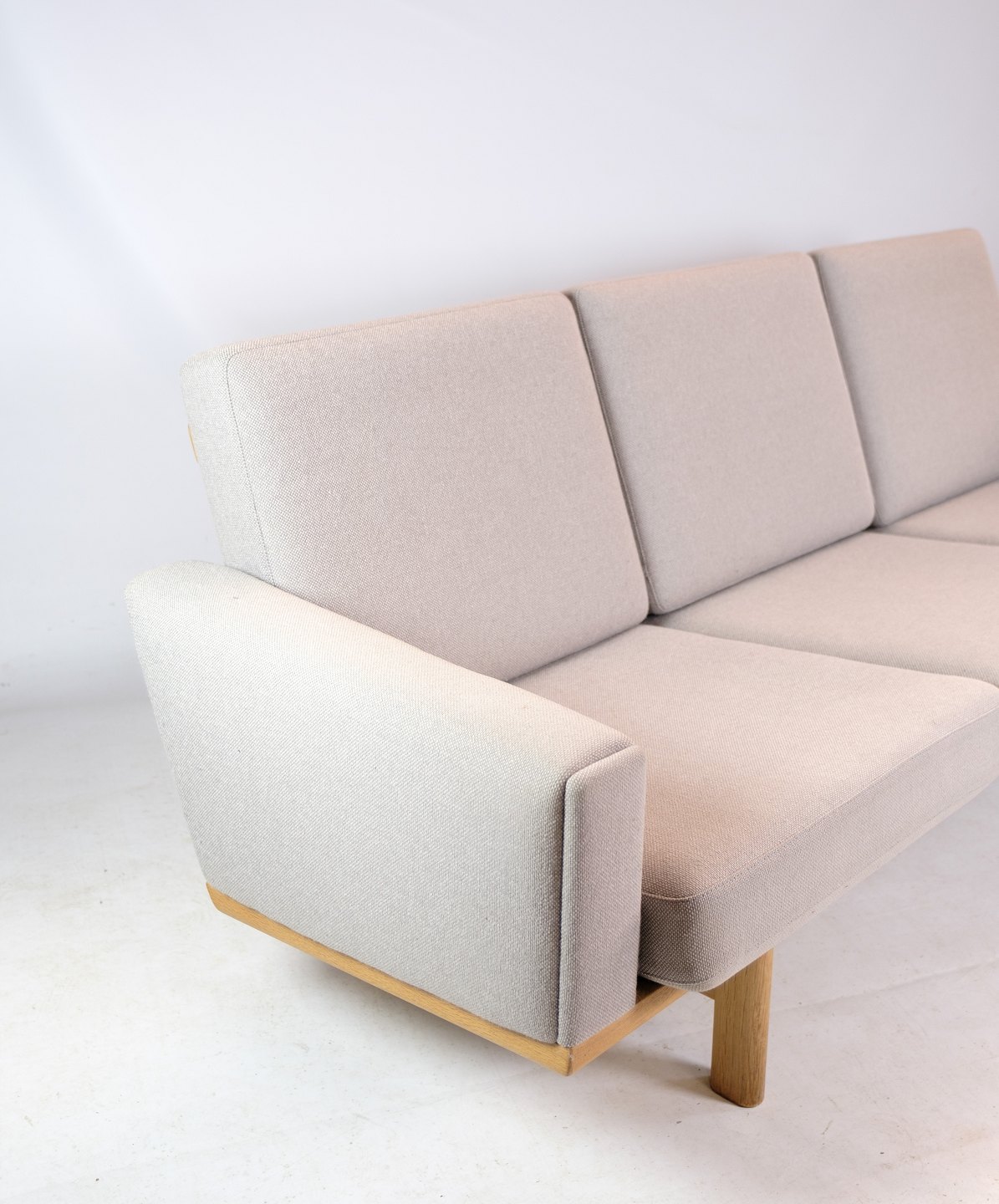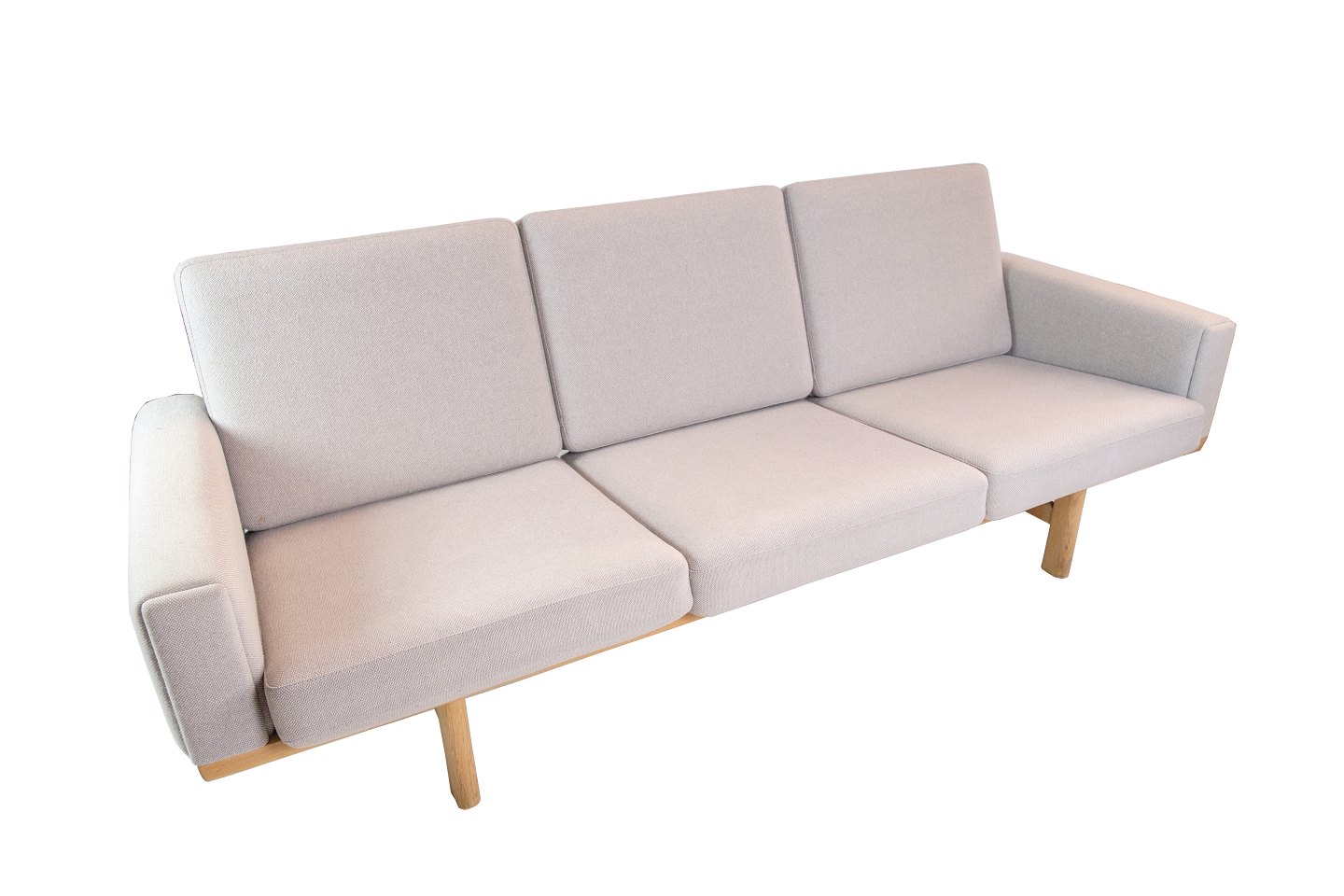 SolgtSofaen GE-236/3, designet af Hans J. Wegner og fremstillet af Getama i 1960erne, er en elegant og stilfuld trepersoners sofa. Den er polstret med et lyst uldstof, der giver den et blødt og behageligt sæde. Rammen er fremstillet af solidt egetræ, der giver sofaen et robust og holdbart udseende. Sofaen vil være et fremragende valg for dem, der ønsker at tilføje et touch af dansk design og håndværk til deres hjem.