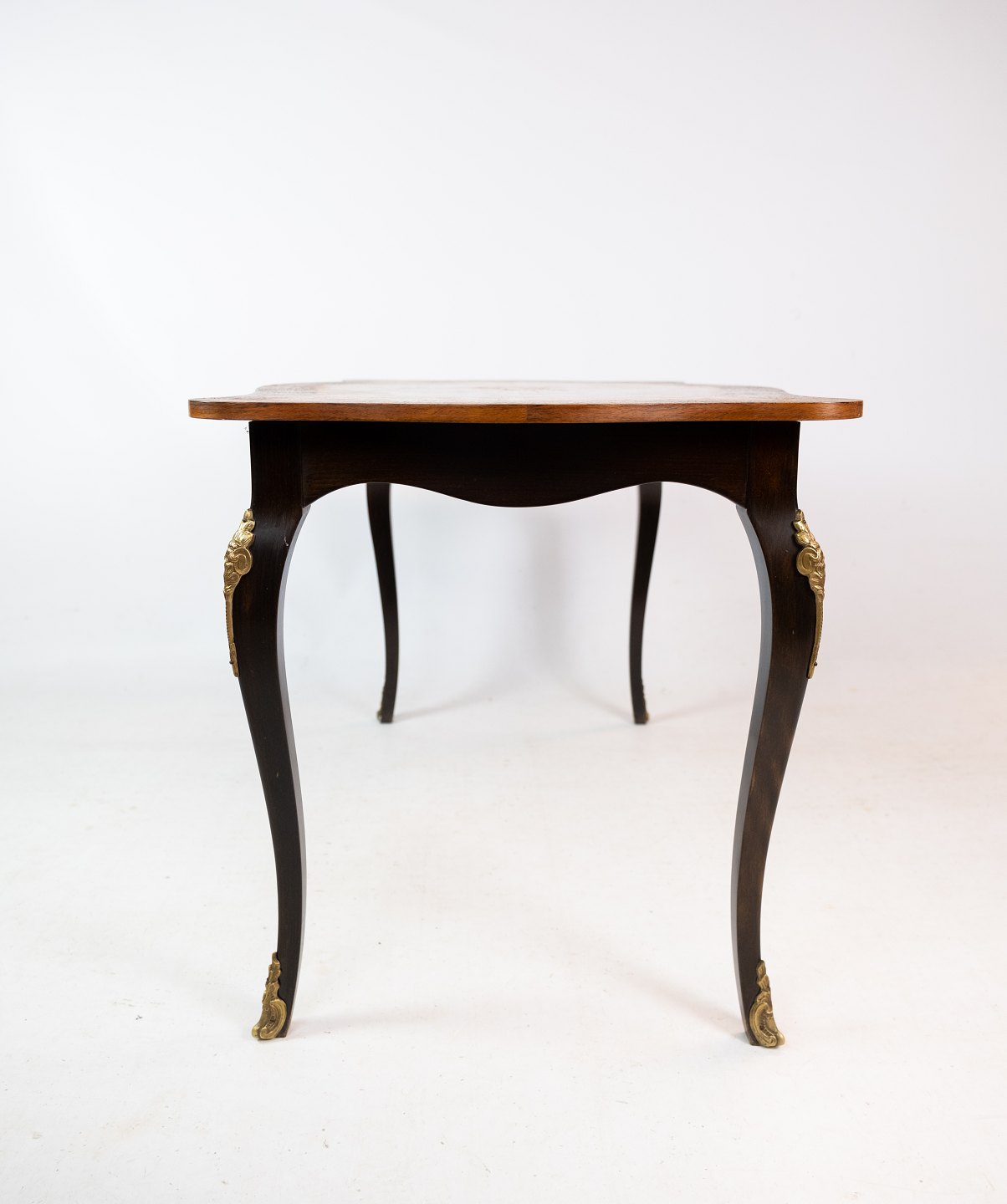 Antikt sofabord af rococo stil med ben af bejdset træ med messing dekoration og overflade i rosentræ med intarsia fra omkring 1930'erne.