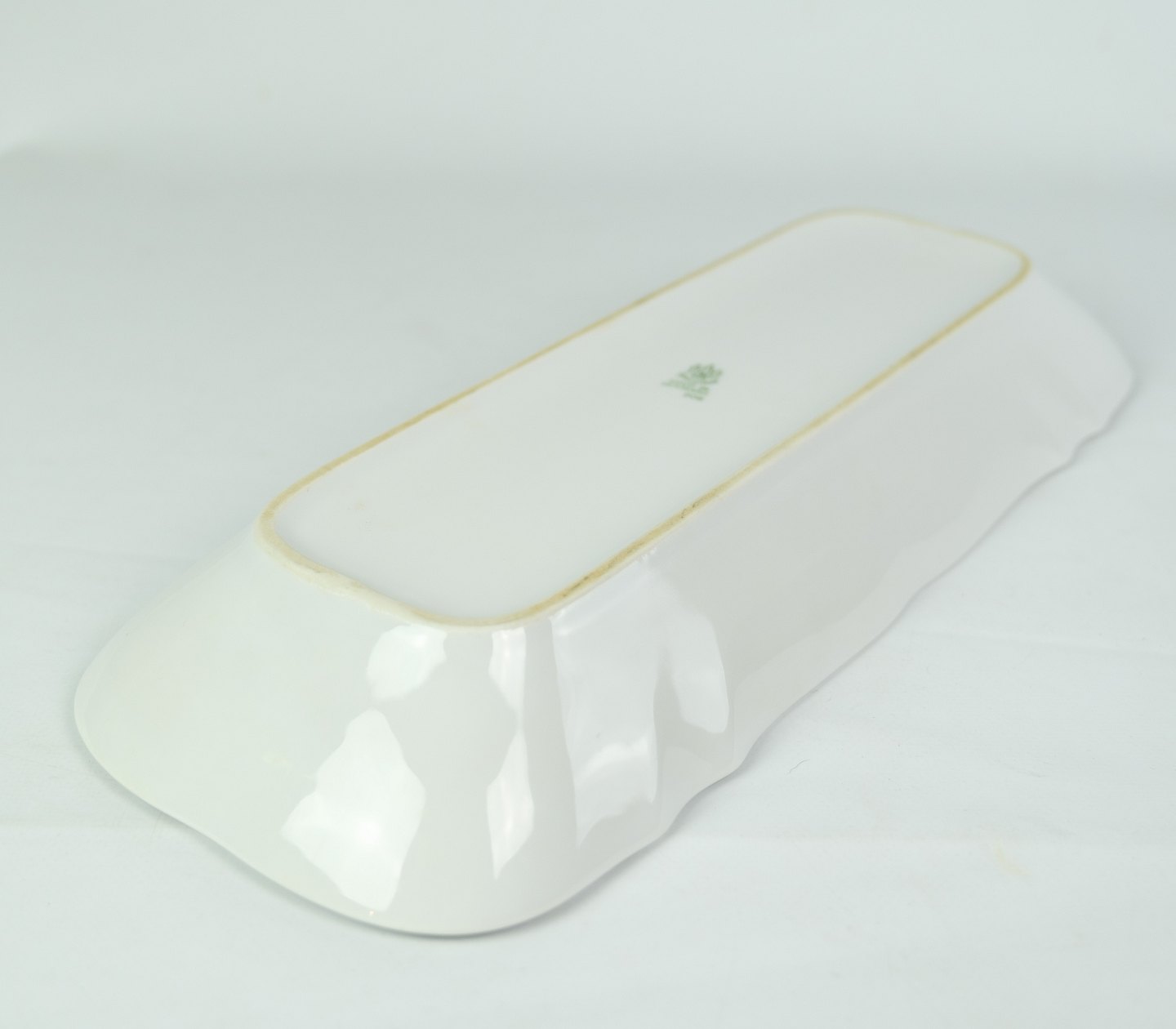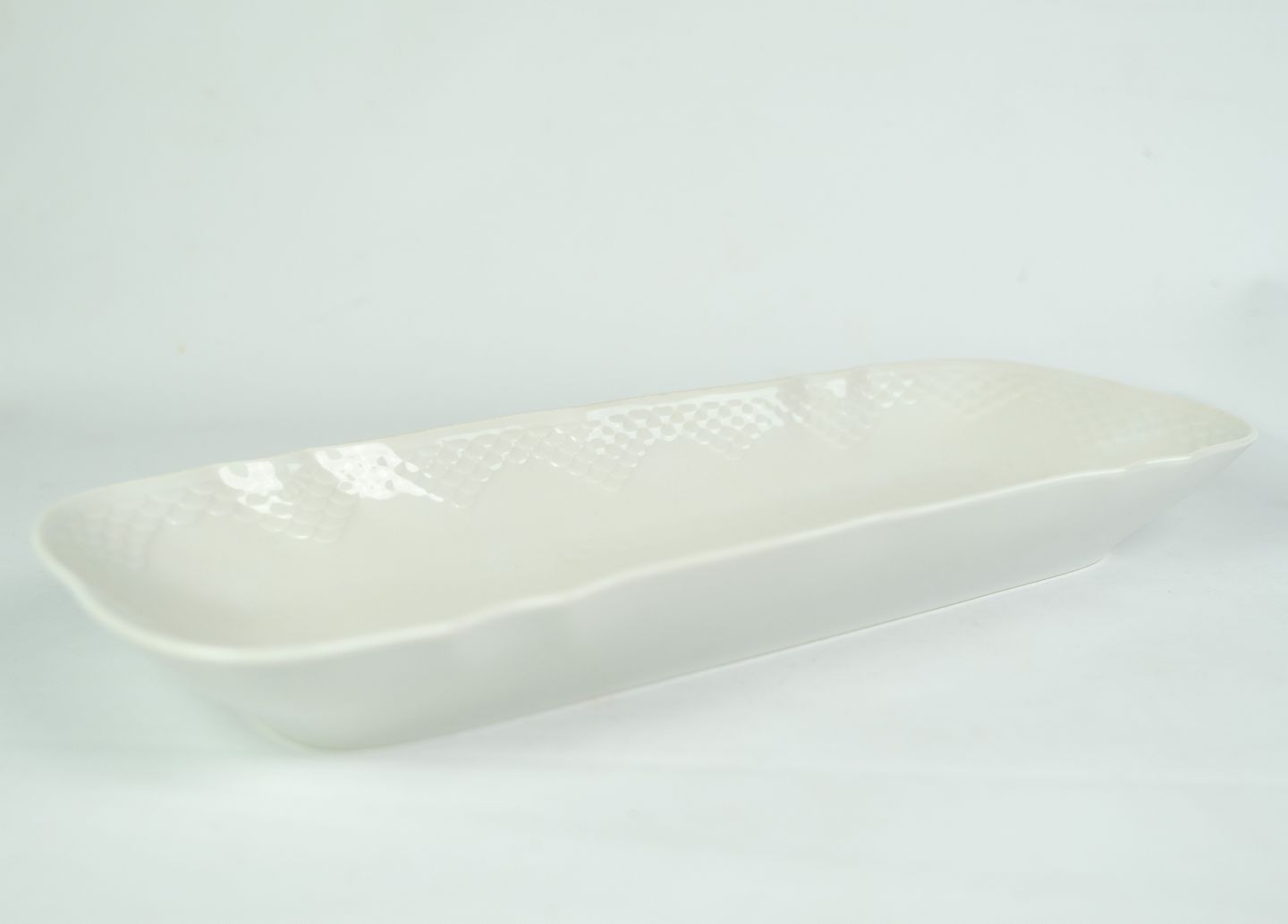 Hvid riflet aflangt fad fra Bing & Grøndahl i porcelæn fra omkring år 1950'erne.