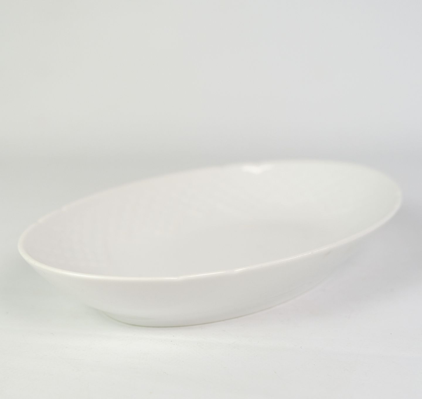 Hvid riflet ovalt fad fra Bing & Grøndahl fra omkring år 1950'erne.