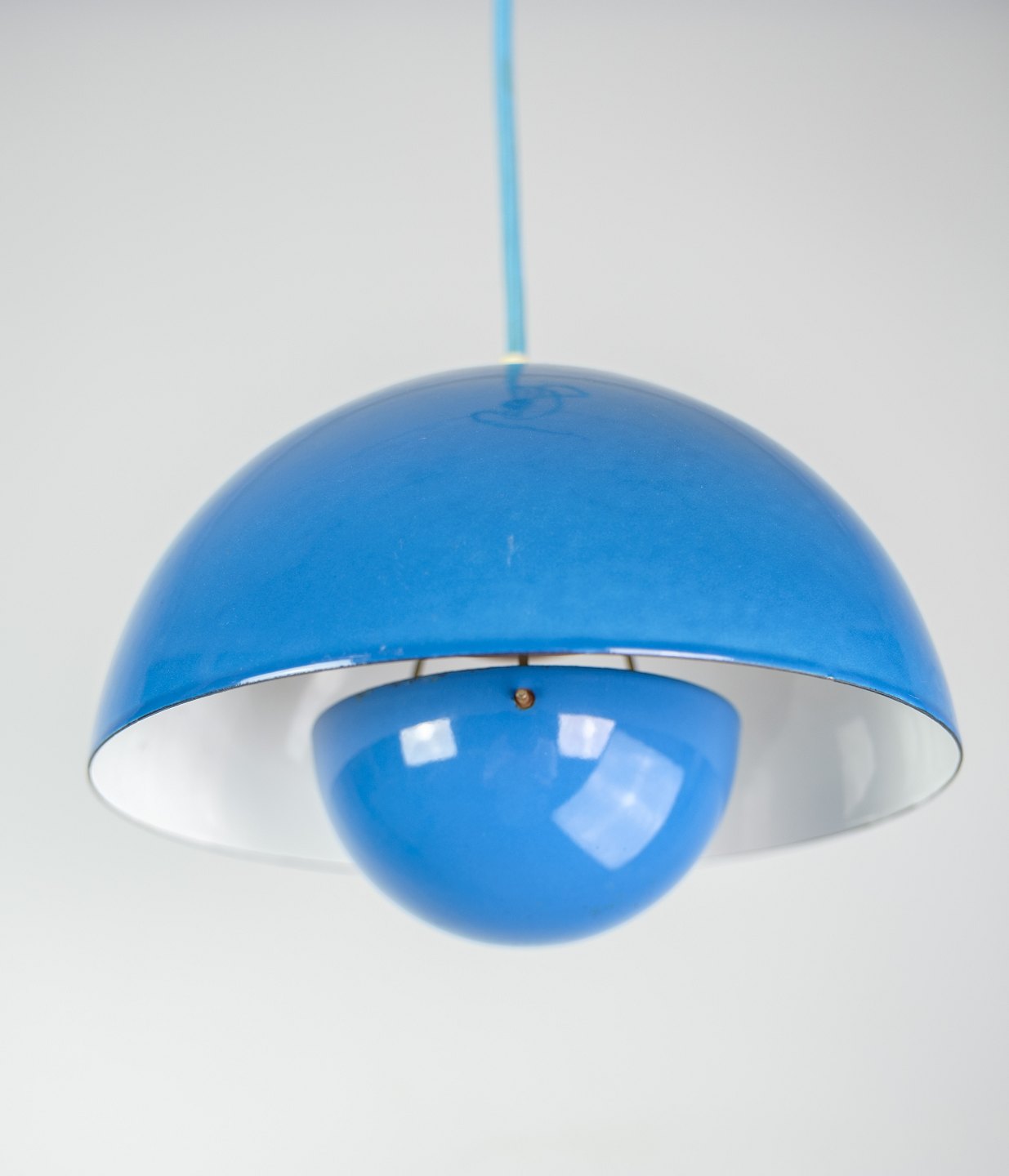 Flowerpot loftslampe, designet af Verner Panton (1926-1998) VP1 i lyseblå farve fra 1970'erne.