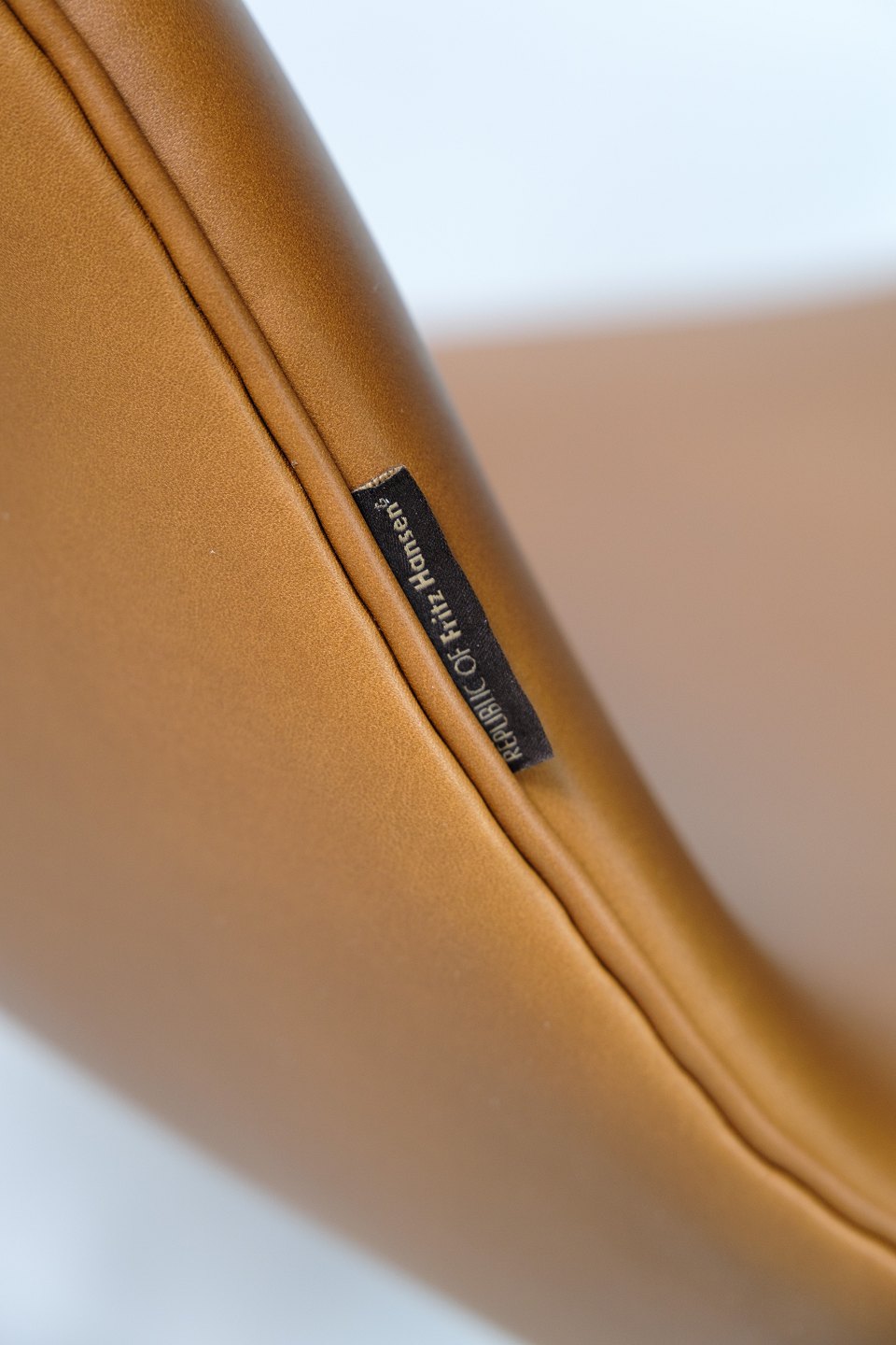 Svanen, model 3320, designet af Arne Jacobsen fremstillet hos Fritz Hansen og formgivet i 1957-1958. Lænestolen står med originalt læder af den højeste kvalitet og i fremragende stand. Stolen er drejelig, med føder af aluminium.