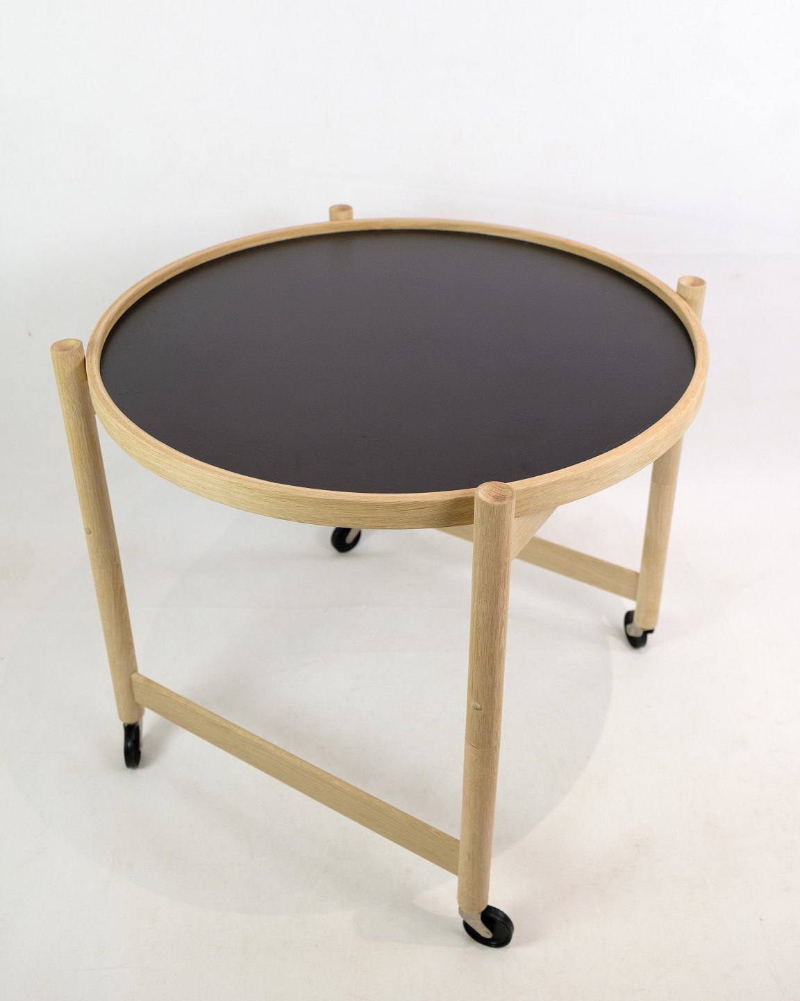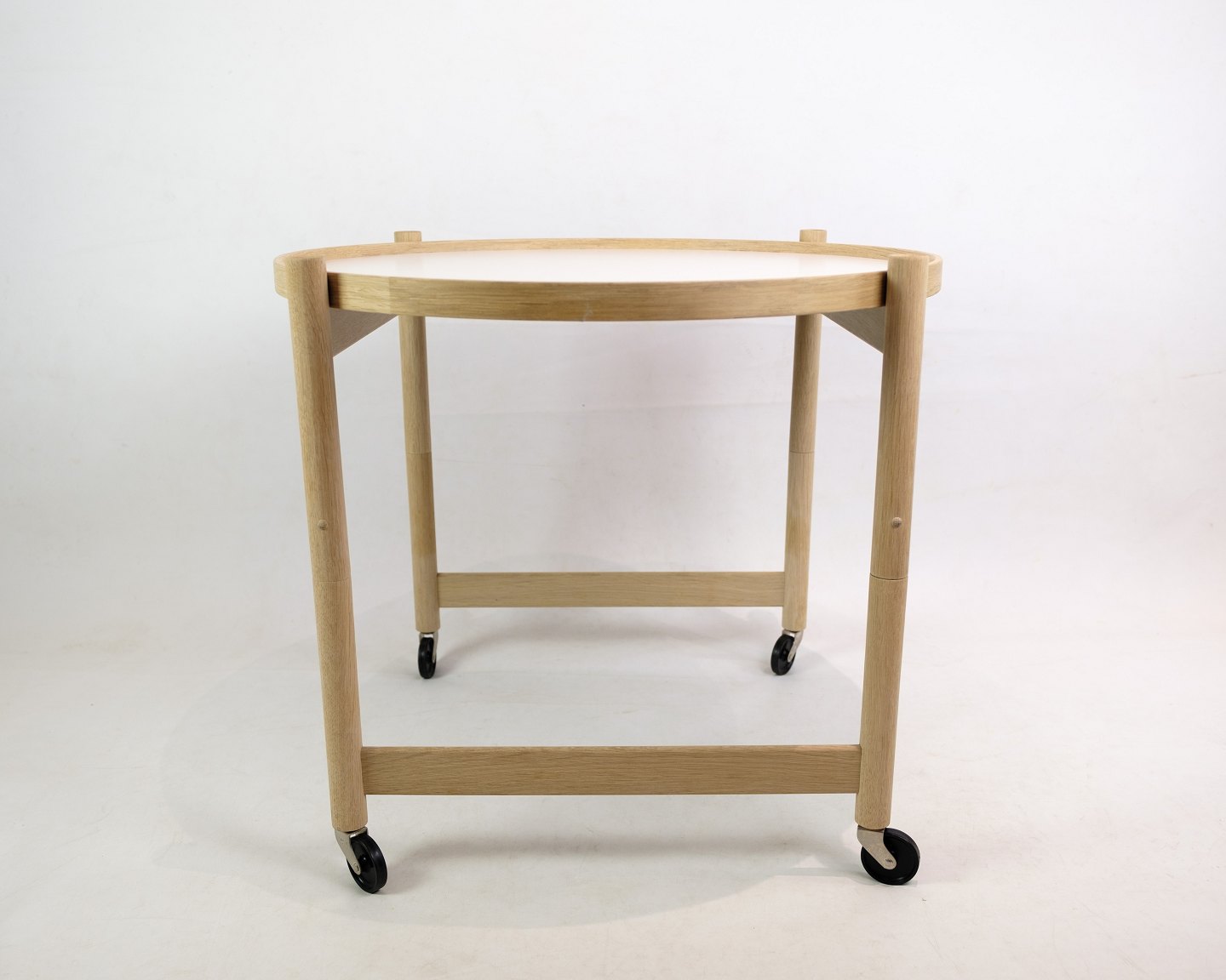 SolgtBakkebord, designet af Hans Bølling af træsorten egetræ med bakke af hvid laminat.