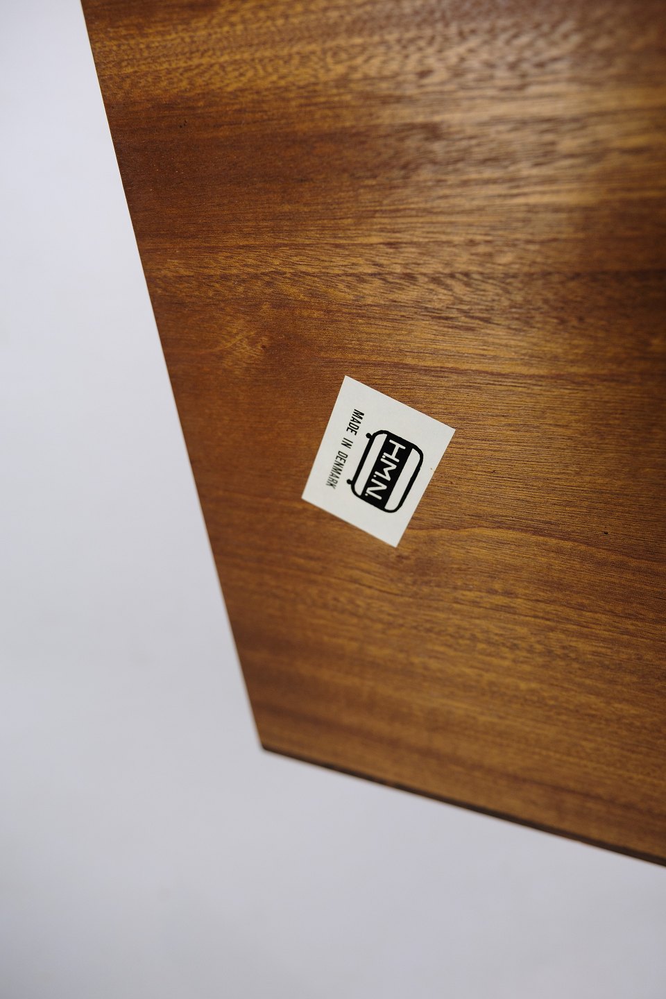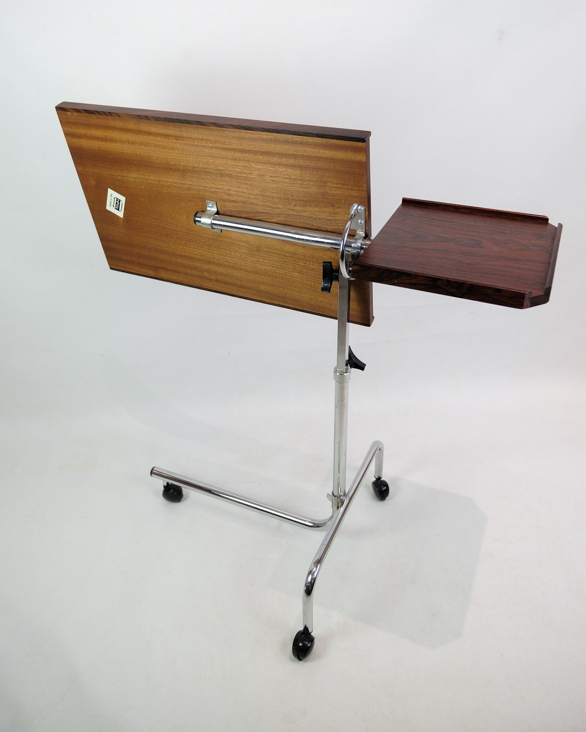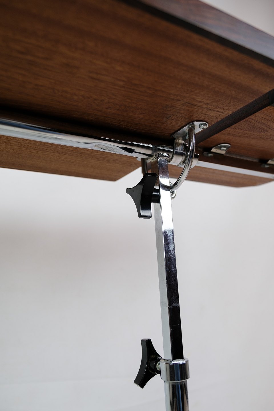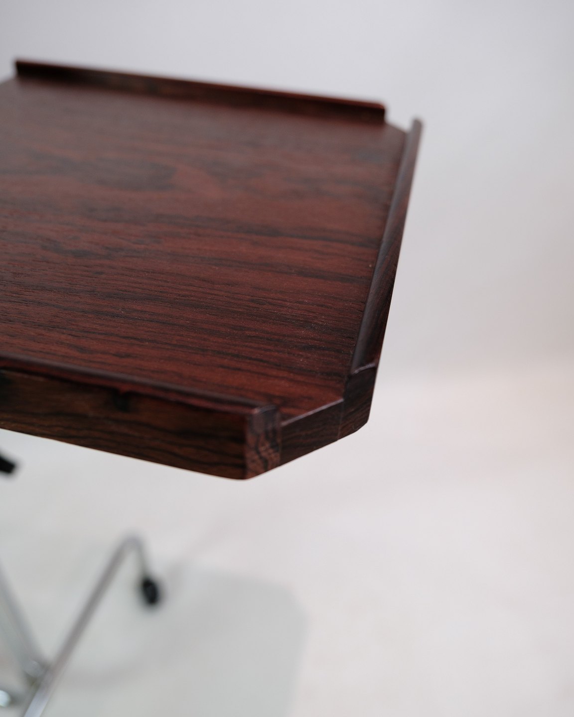 Justerbart sideboard i træsorten palisander med poleret stel af krom af dansk design fra omkring 1960'erne. Vil lave et flot sengebord, endebord, tv-bord eller arbejdsbord. Lille sidebord er aftageligt. Sidder på hjul for nem flytning.