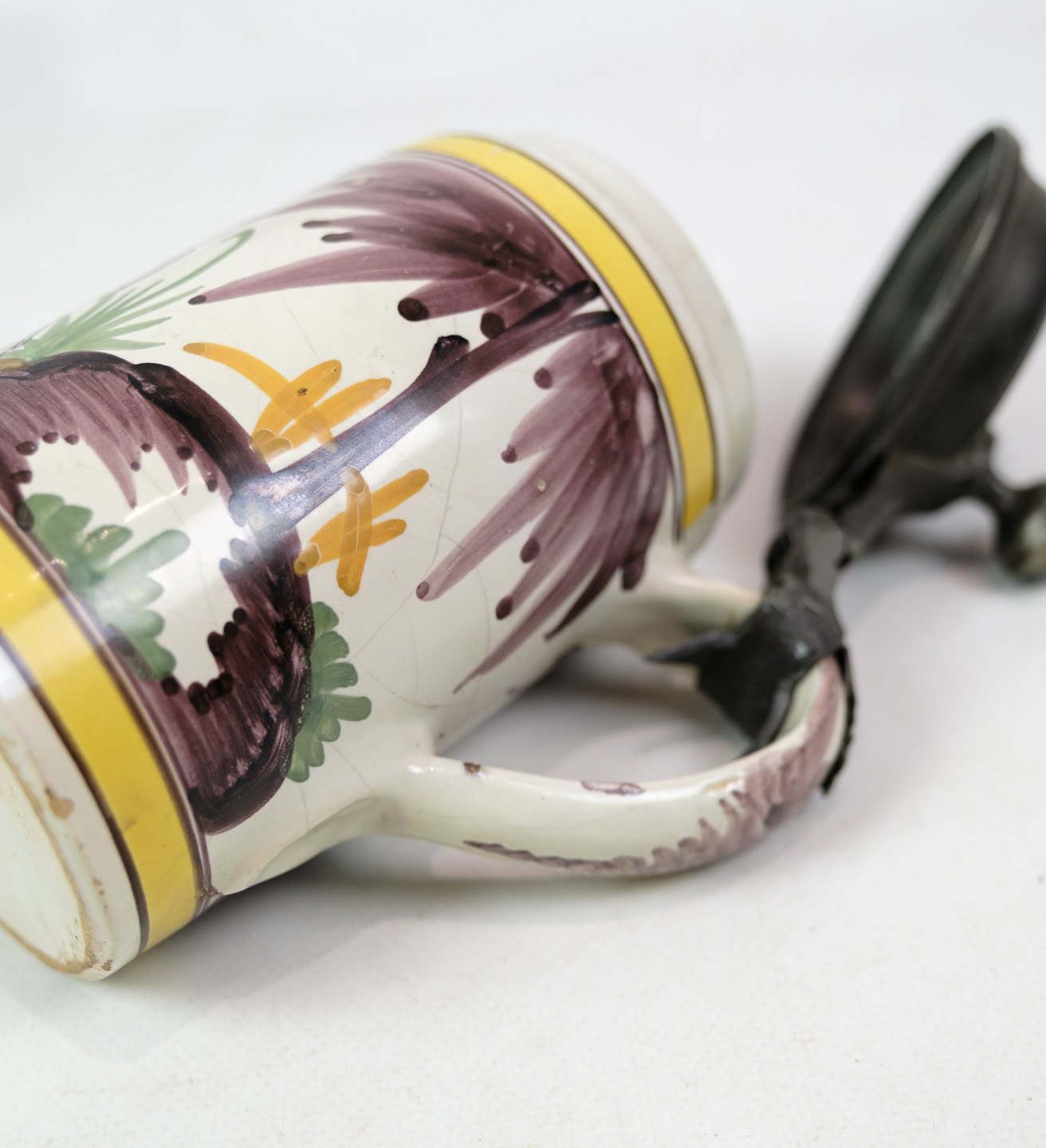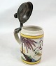 Tysk Kellinghusen lågkrus med motiv af blomster og hest med tin låg fra omkring år 1780'erne.