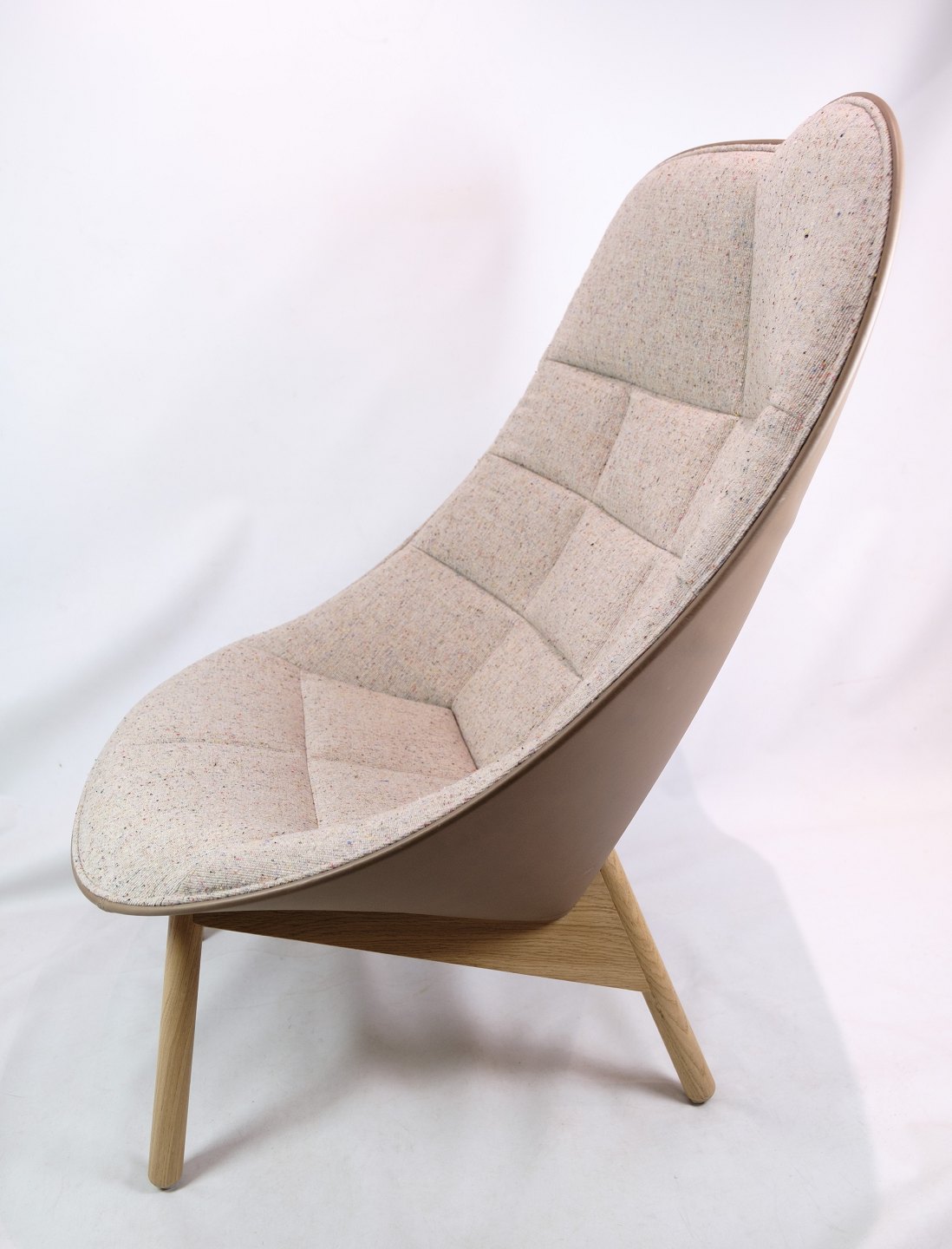 SolgtLænestol, model Quilt, designet af Doshi Levien fremstillet af Hay. Stolen er med stel af egetræ og stoffarven Bolgheri LGG70 / Sense Nougat