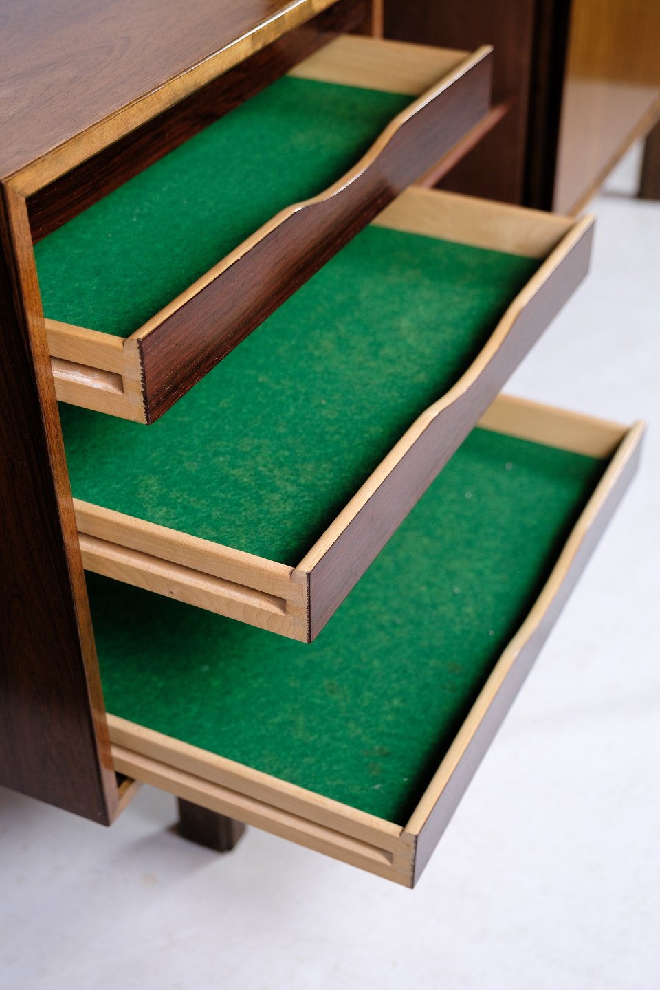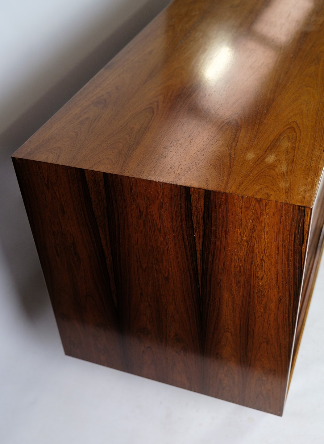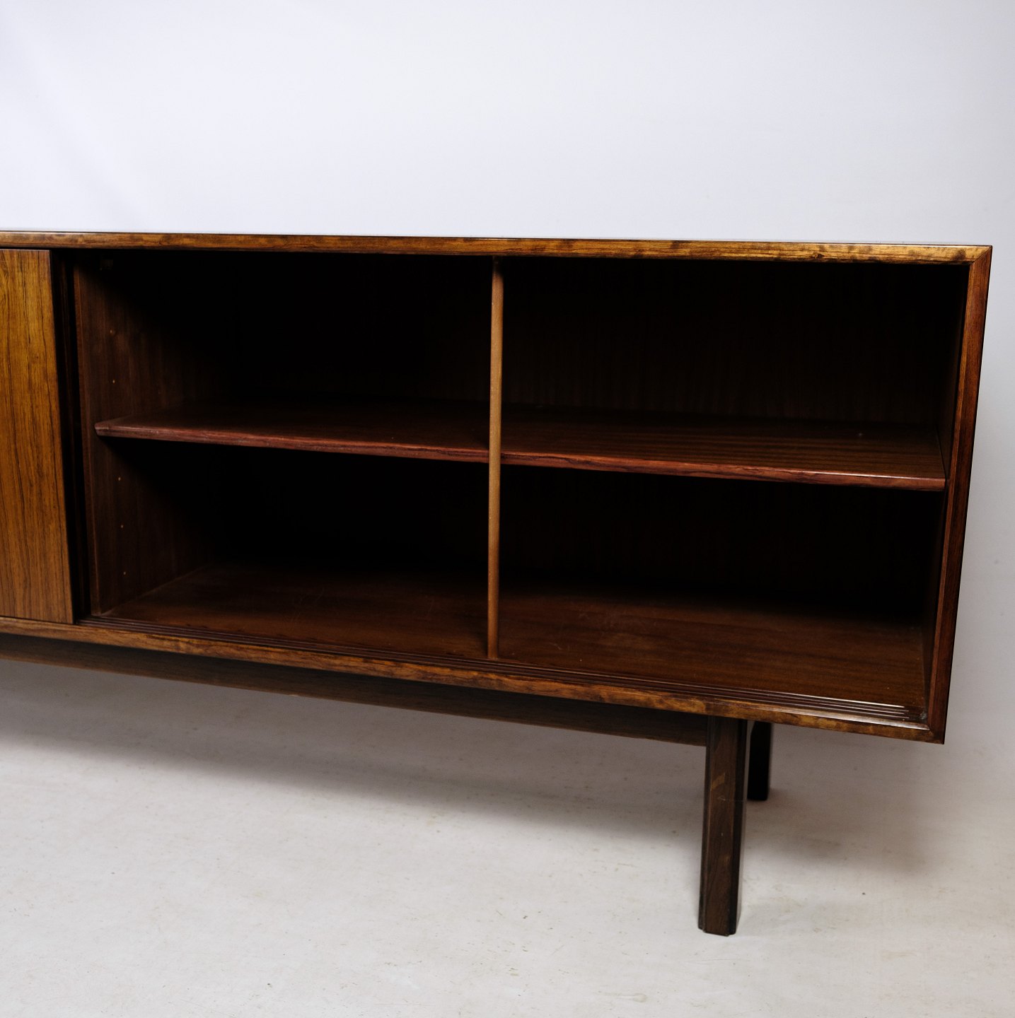 With its low-profile design and rosewood sliding doors, the sideboard exudes a simple elegance that fits perfectly with the style of Scandinavian modernism. The natural beauty and warm colors of rosewood create a welcoming atmosphere in any room.