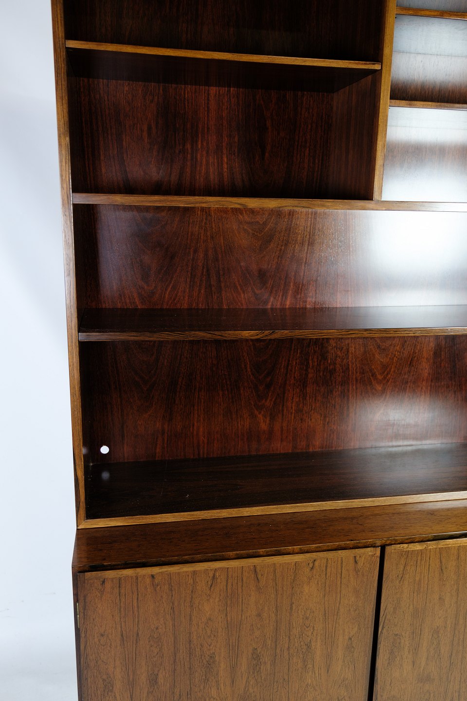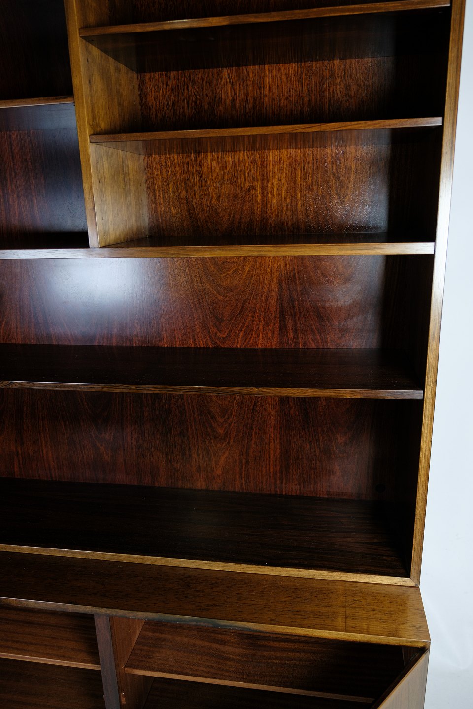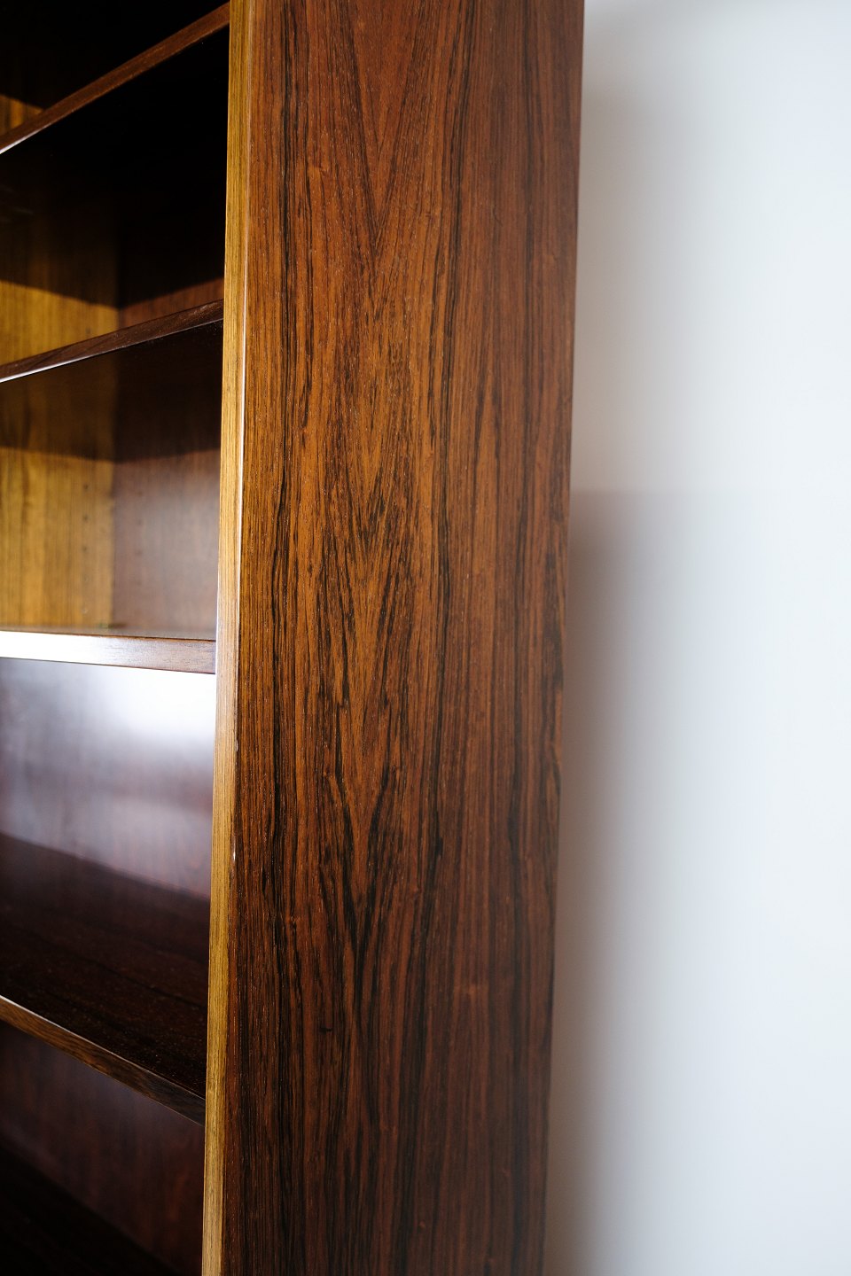 Fremstillet af palisander udstråler det varme og naturlige træ en unik skønhed og charme. Systemet består af en underdel med to låger og en vitrineoverdel med hylder, der tilbyder både funktionel opbevaring og smuk udstillingsplads.