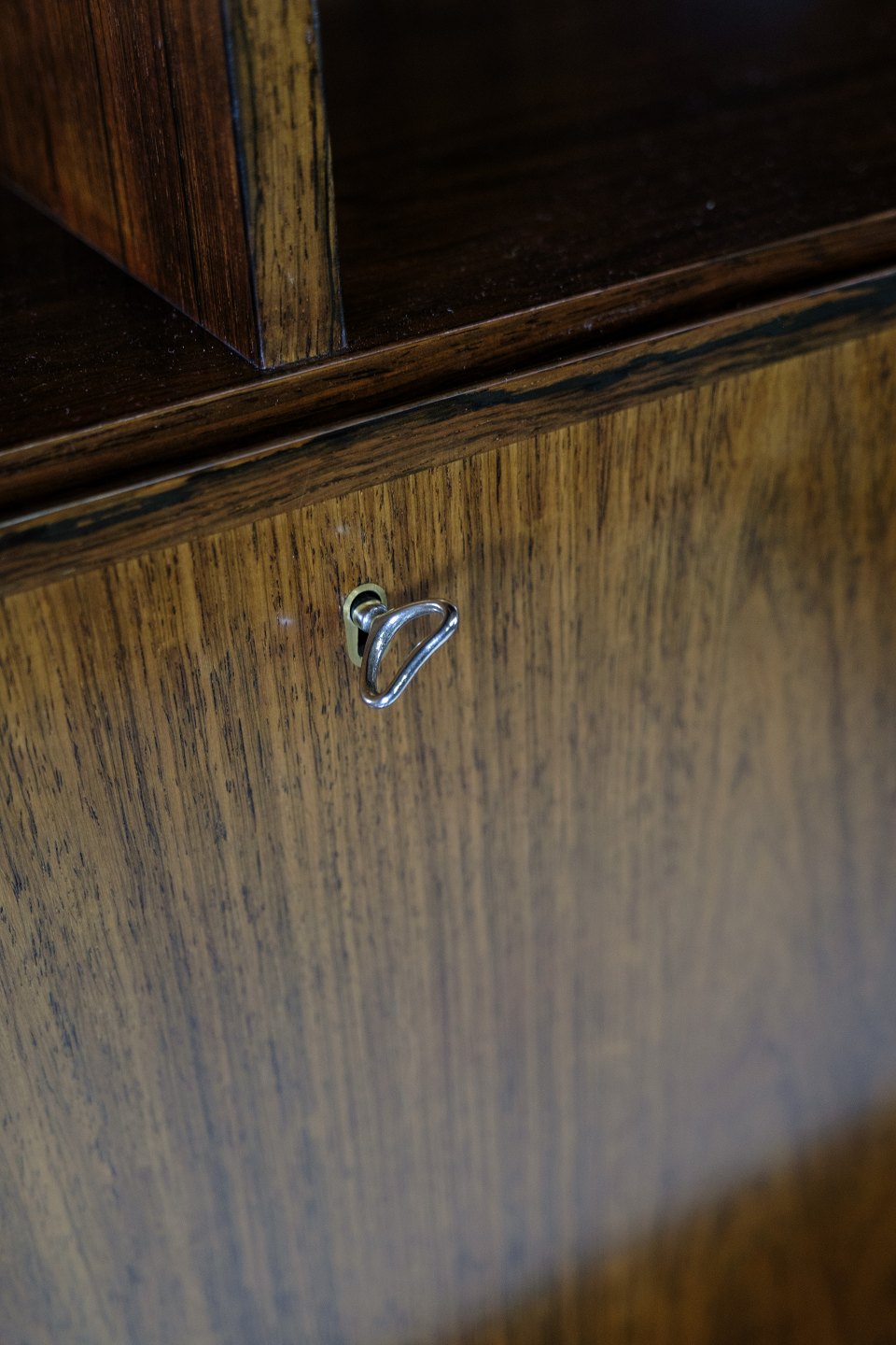 Reol system med sekretær, Model 9, designet af Omann Junior i palisander af dansk design fremstillet hos Omann Juniors Møbelfabrik fra 1960'erne. Bestående af underdel med 2 låger og vitrine overdel med hylder.