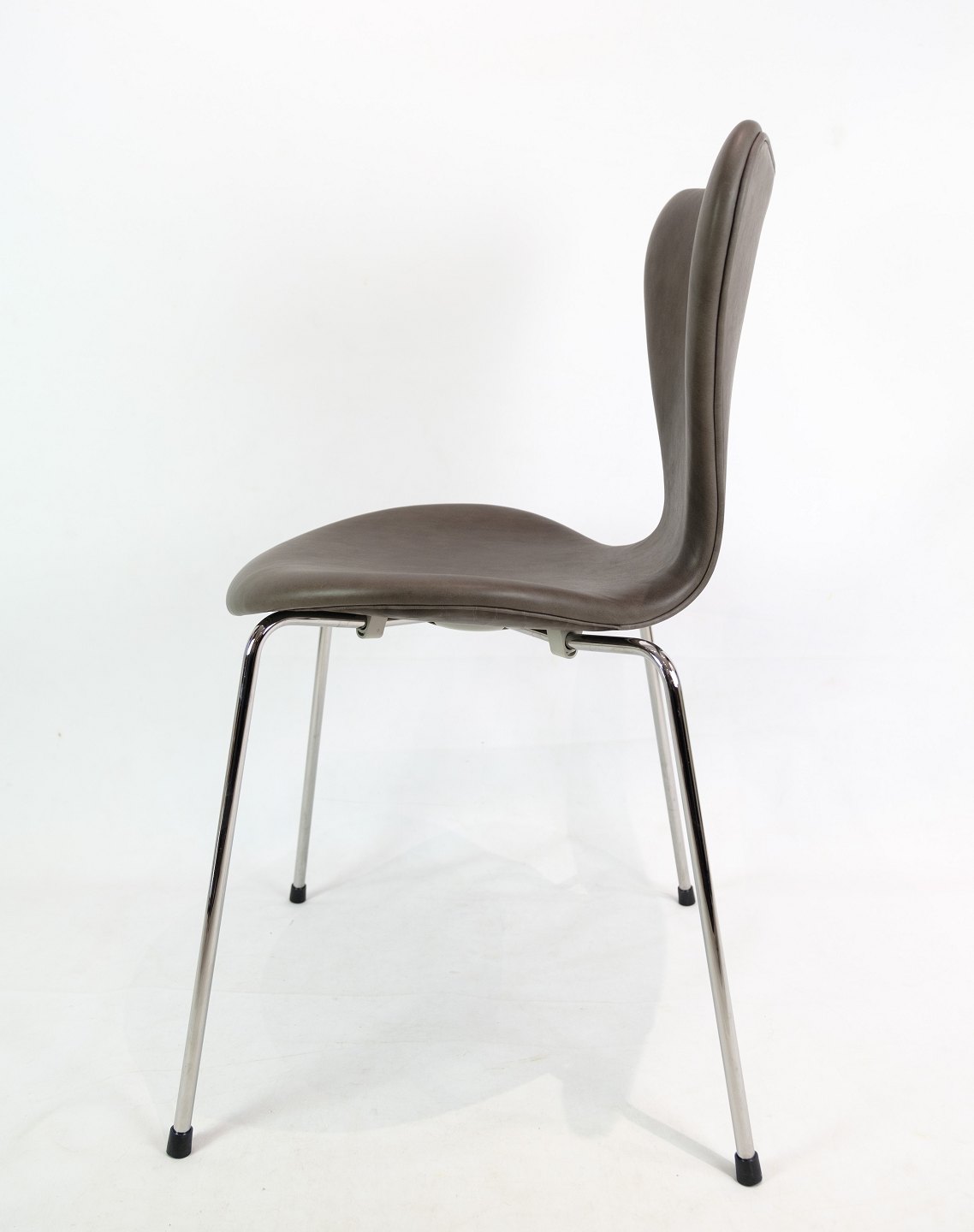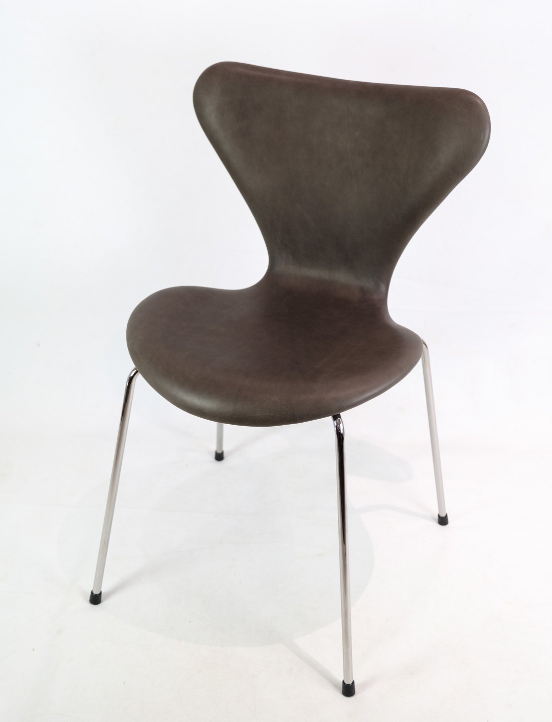 A set of 2 Seven chairs, model 3107, designed by Arne Jacobsen and manufactured by Fritz Hansen. The chairs are upholstered in gray patinated classic leather. We can upholster more on request.