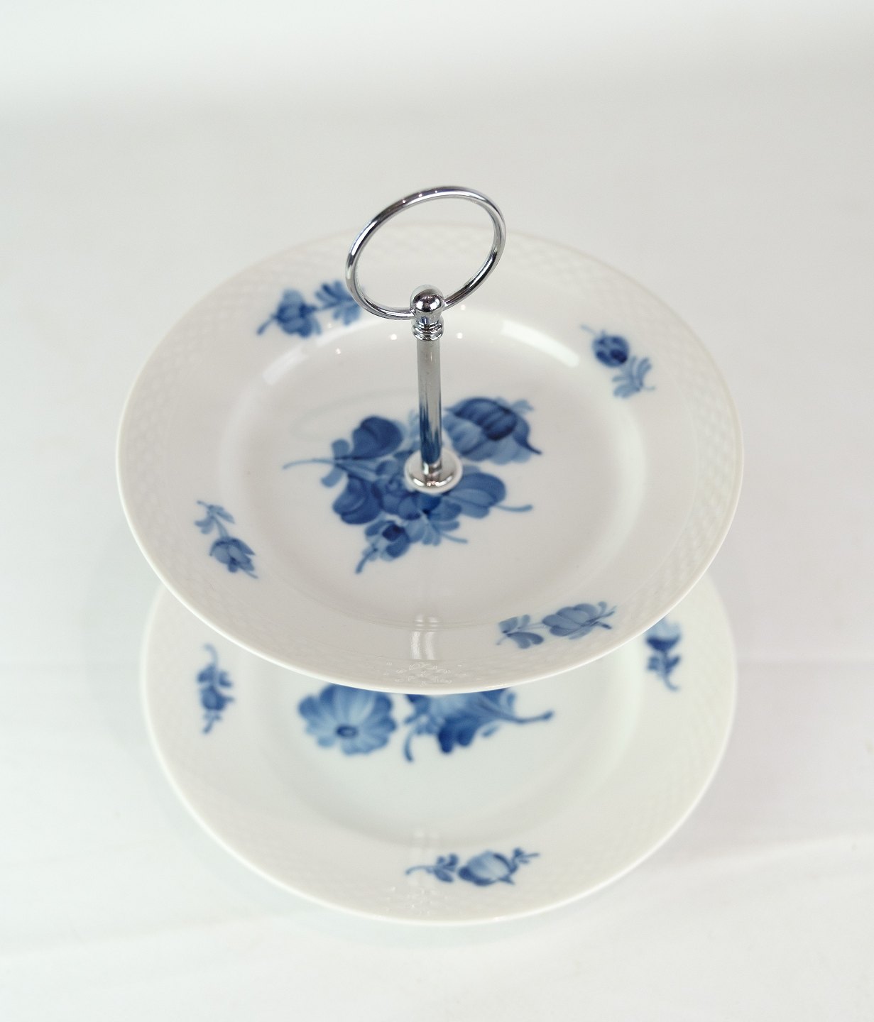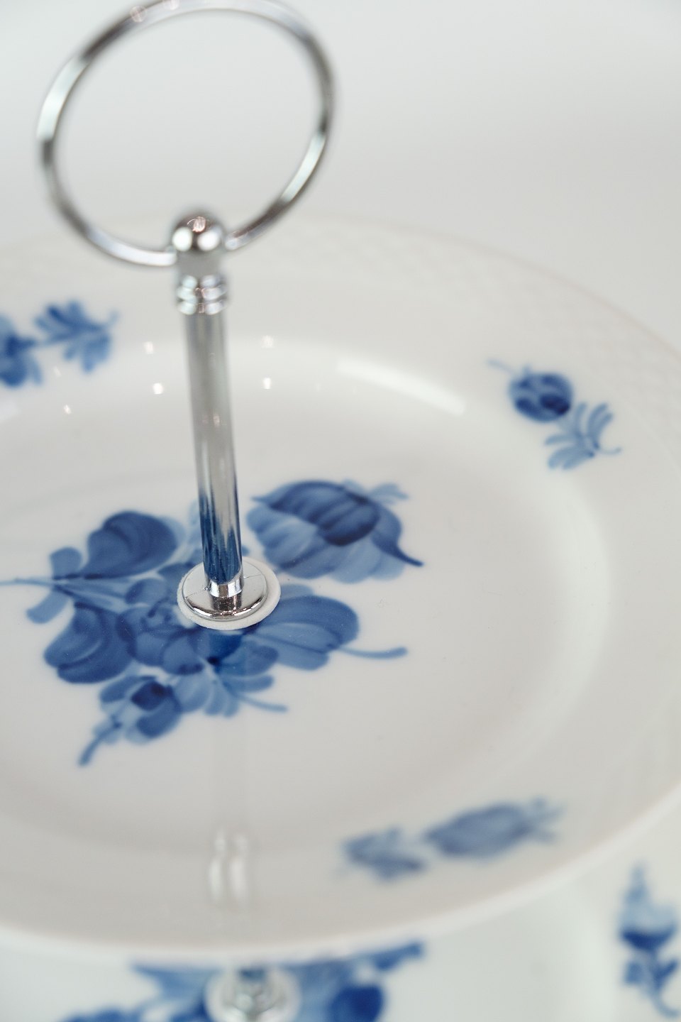 Kongelig todelt kage opsats i blå blomst flettet nr. 10/8094. Står i fin stand uden skader.