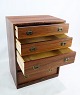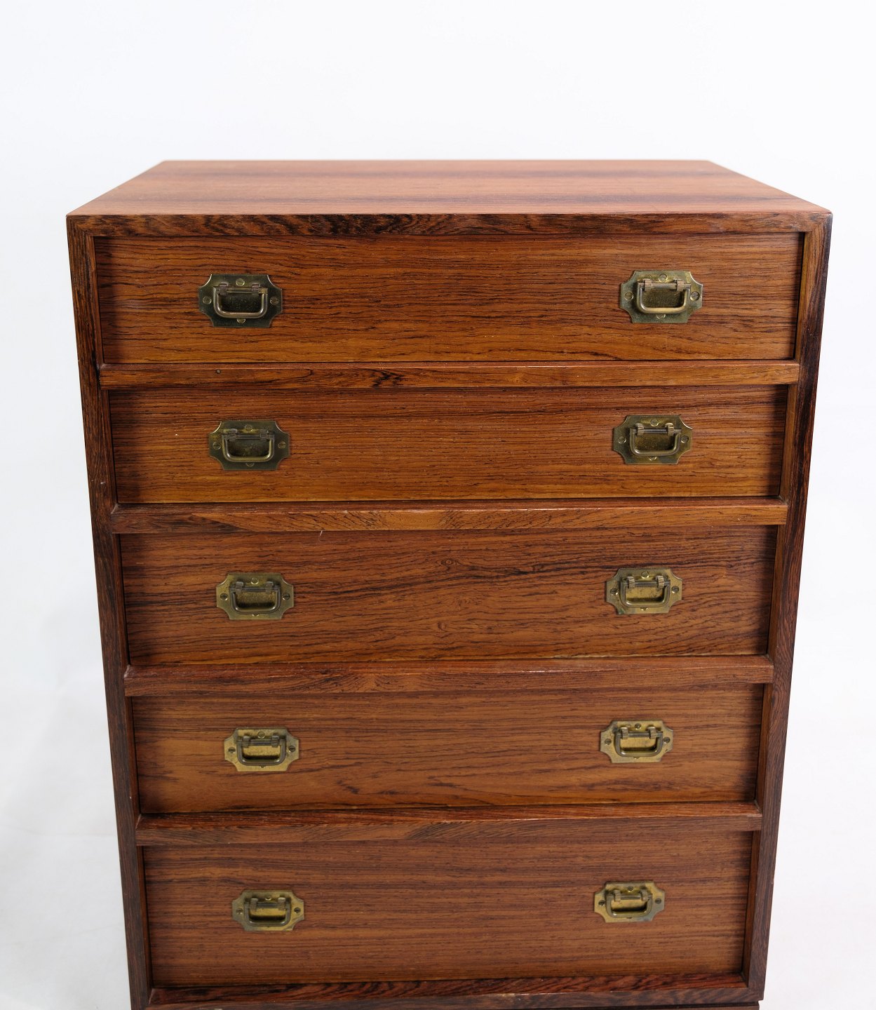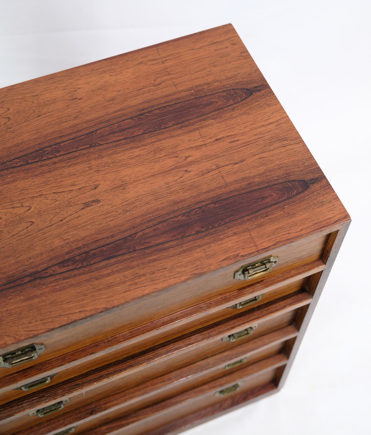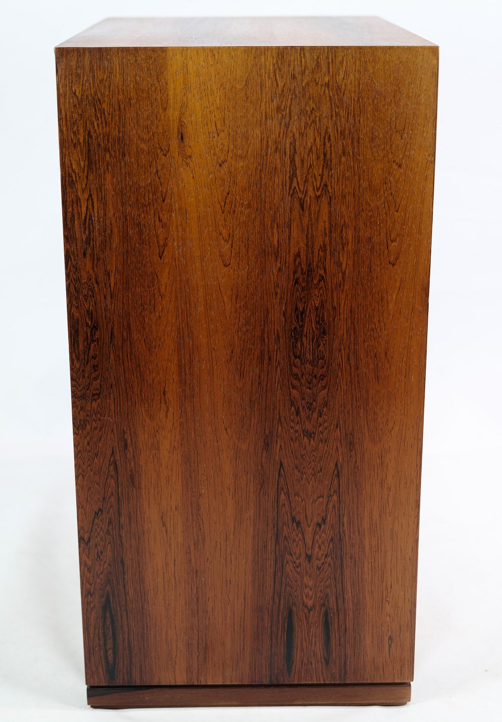 SolgtDette sæt af to kommoder, designet af Henning Korch, er fremstillet i palisandertræ og udgør en elegant og funktionel tilføjelse til ethvert rum. Hver kommode har fem rummelige skuffer med messinggreb, der tilføjer et subtilt touch af luksus til designet. Palisandertræets naturlige varme og smukke tekstur kombineres med den tidløse æstetik og håndværksmæssige kvalitet, som er karakteristisk for Henning Korch's designs. Fremstillet hos Silkeborg Møbelfabrik, er disse kommoder ikke kun smukke, men også holdbare og funktionelle, hvilket gør dem til en værdsat tilføjelse til enhver indretning.