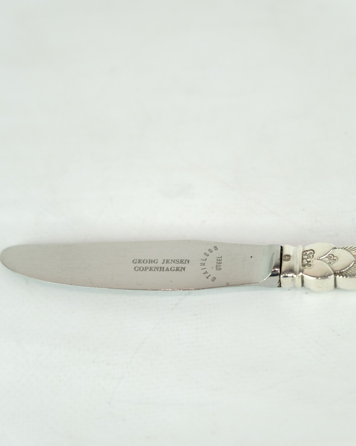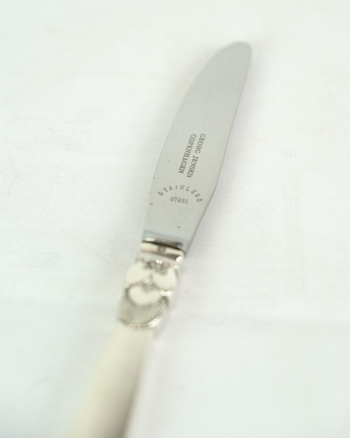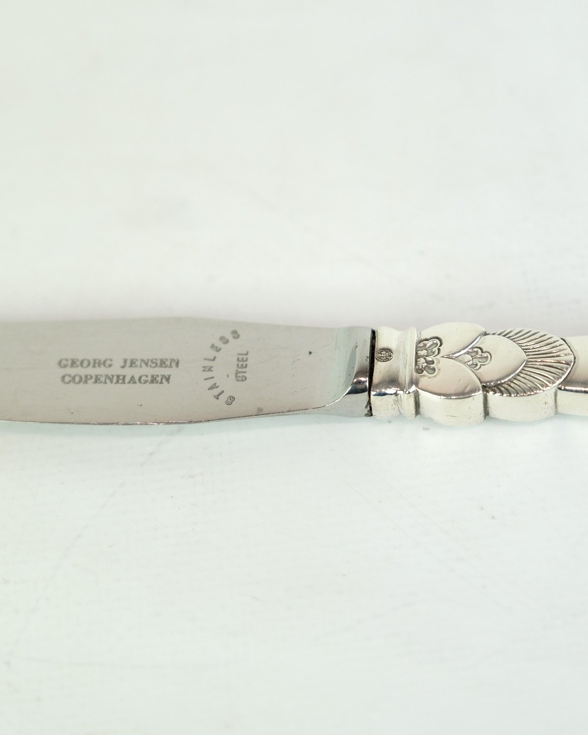 This Kaktus dinner knife is a beautiful and functional addition to your dining table. Designed by Gundorph Albertus in 1930 and produced by Georg Jensen Sølvsmedie in Denmark, this knife is marked with the well-known Cactus pattern. Although in a nice used condition with normal signs of use, it will still bring a touch of elegance to your next dinner. Our stock is limited, so please inquire about available quantities.