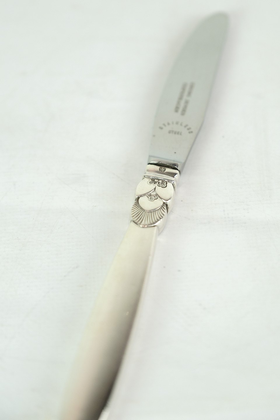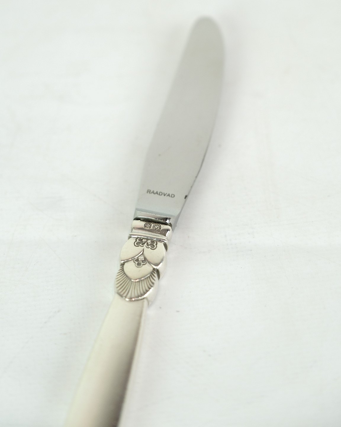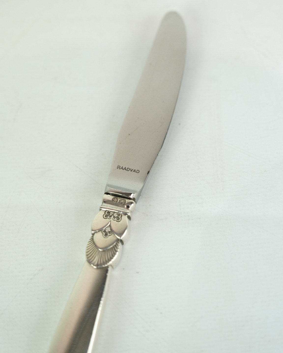 This Kaktus dinner knife is a beautiful and functional addition to your dining table. Designed by Gundorph Albertus in 1930 and produced by Georg Jensen Sølvsmedie in Denmark, this knife is marked with the well-known Cactus pattern. Although in a nice used condition with normal signs of use, it will still bring a touch of elegance to your next dinner. Our stock is limited, so please inquire about available quantities.