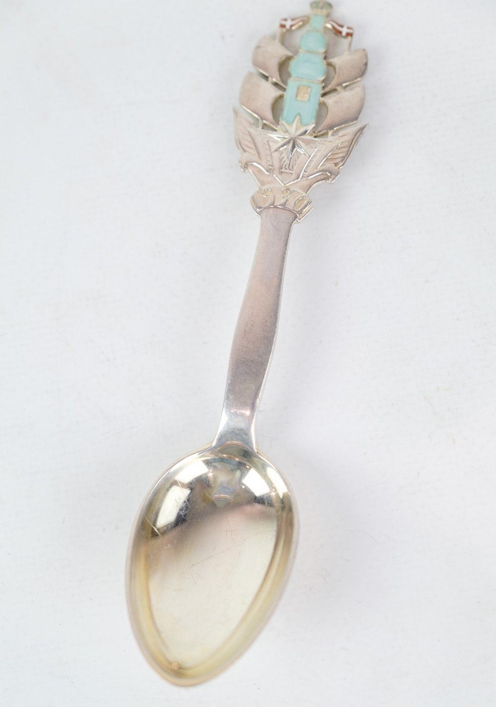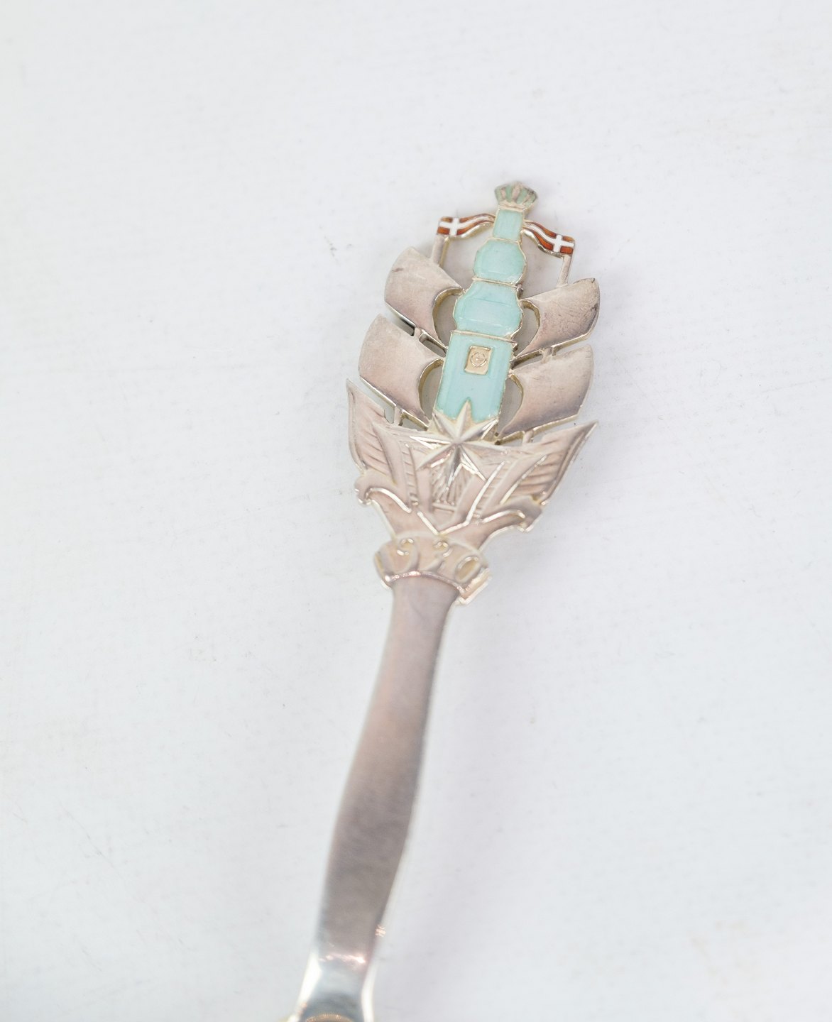 Jubilæumsske i tretårnet sølv med danske flag af meget god kvalitet. I fin brugt stand.