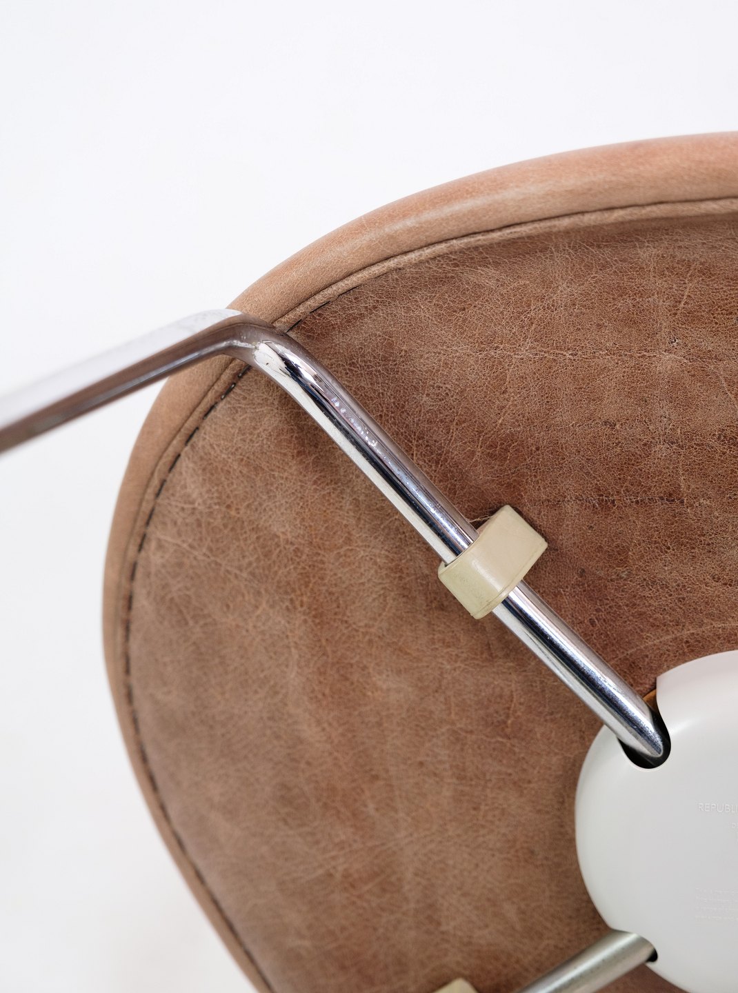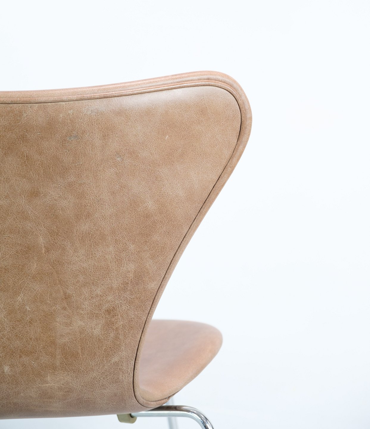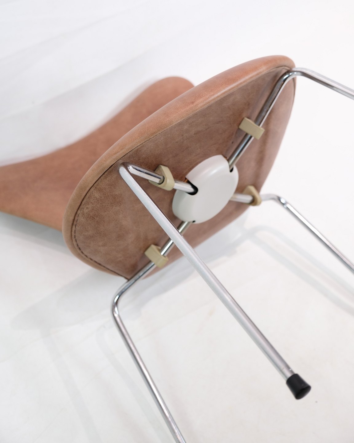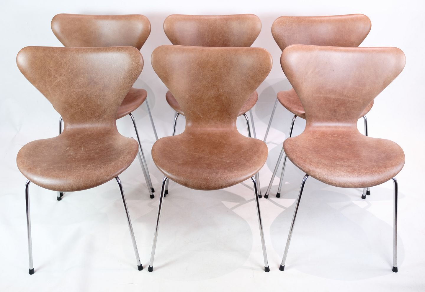 A set of 6 Seven chairs, model 3107, designed by Arne Jacobsen and manufactured by Fritz Hansen. The chairs are upholstered in light brown elegance leather and in very nice used condition with original patina.