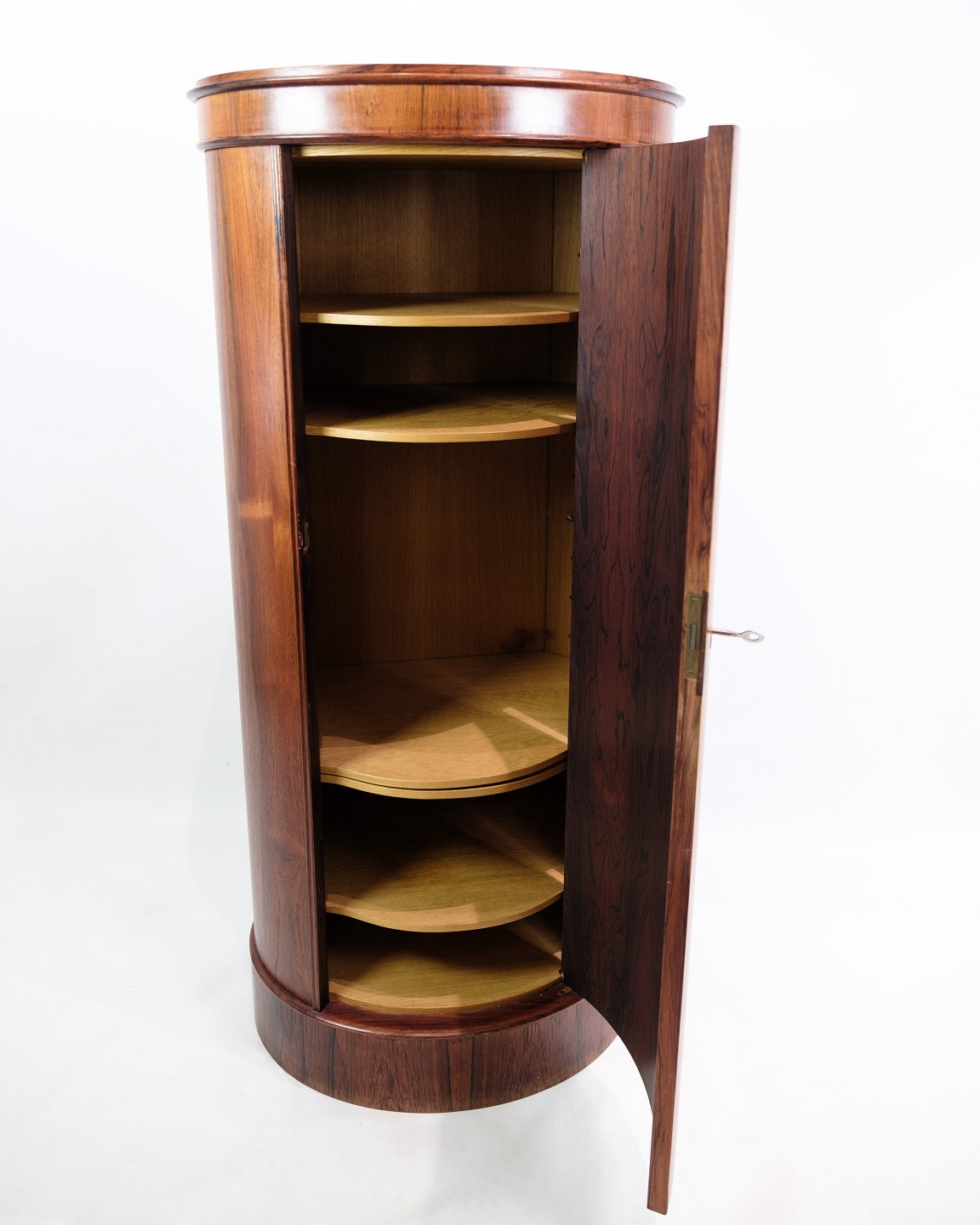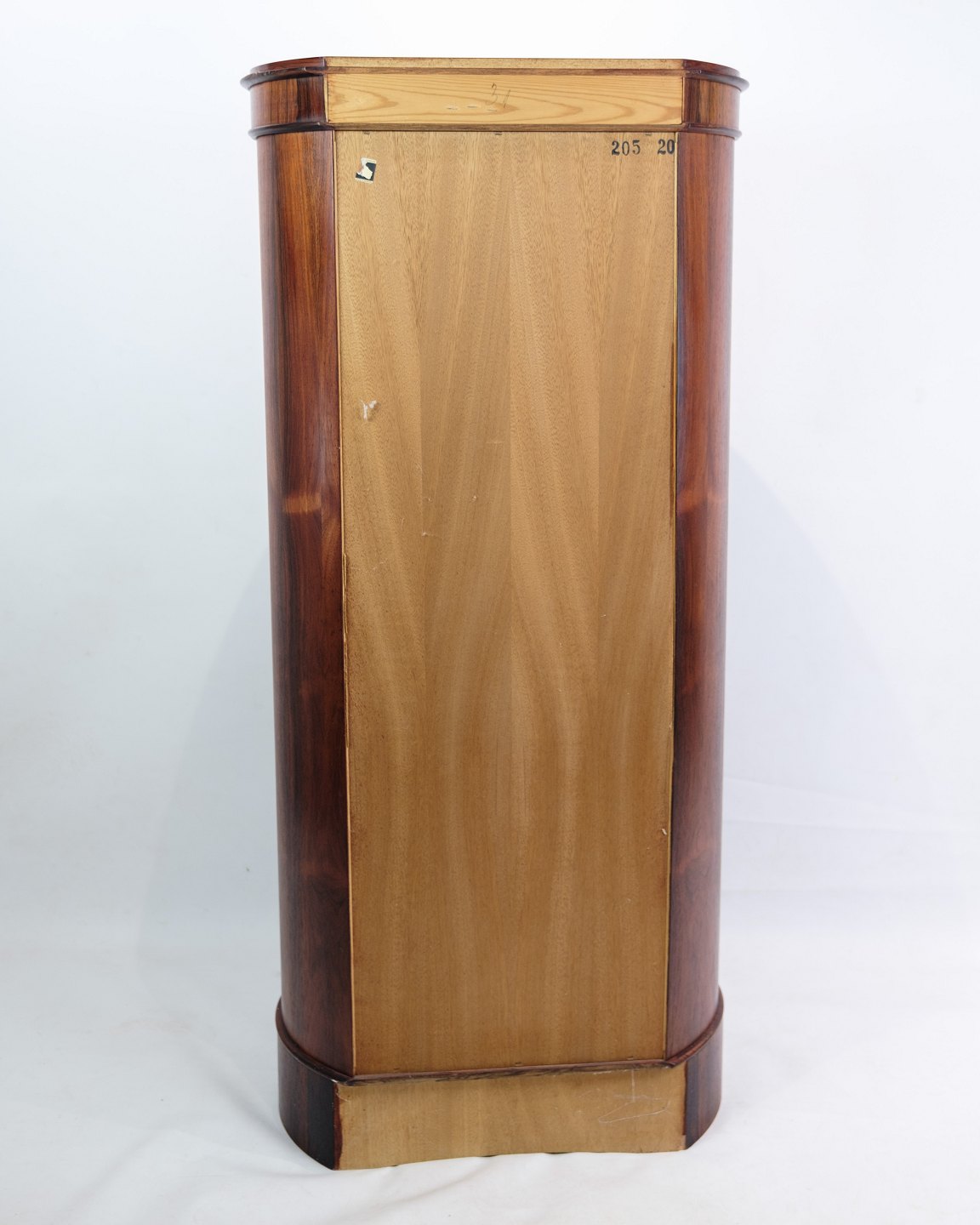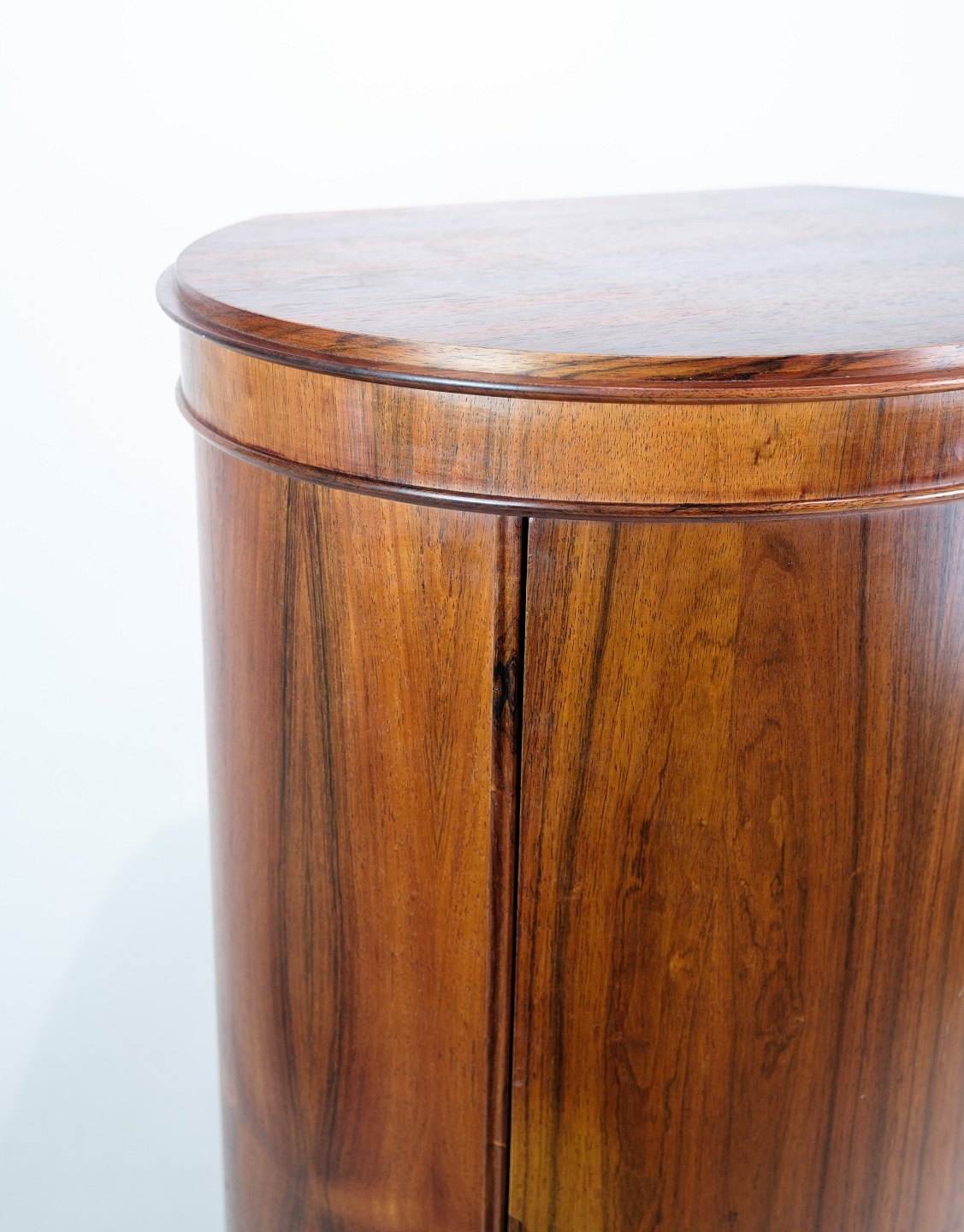 Dette smukke ovalt piedestalskab af palisander er designet af den anerkendte danske møbeldesigner Johannes Sorth, der var en del af Bornholms Møbelfabrik i Nexø i perioden fra 1955 til 1968.
