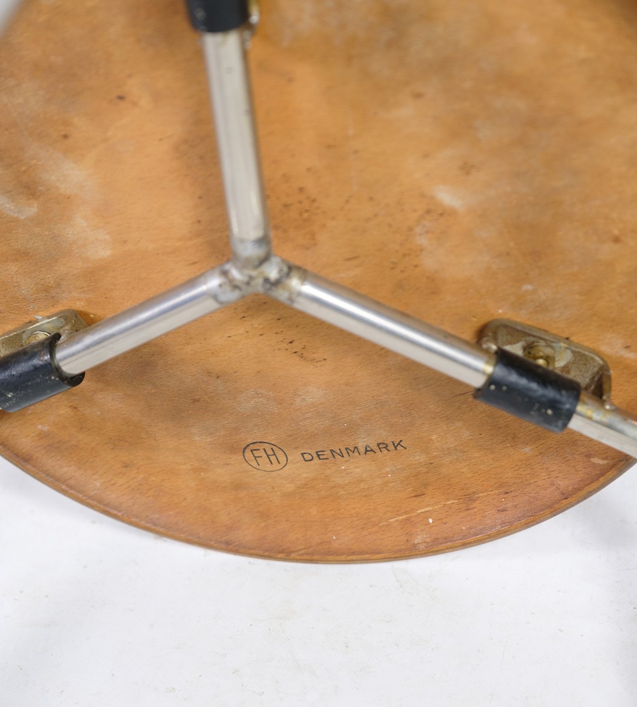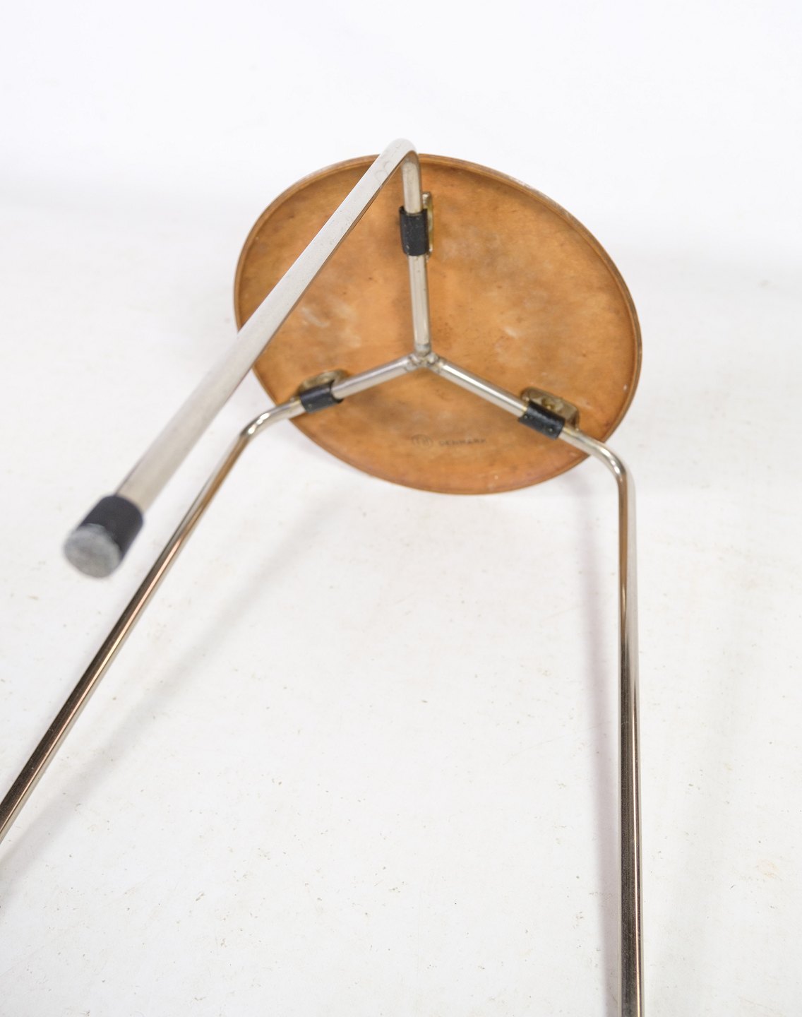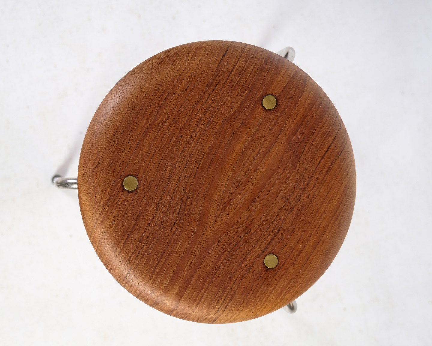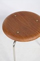 Stool with three legs, chrome-plated metal, teak veneer seat. Fritz Hansen, Arne Jacobsen, Early model. The 1960s.