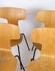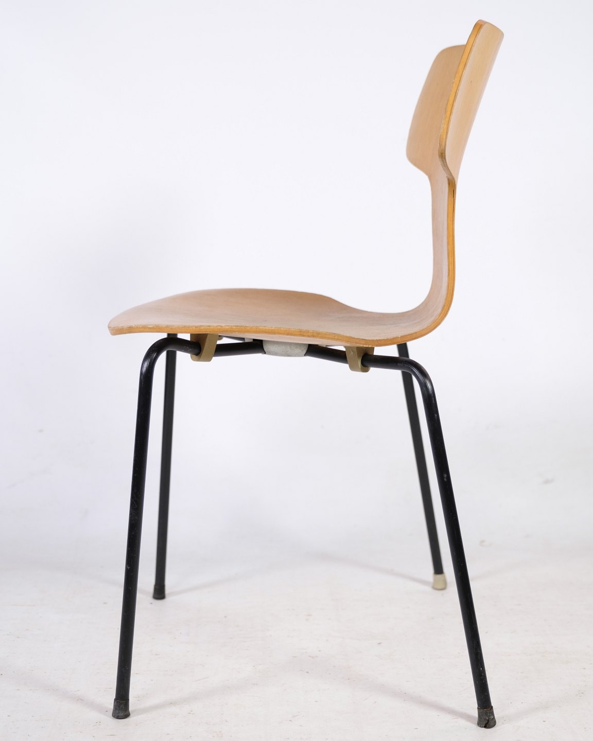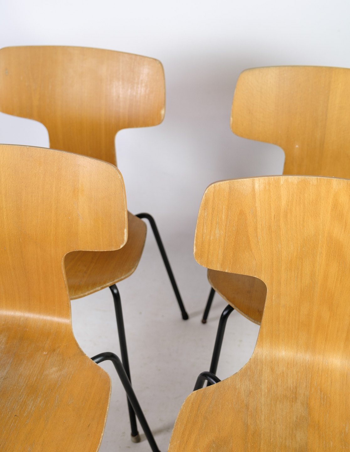 Set of four, model 3103, 'T-chair', by Arne Jacobsen 1902-1971 with bent veneered oak shell, black grooved rubber-wrapped steel tube frame. Manufactured at Fritz Hansen, 1960s. early model. Has traces of use, marks, edge wear. Can be made in a workshop before purchase. Send us a message. More sets in stock