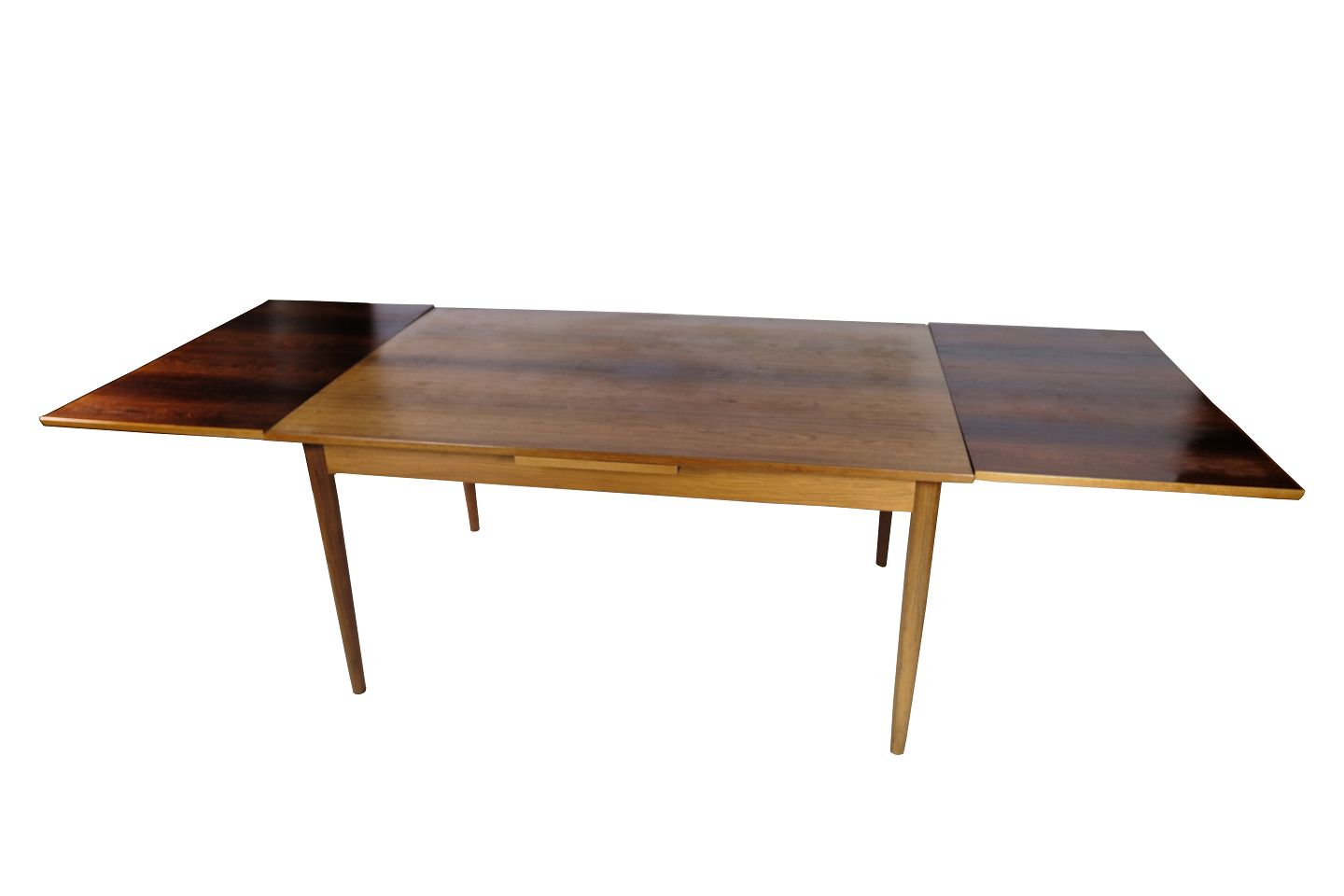 Spisebord af dansk møbelsnedker i palisander med hollandsk udtræk fra omkring 1960'erne. Toppladen kan slibes ned og laves samme farve som tillægsplader inkluderet i prisen.