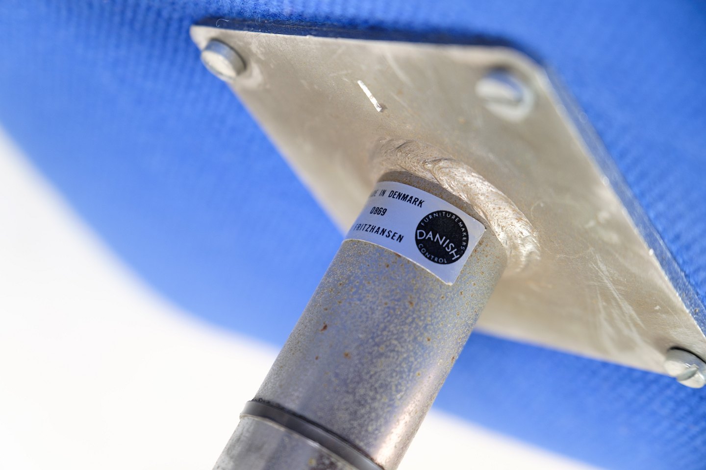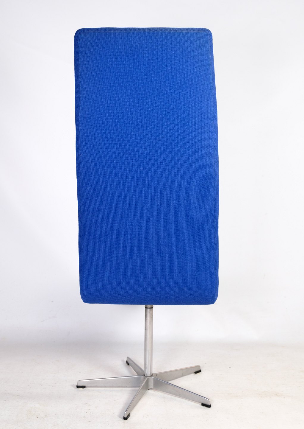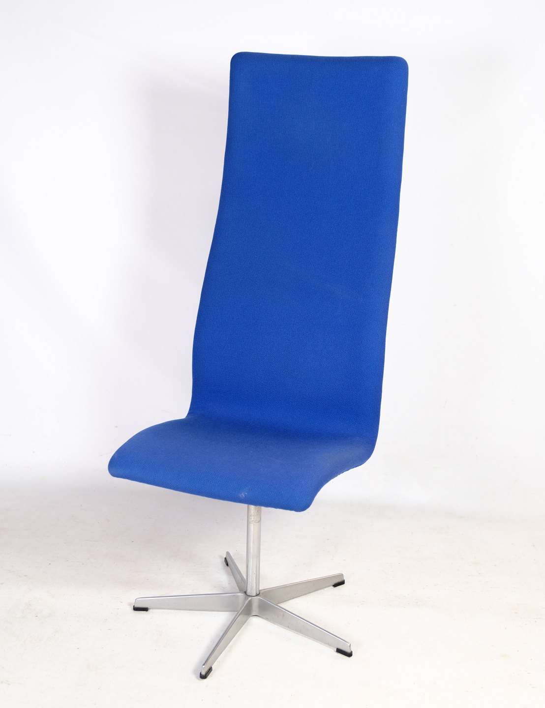 SolgtSæt af 6 oxford stole, designet af Arne Jacobsen og produceret hos Fritz Hansen. En eksklusiv udgave med en høj ryg og 5 benet metal fod. Stolene er polstret i flot blåt stof og vil blive grundigt renset på vores værksted inden levering. Stoffet står pænt med normalt brugsspor.