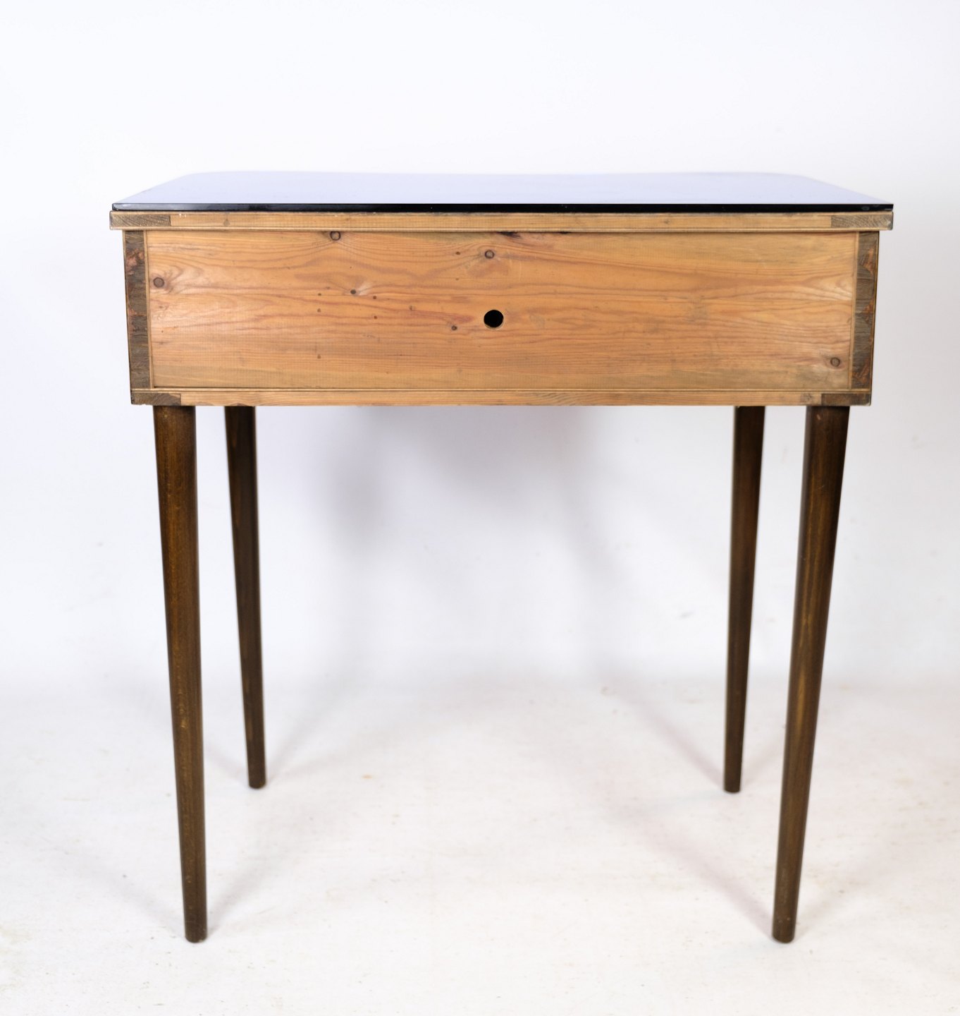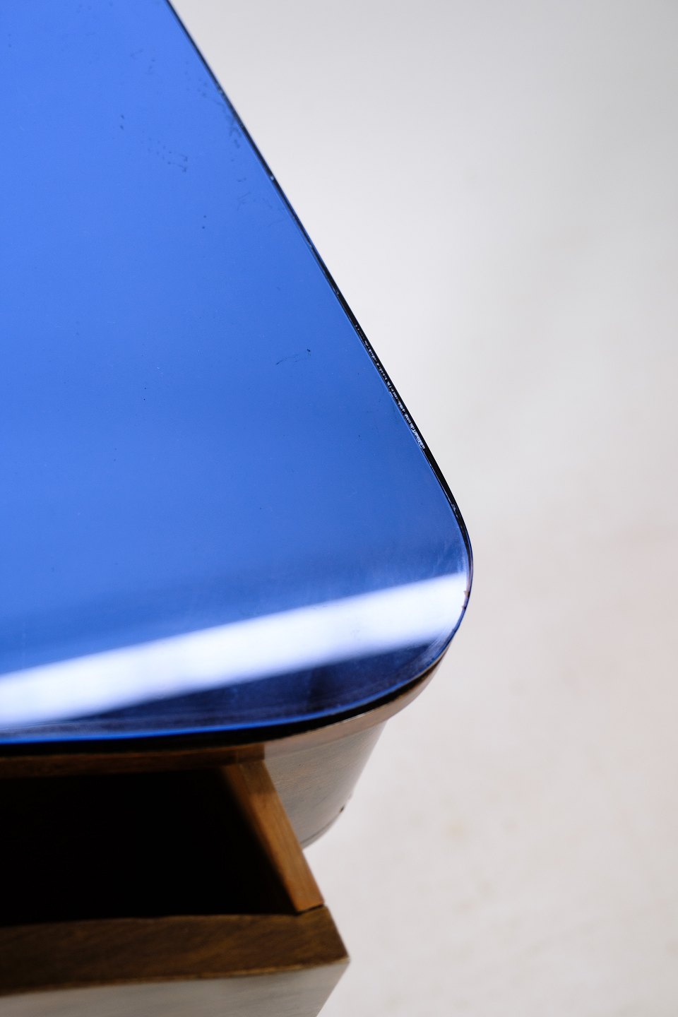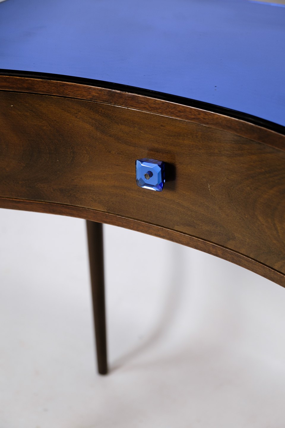 SoldSmall lady's desk / side table in mahogany with blue glass leaves and handles on drawer from around the 1920s.