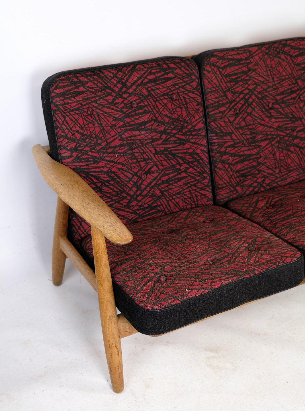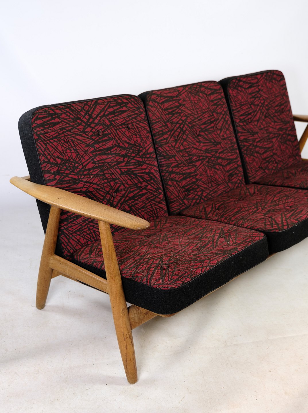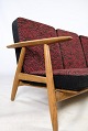 3-person sofa, Model GE 240/ 3, designed by Hans J. Wegner in oak with black and reddish decorated cushions from the 1960s.