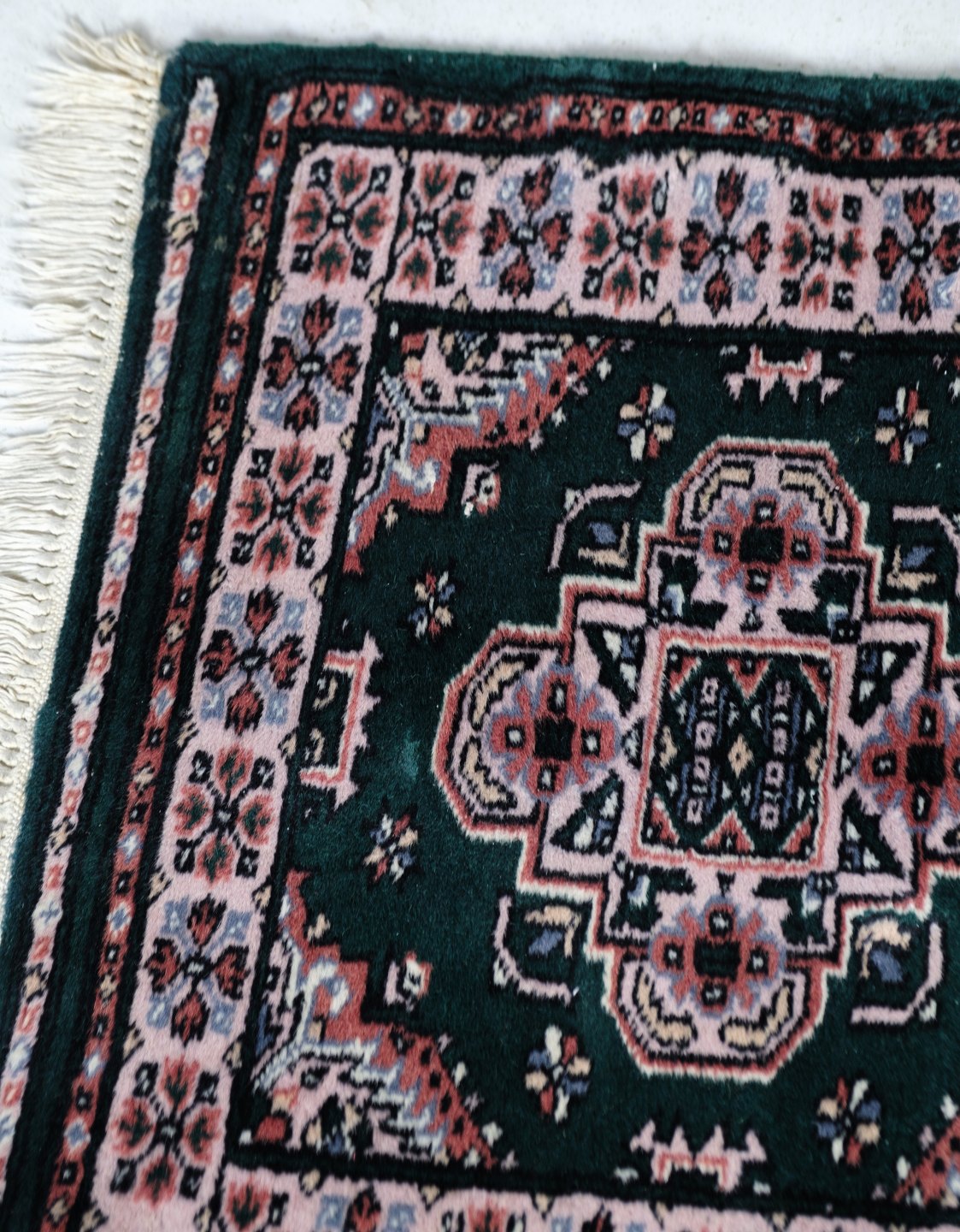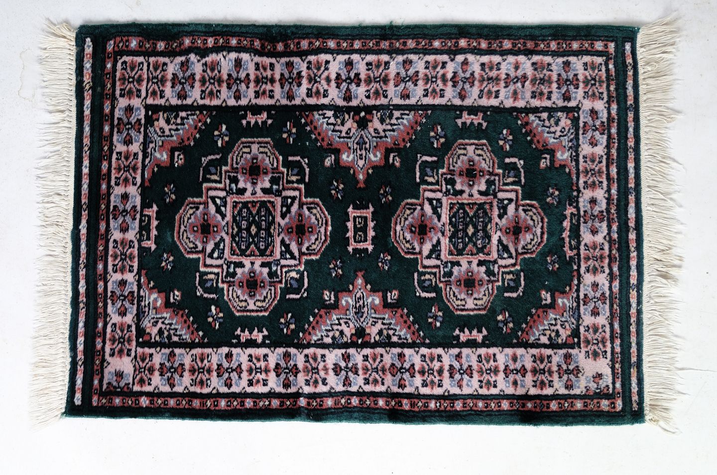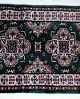 Et ægte persisk tæppe fremstillet i hånden mønstret og indfarvet med grønnelige farver.