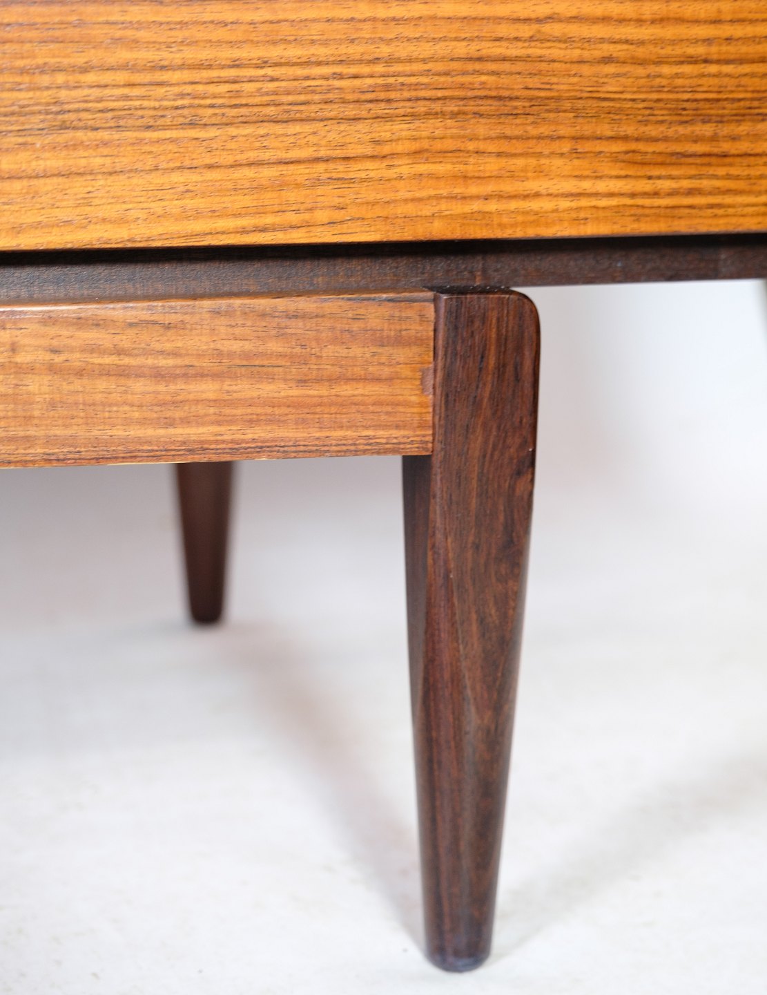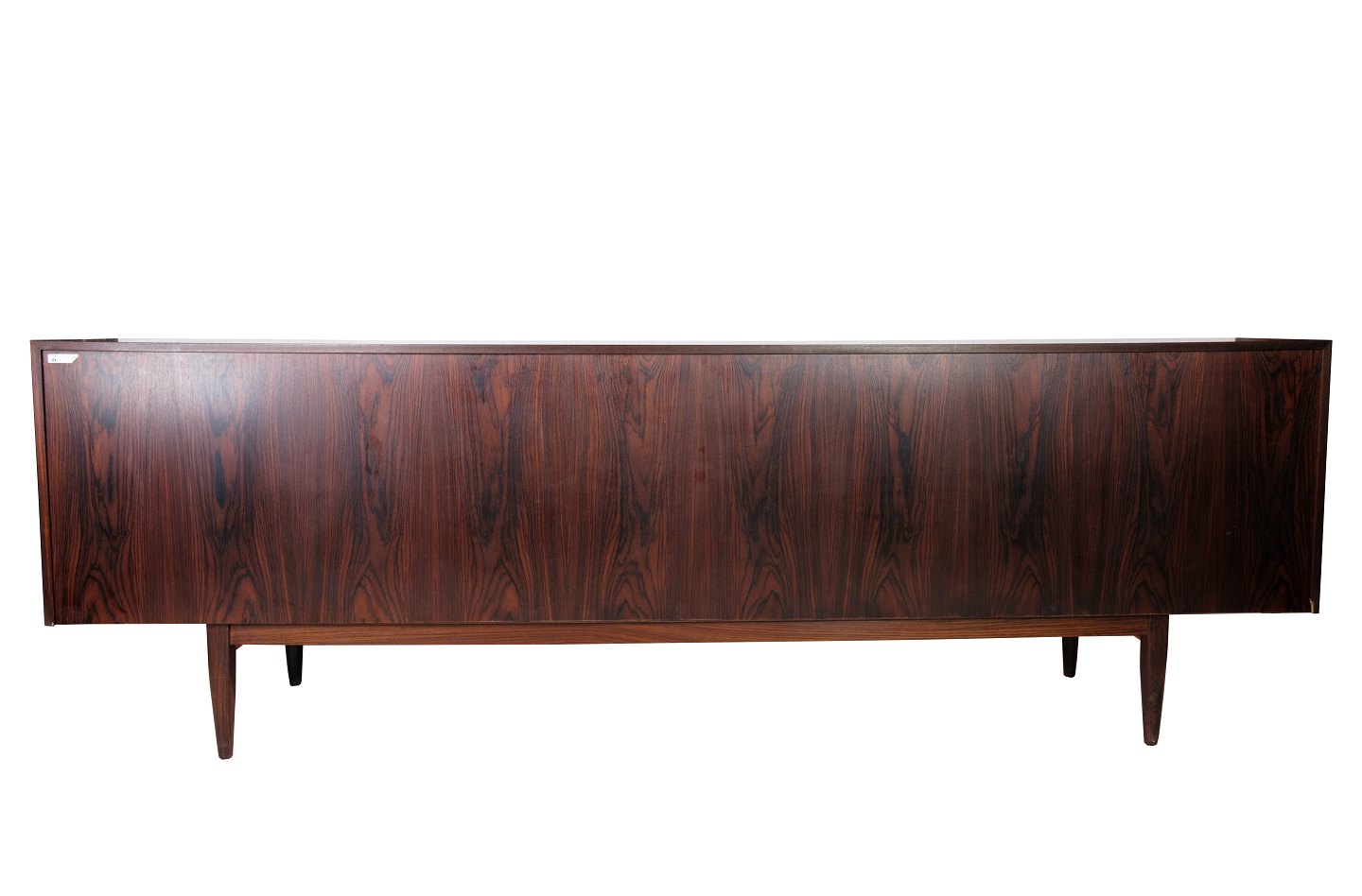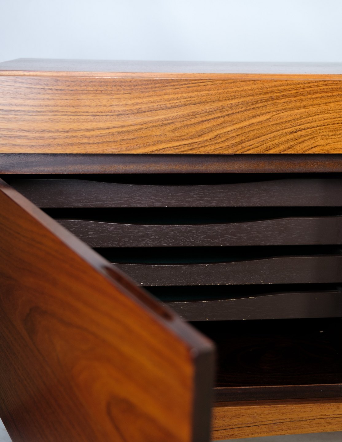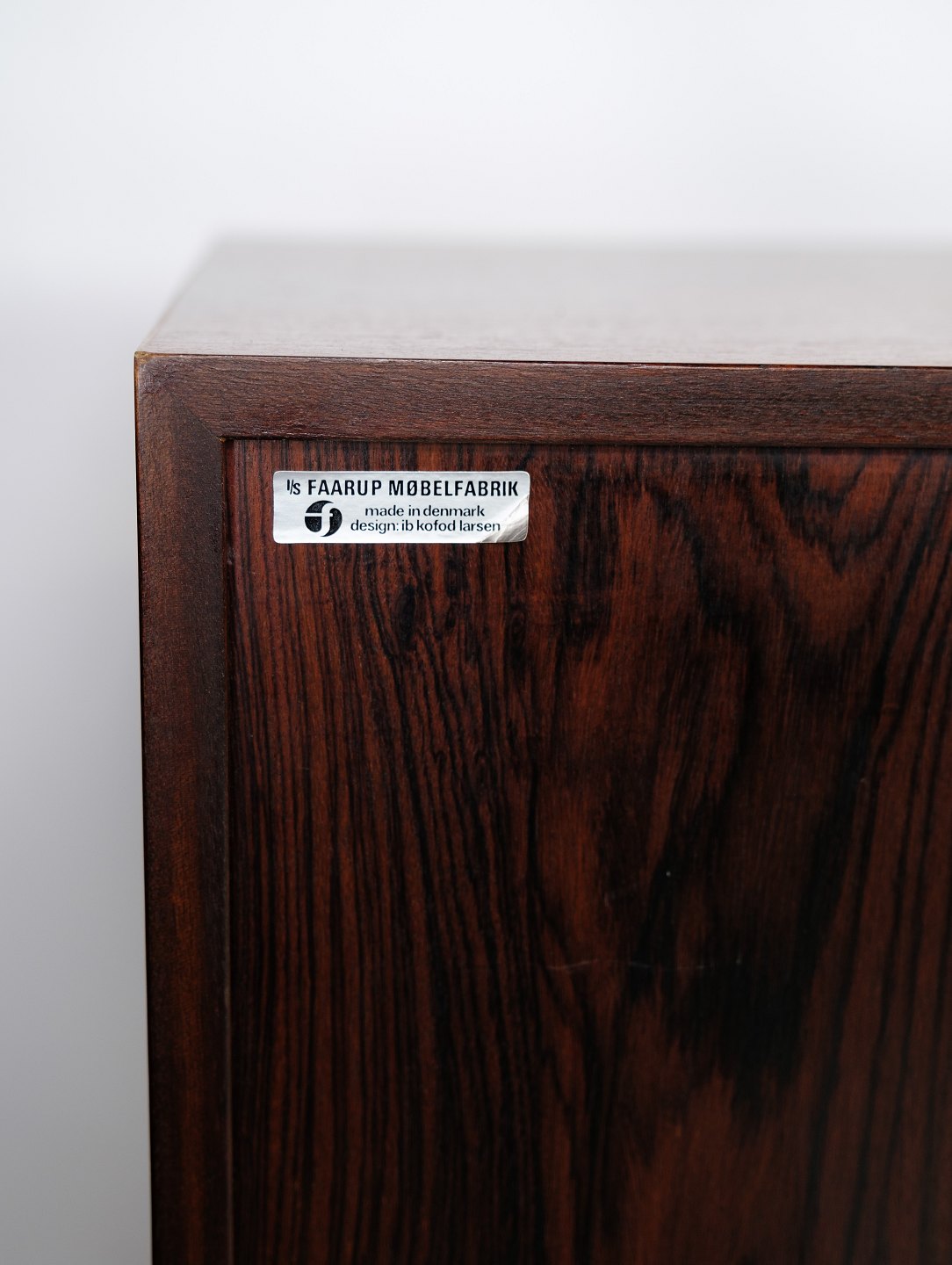 SolgtSkænk i palisander designet af Ib Kofod-Larsen, model FA66 fremstillet hos Faarup Møbelfabrik i 1960'erne. En lav fritstående skænk af den højeste kvalitet. Den er fineret med palisander med en meget smuk struktur. I fronten har den fire skuffer, samt fire låger, hvor der er både hylder og udtræksbakker.
