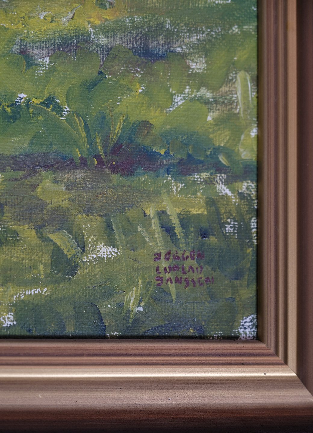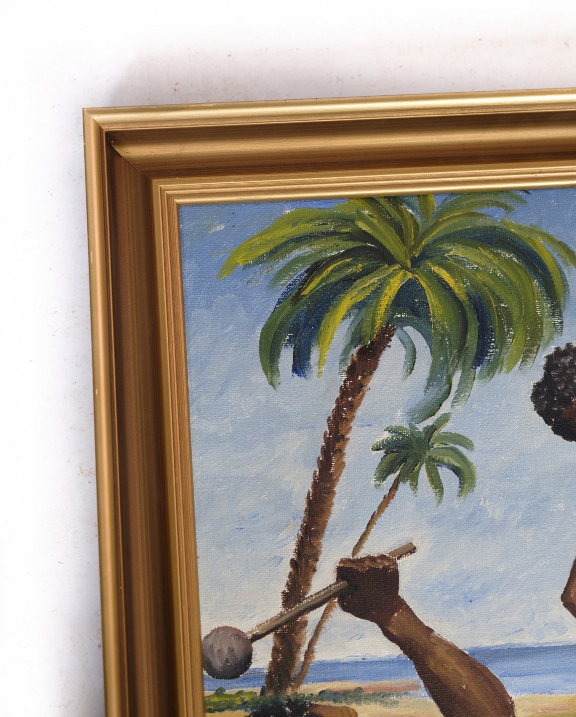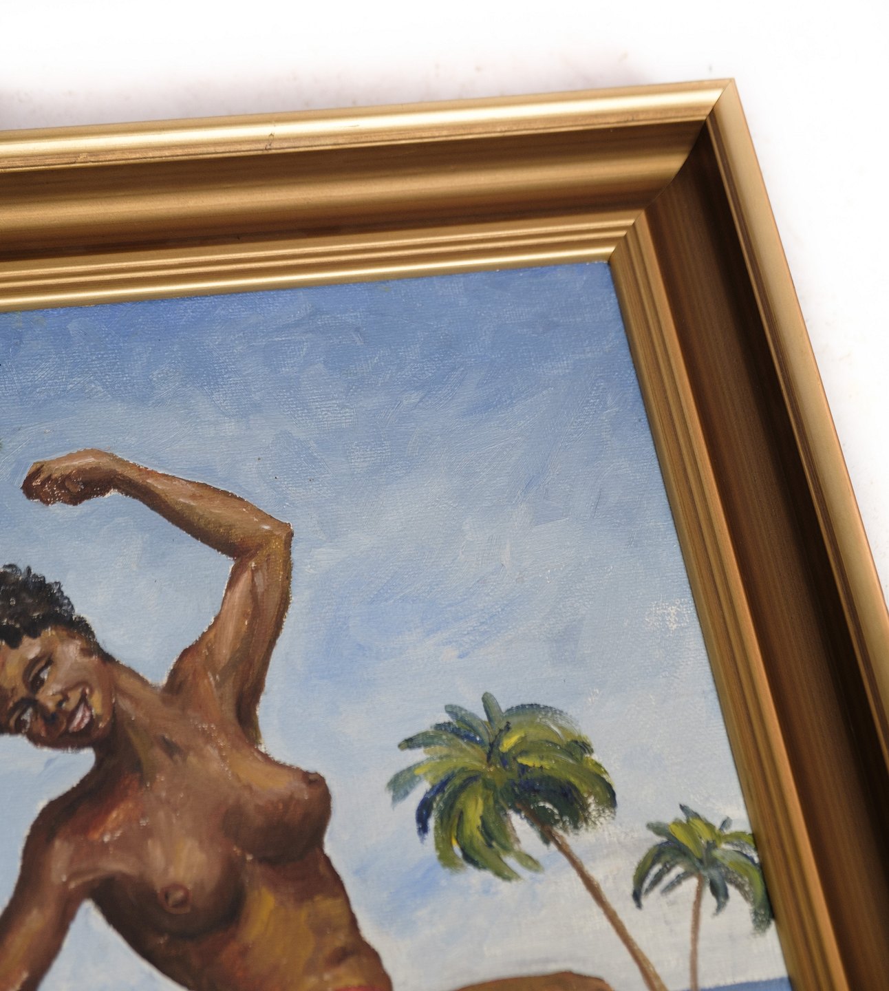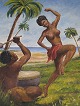 Maleri på lærredet, i guldramme af tropisk miljø i grønne og blå farver malet af Jørgen Luplau Janssen fra omkring 1930'erne.
