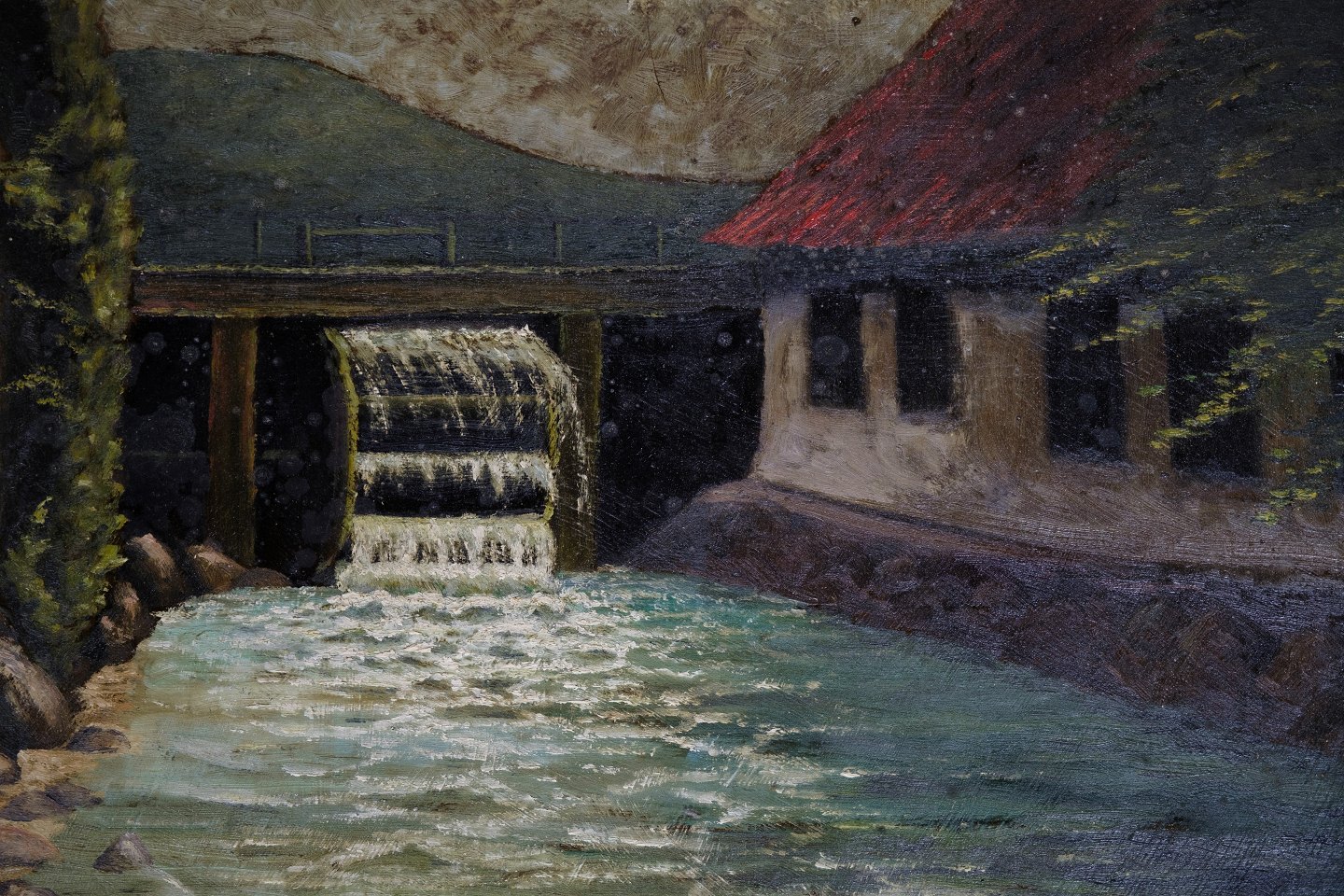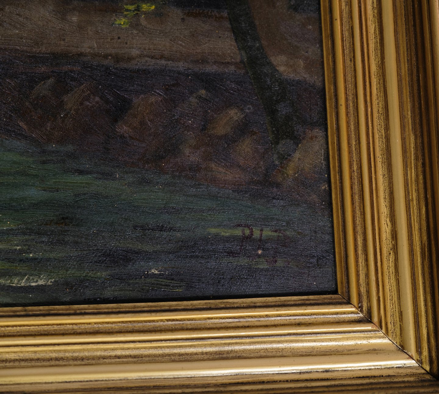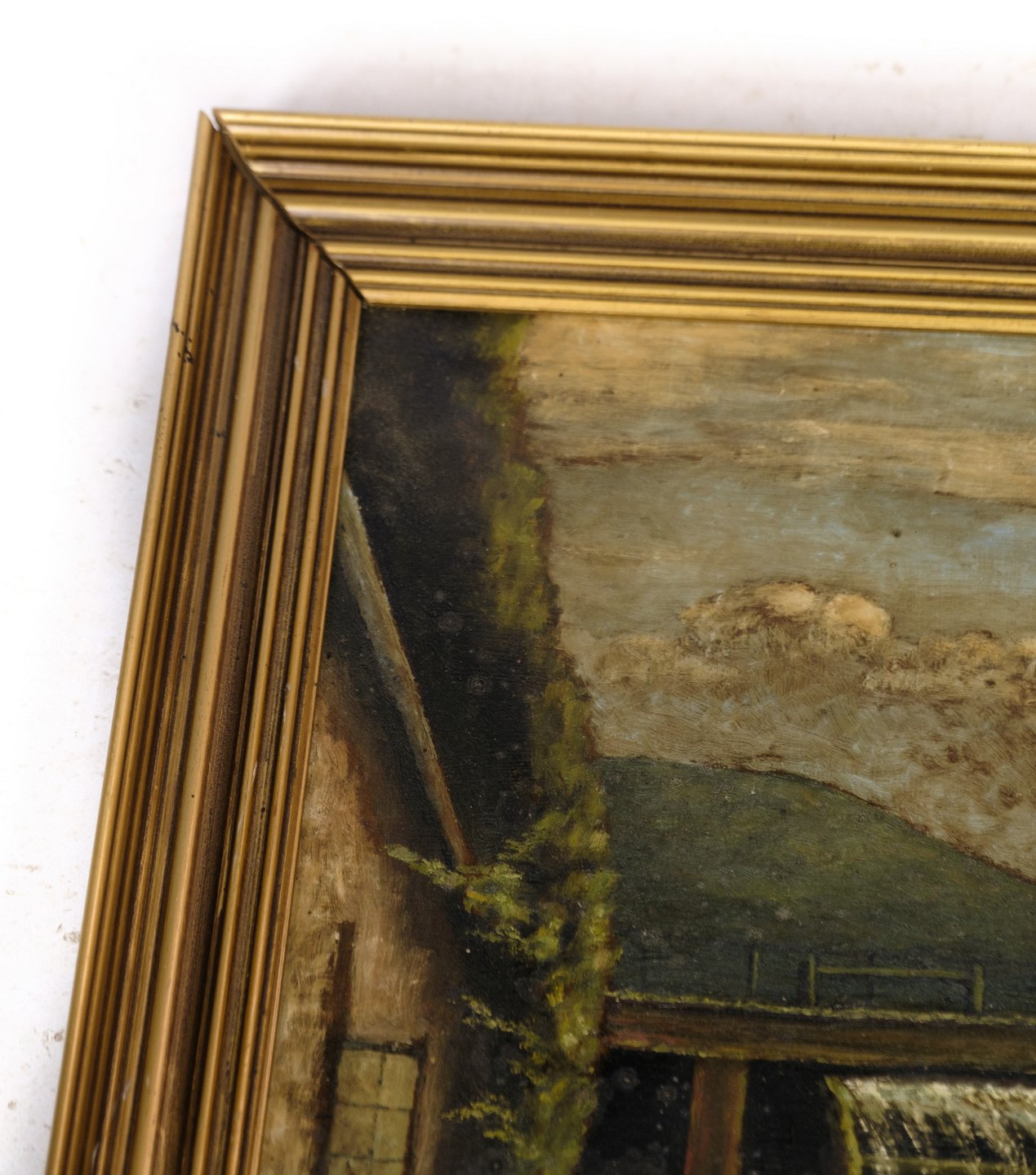 Painting on canvas in gold frame of town house and water in blue colors from around the 1930s.