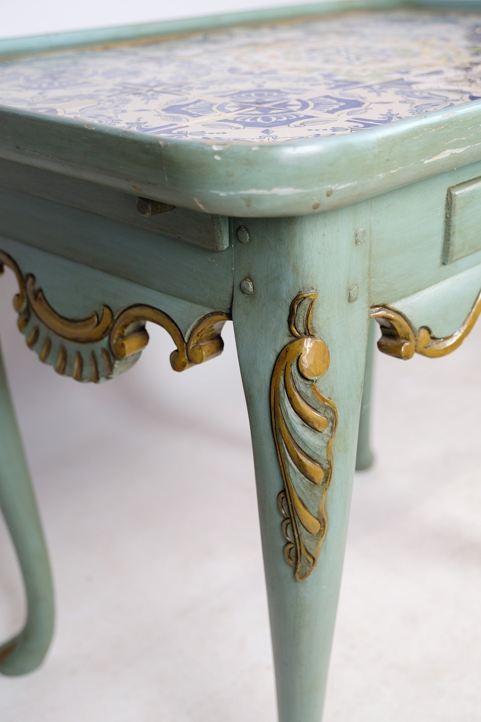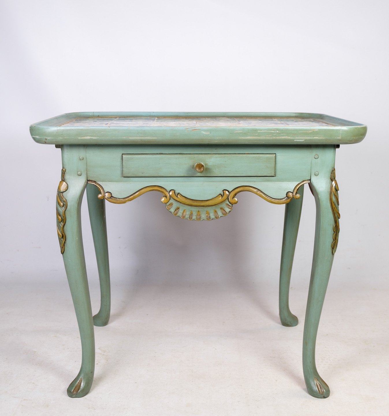 Painted rococo shaped tile table decorated with various motifs. The table is from the 1780s and is in beautiful antique condition.