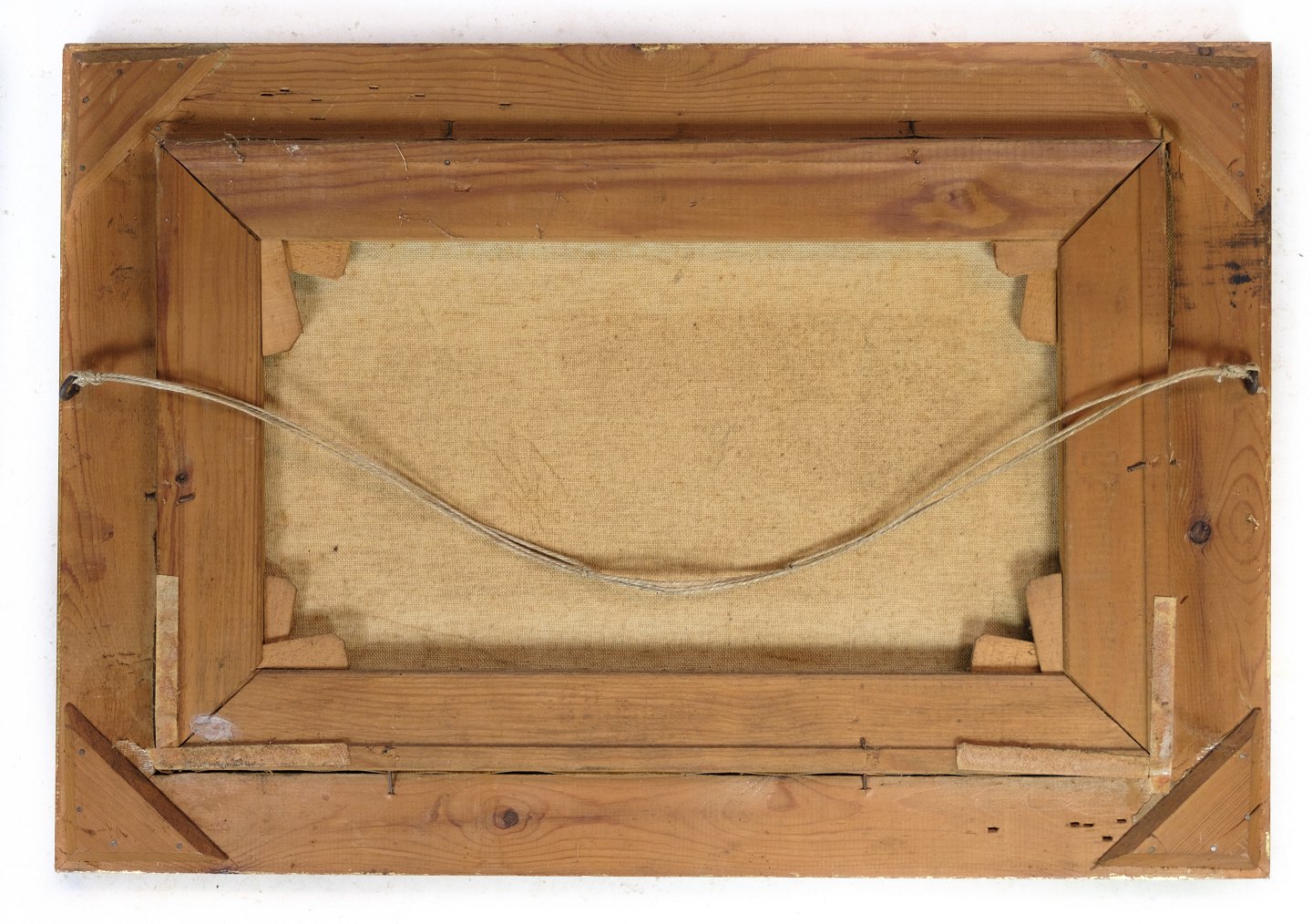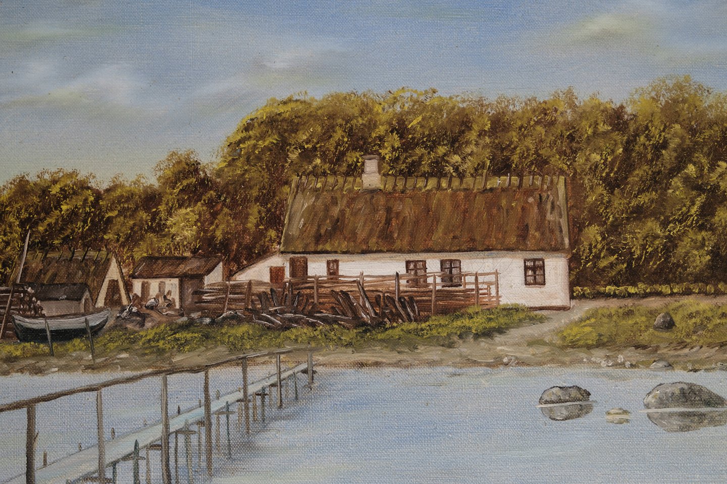 Painting on the canvas in an antique frame of a farmhouse and water from around the 1930s