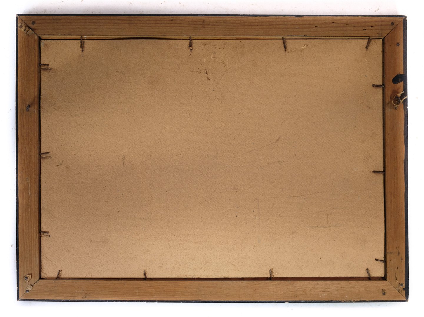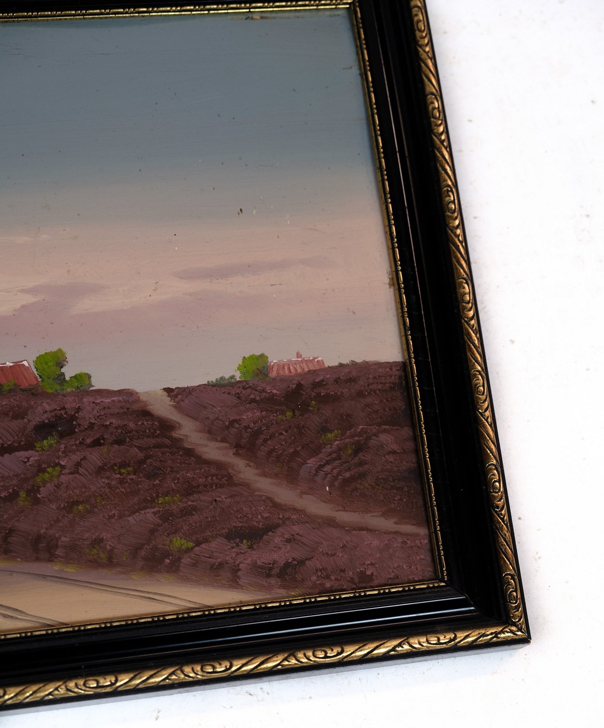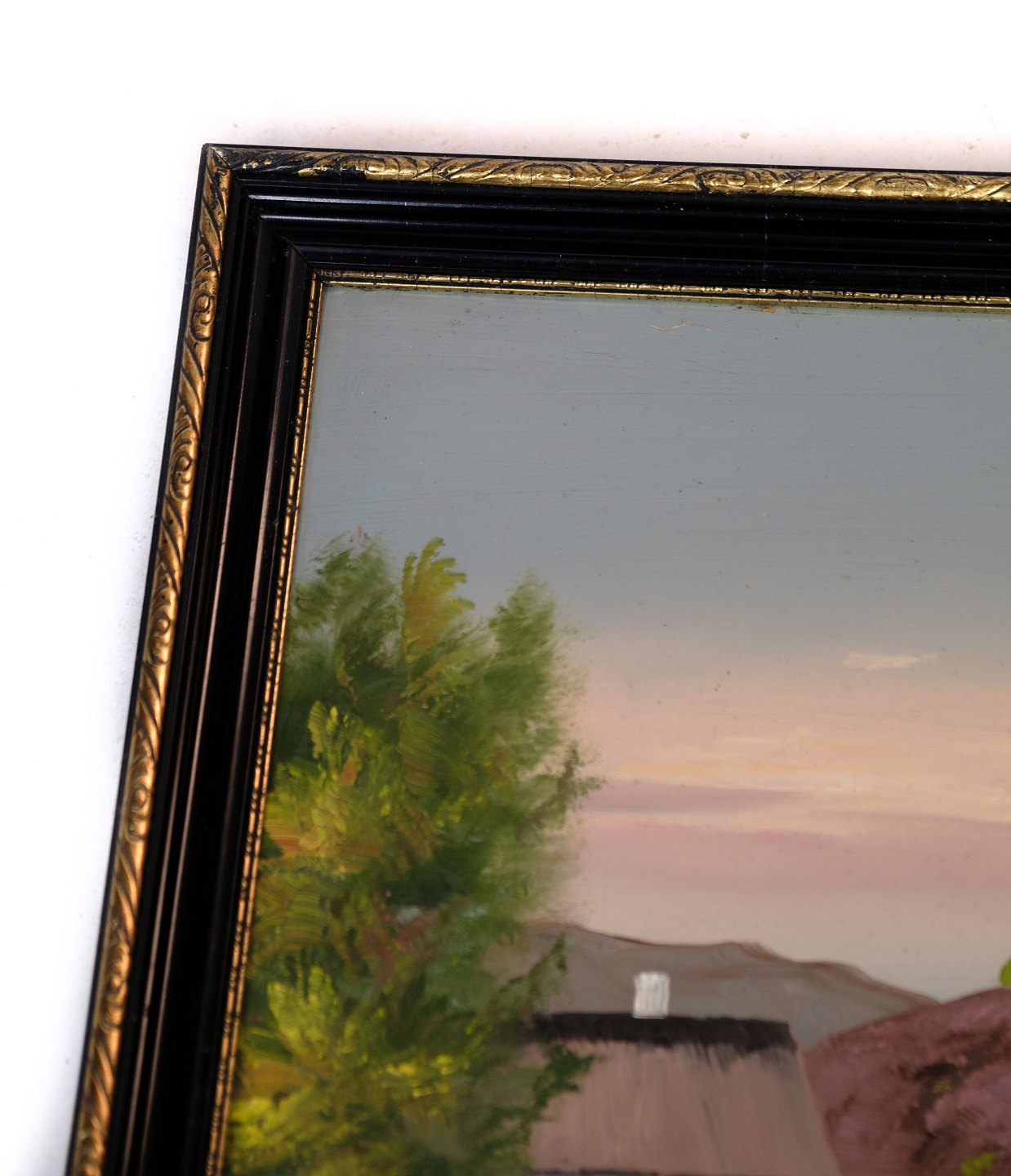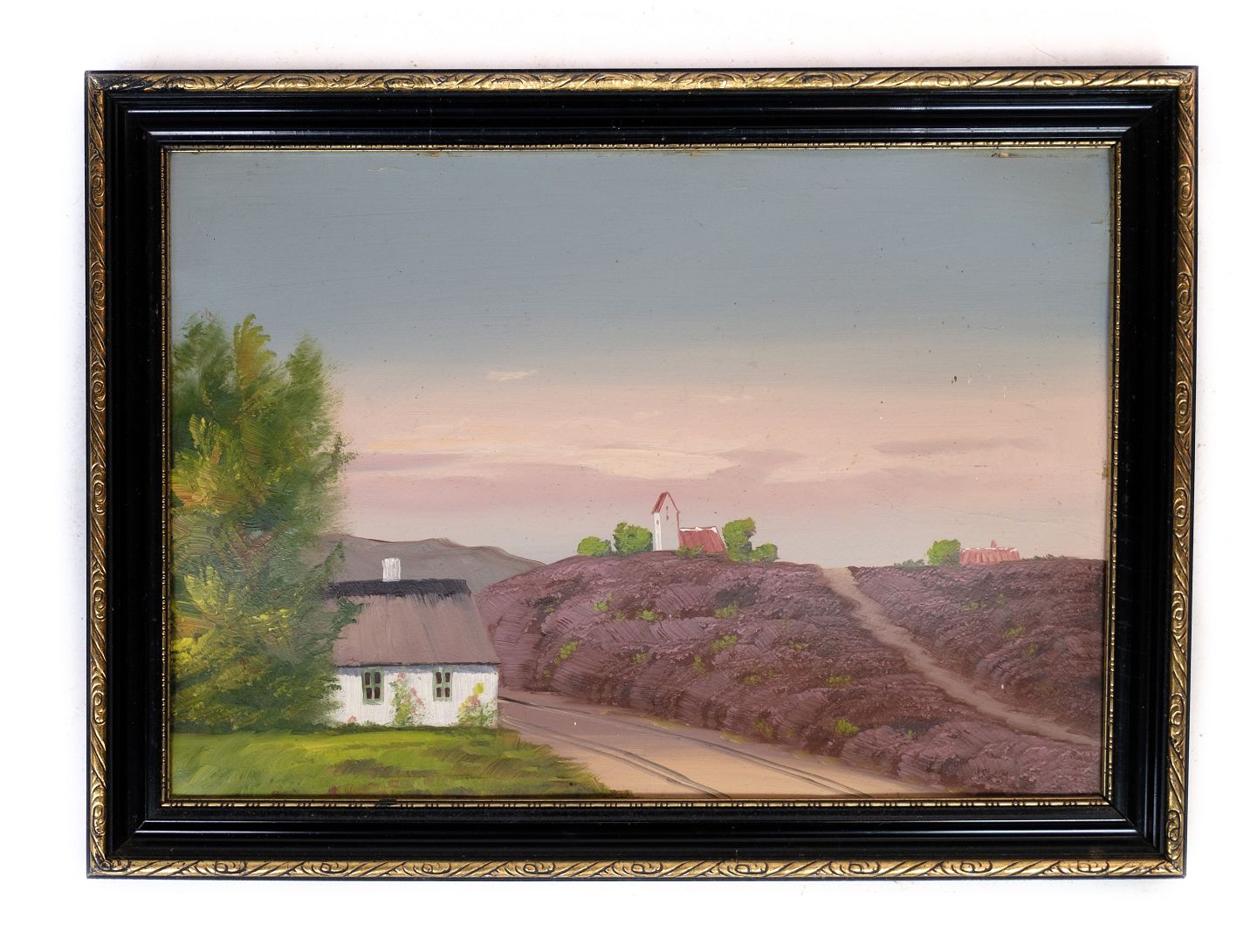 Maleri på træplade i antik ramme af små huse og natur fra omkring 1930'erne