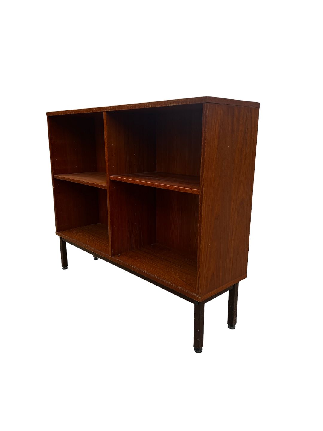 The warm colors and natural beauty of the teak add character to any room, while the slim metal legs give a light and airy look. With its timeless appeal, this bookcase will be an impressive and functional piece of furniture that will fit perfectly into any home.