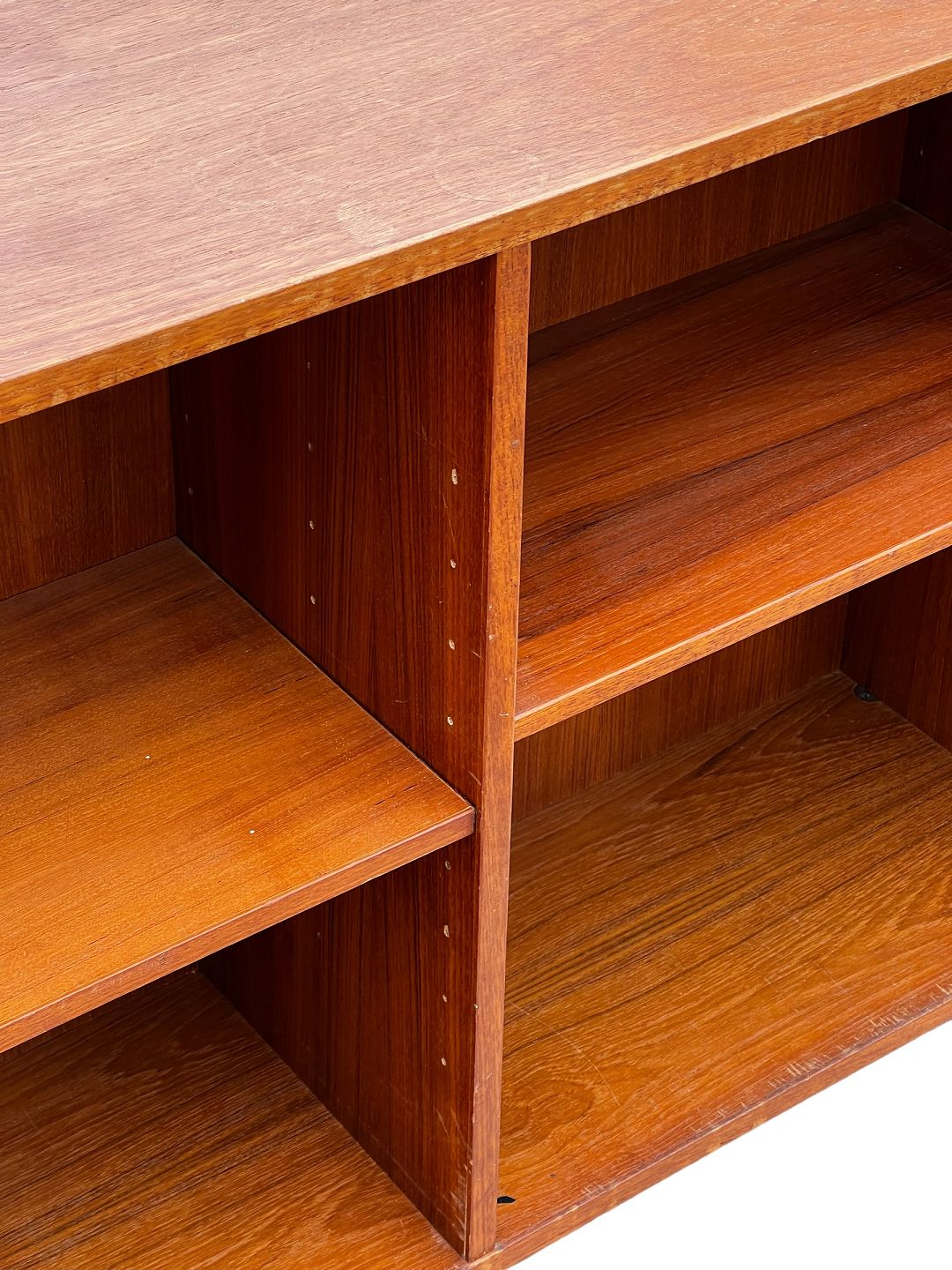 Get an authentic piece of Danish design history with this elegant teak wood bookcase from around the 1960s. This bookcase has two shelves with metal legs and a further four teak shelves, providing ample storage space and a modern aesthetic. The Danish design from this era combines functionality with simplicity and elegance, and this bookcase is no exception.