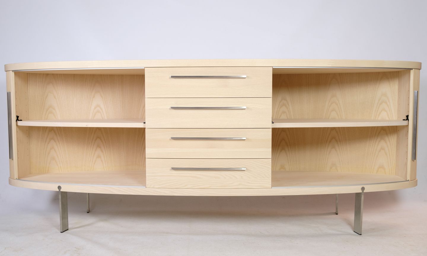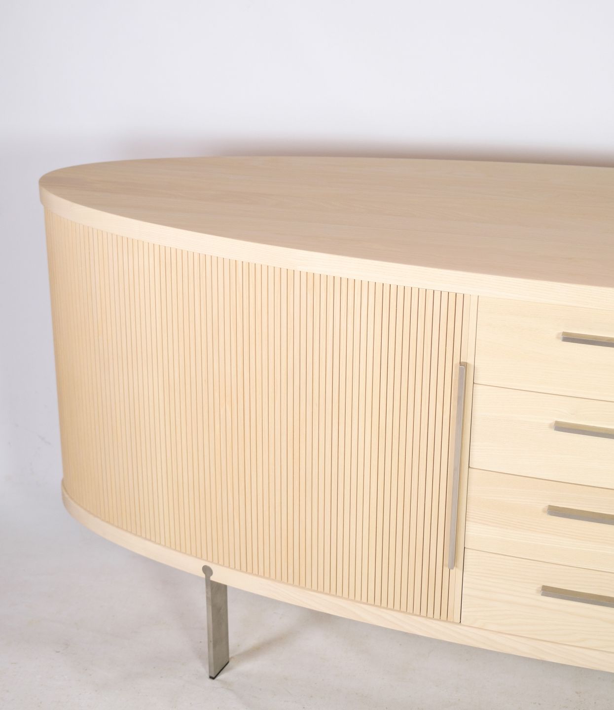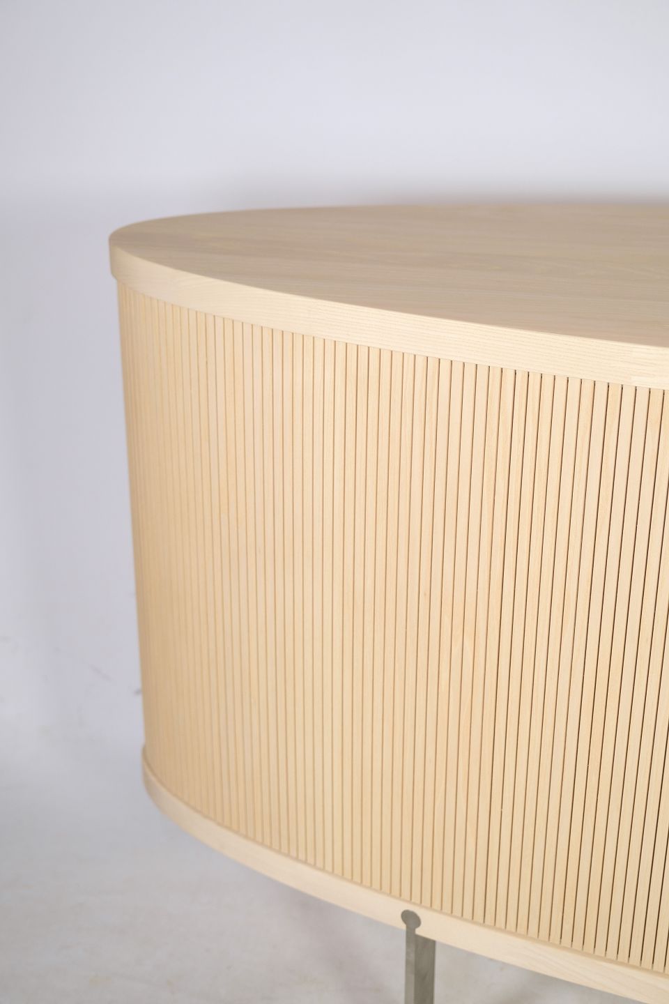 Sideboard in ash wood, model AK-1300, designed and manufactured by Naver Collection, a classic oval sideboard with shutter doors that has been given a modern twist. In like new condition with very few signs of use.