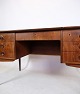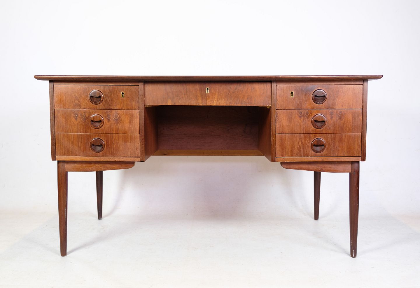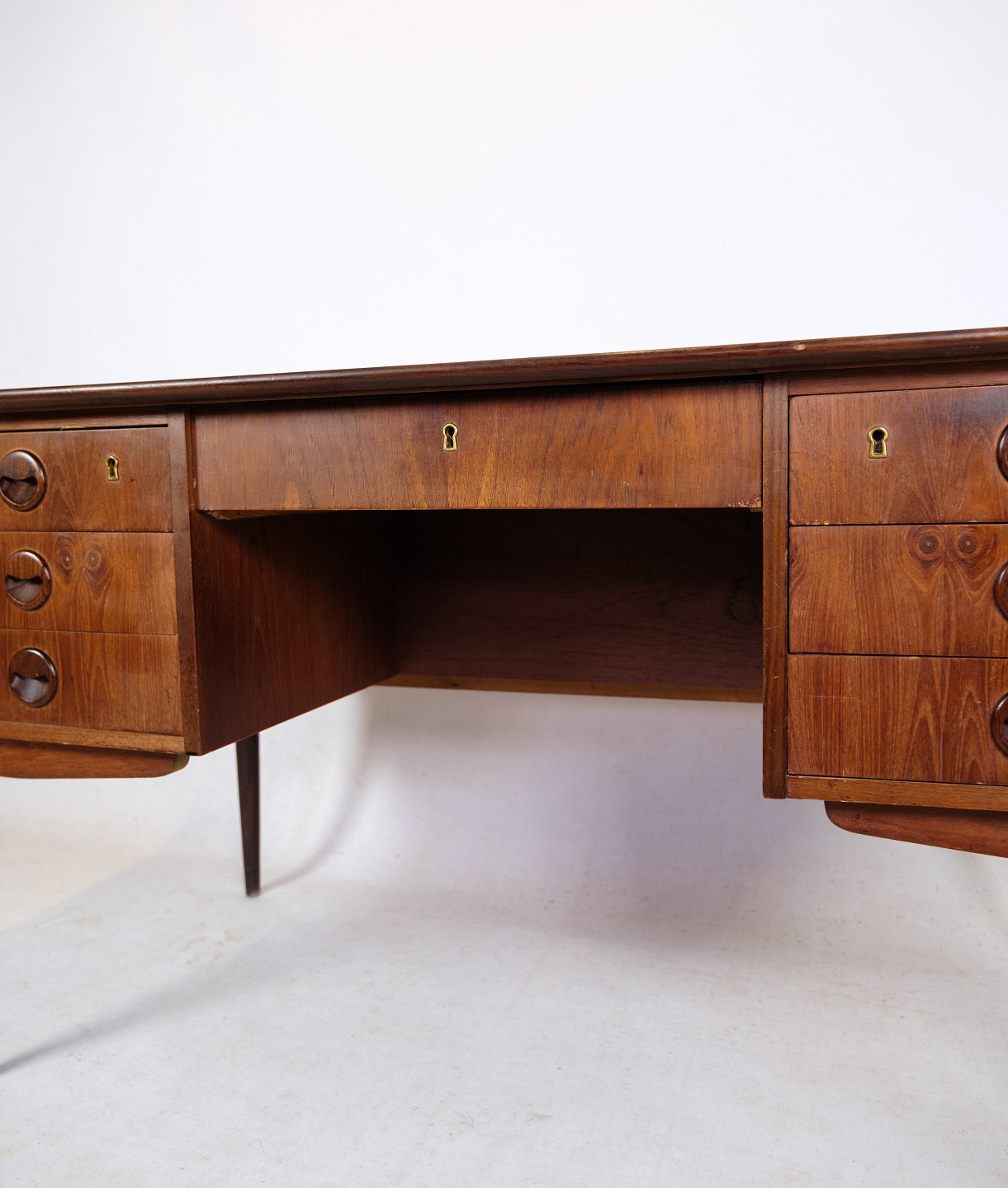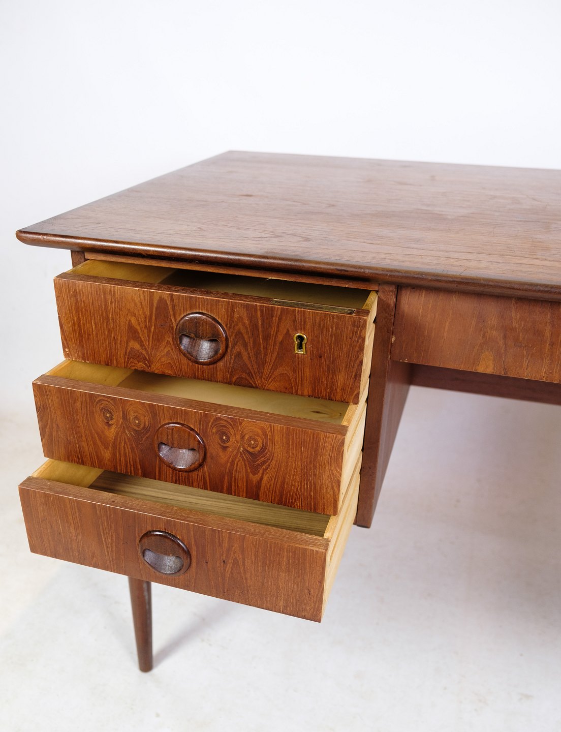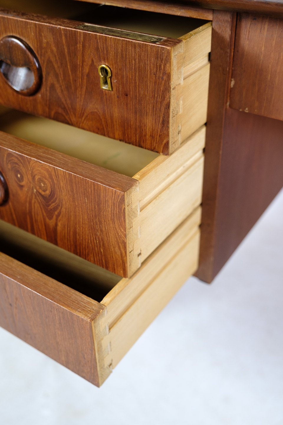 The desk has three spacious drawers on each side and an additional drawer in the middle, providing ample storage space for your office supplies and documents. The warm tone of the teak wood adds a natural beauty to the room, while the Danish design brings a timeless elegance.